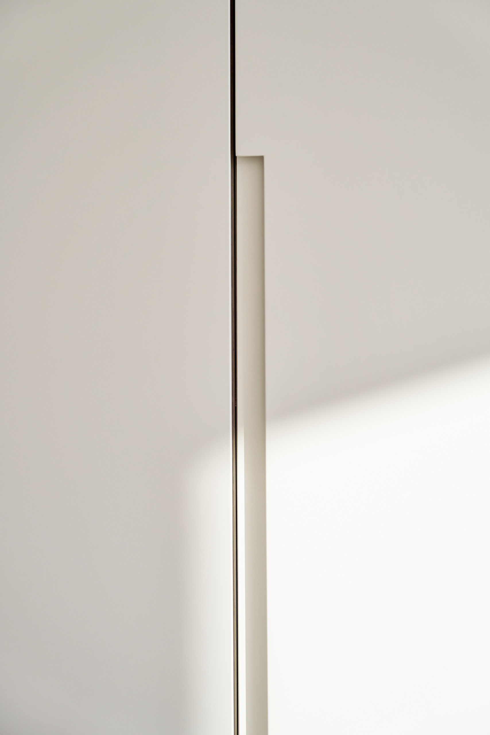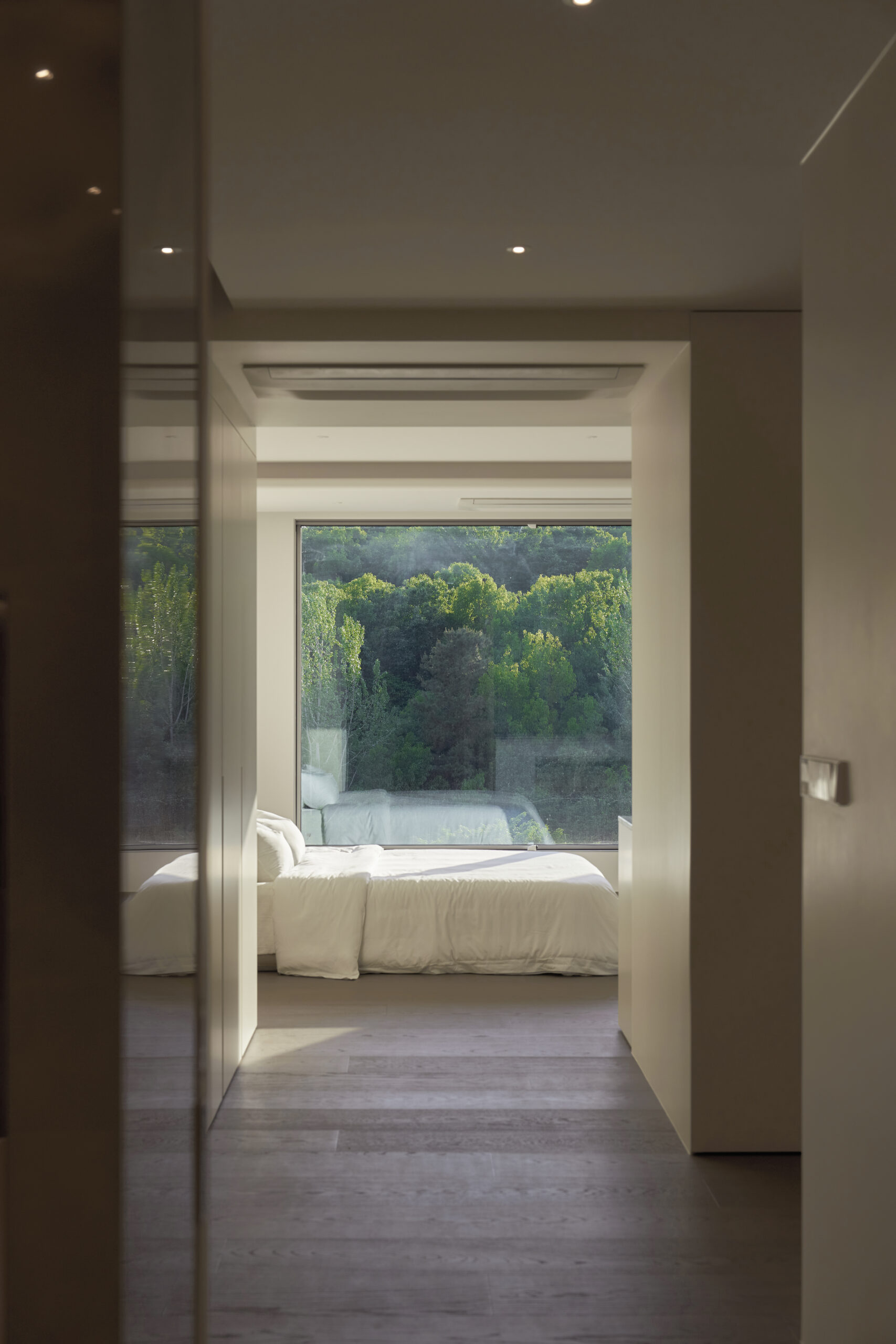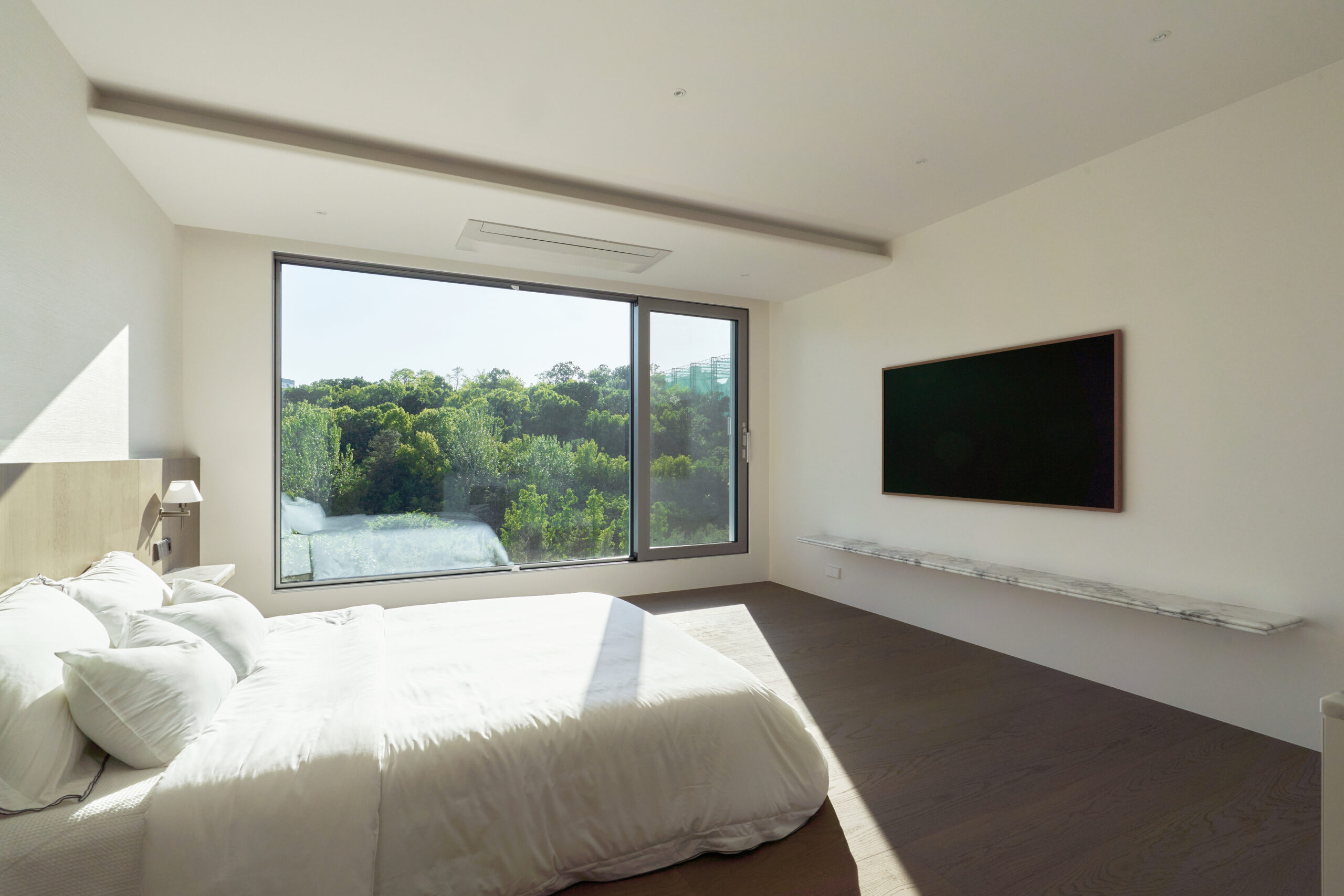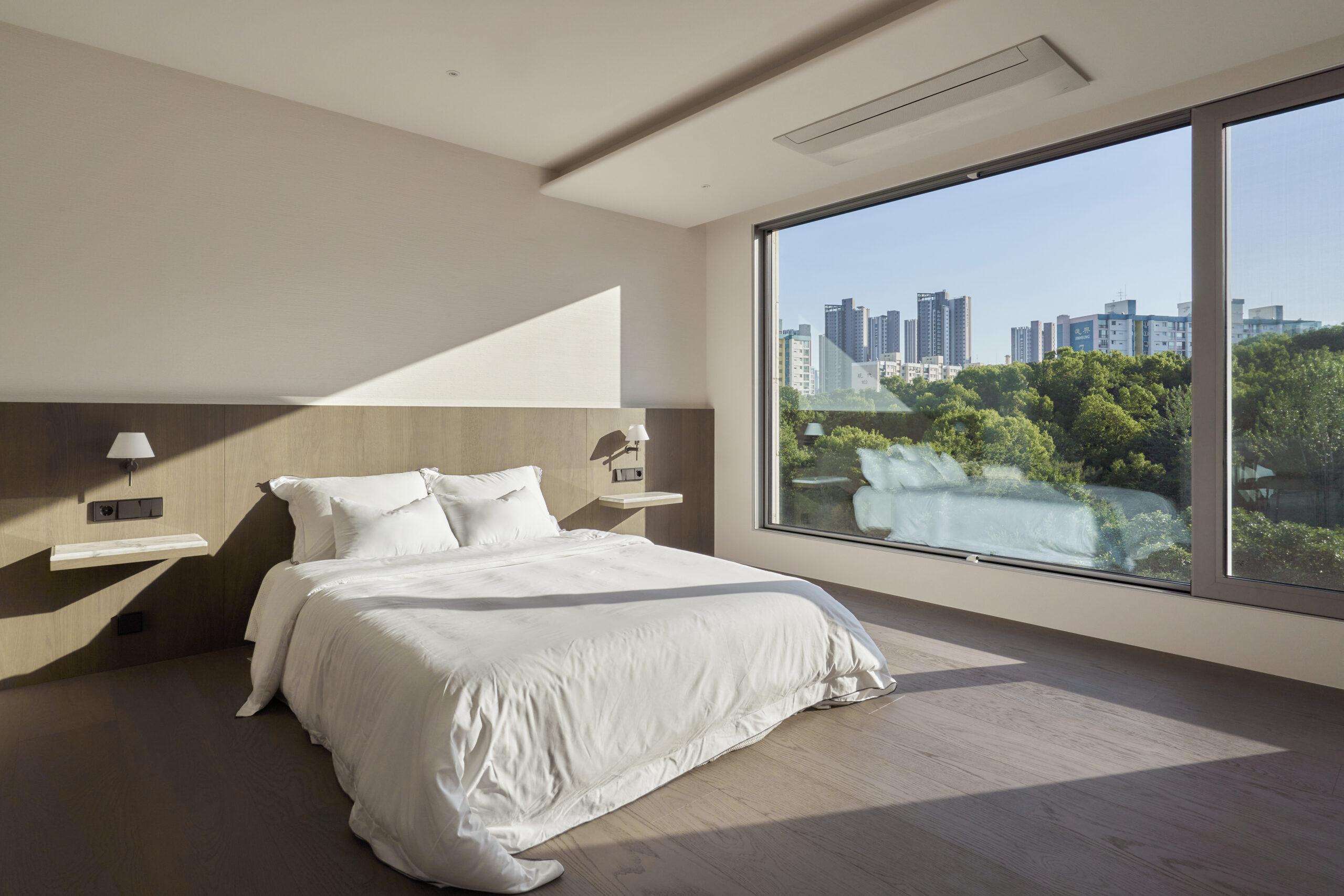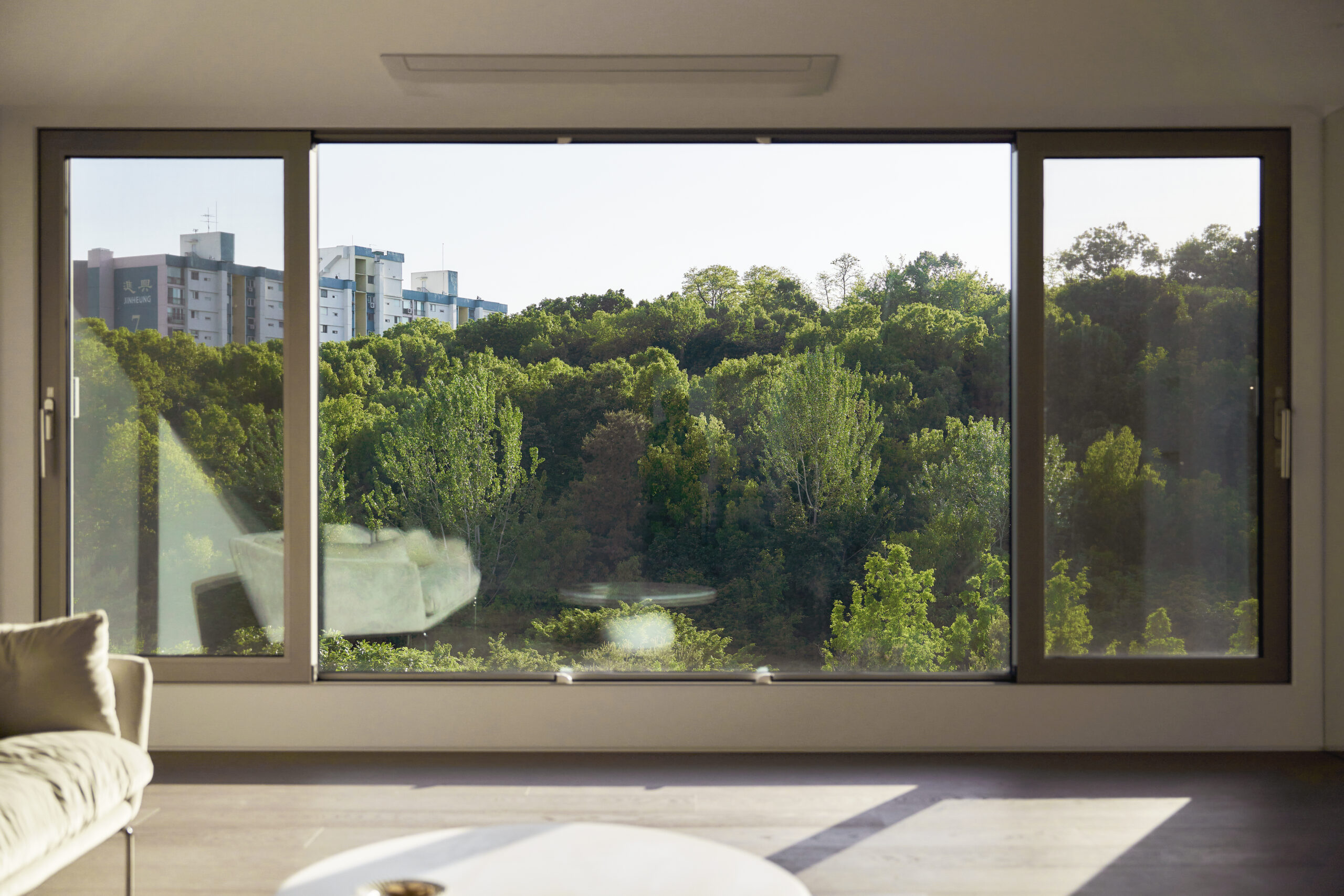 창의 컬러는 밤보다 낮에 차경이 더 아름다운 거주환경에 맞게 실버 컬러를 배치하여 낮에 창 프레임과 숲의 뷰가 한 덩어리로 보여질 수 있도록 했습니다.