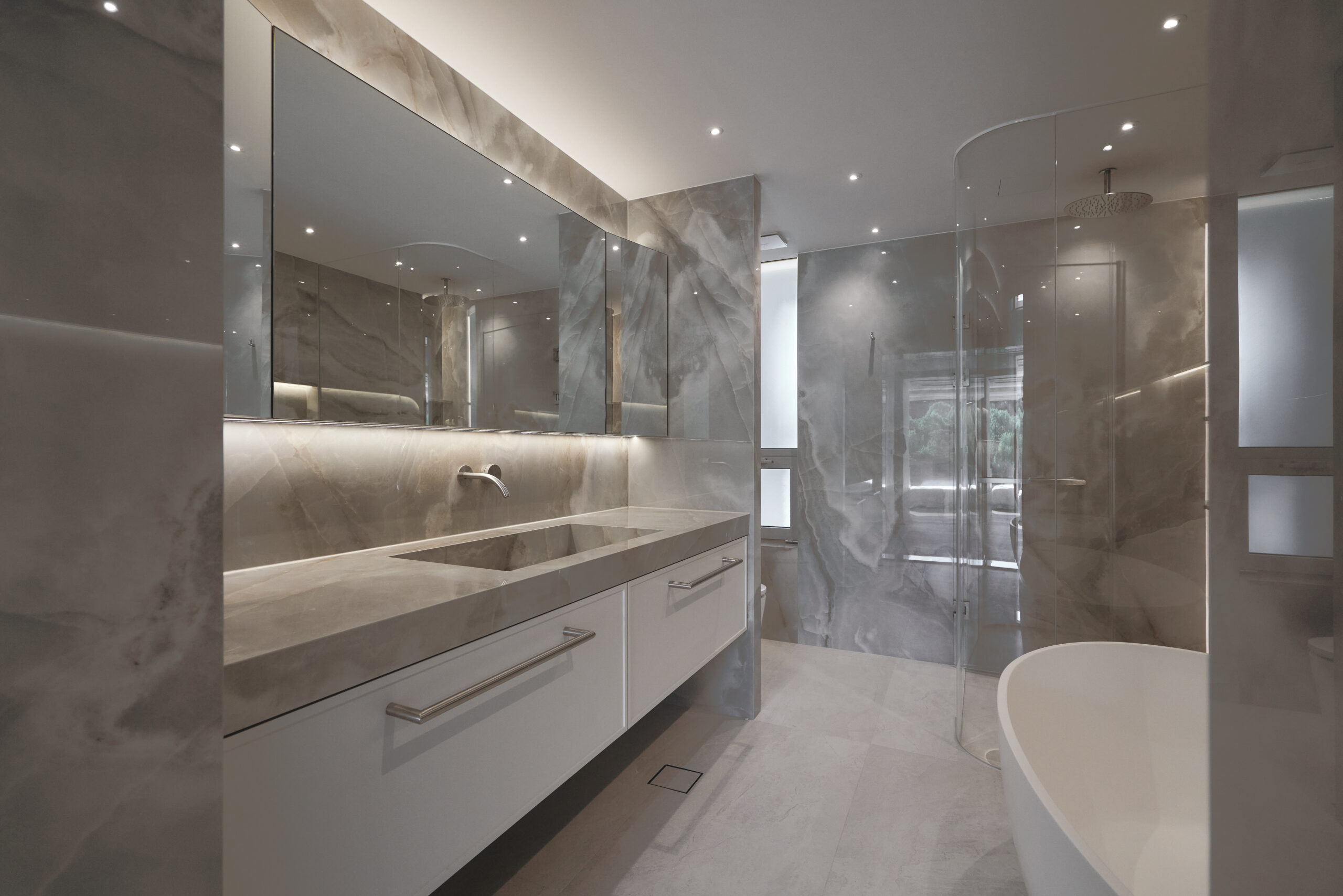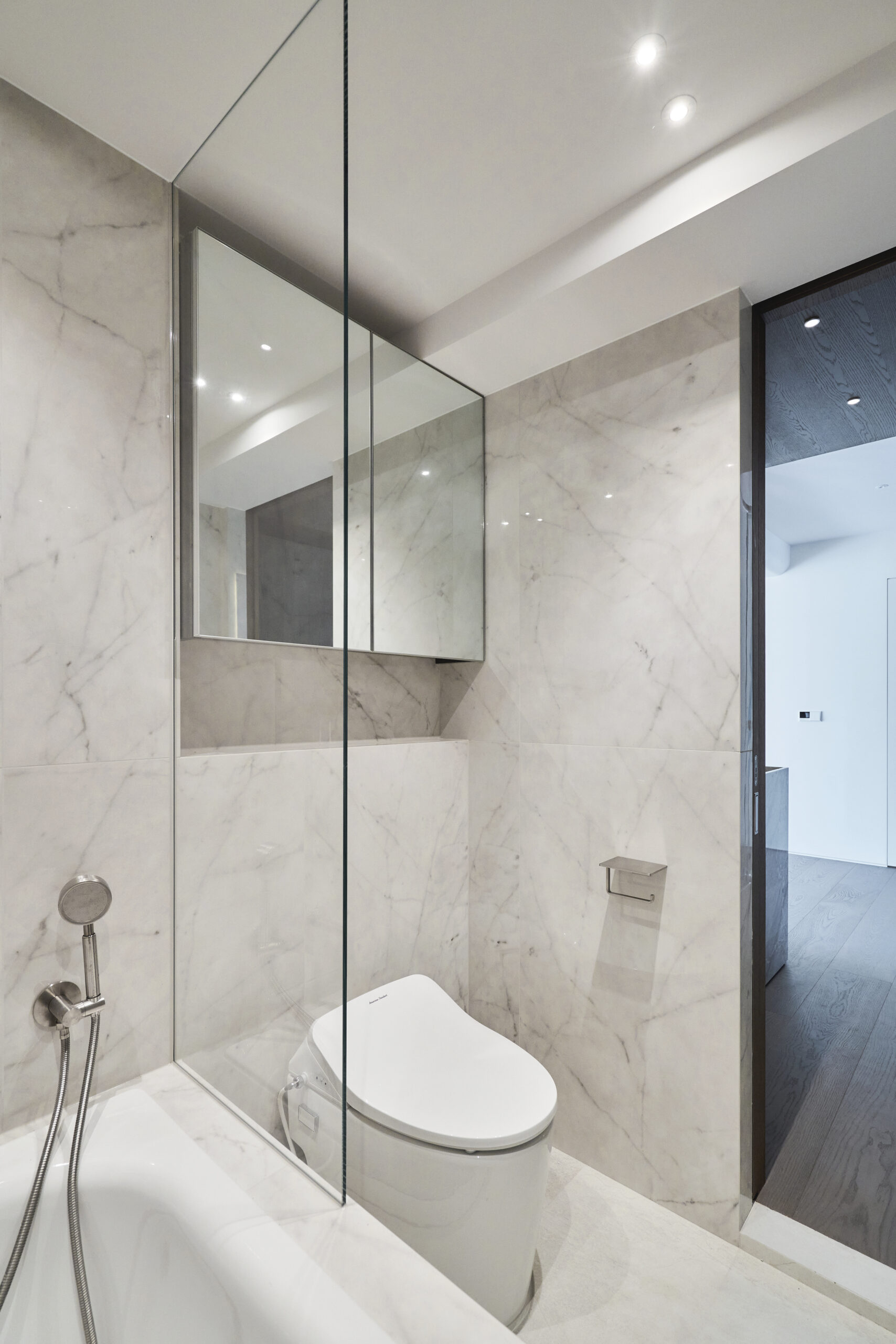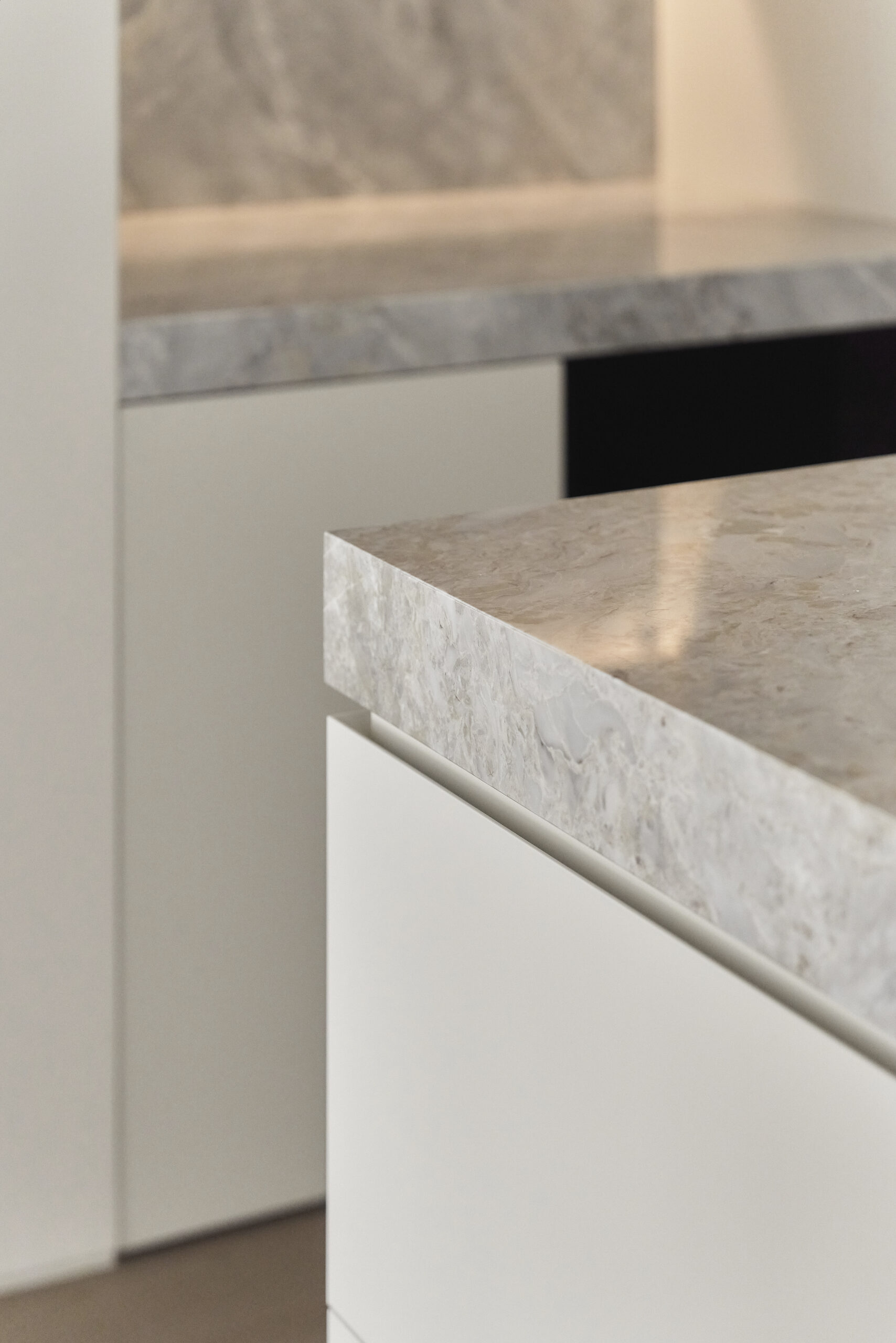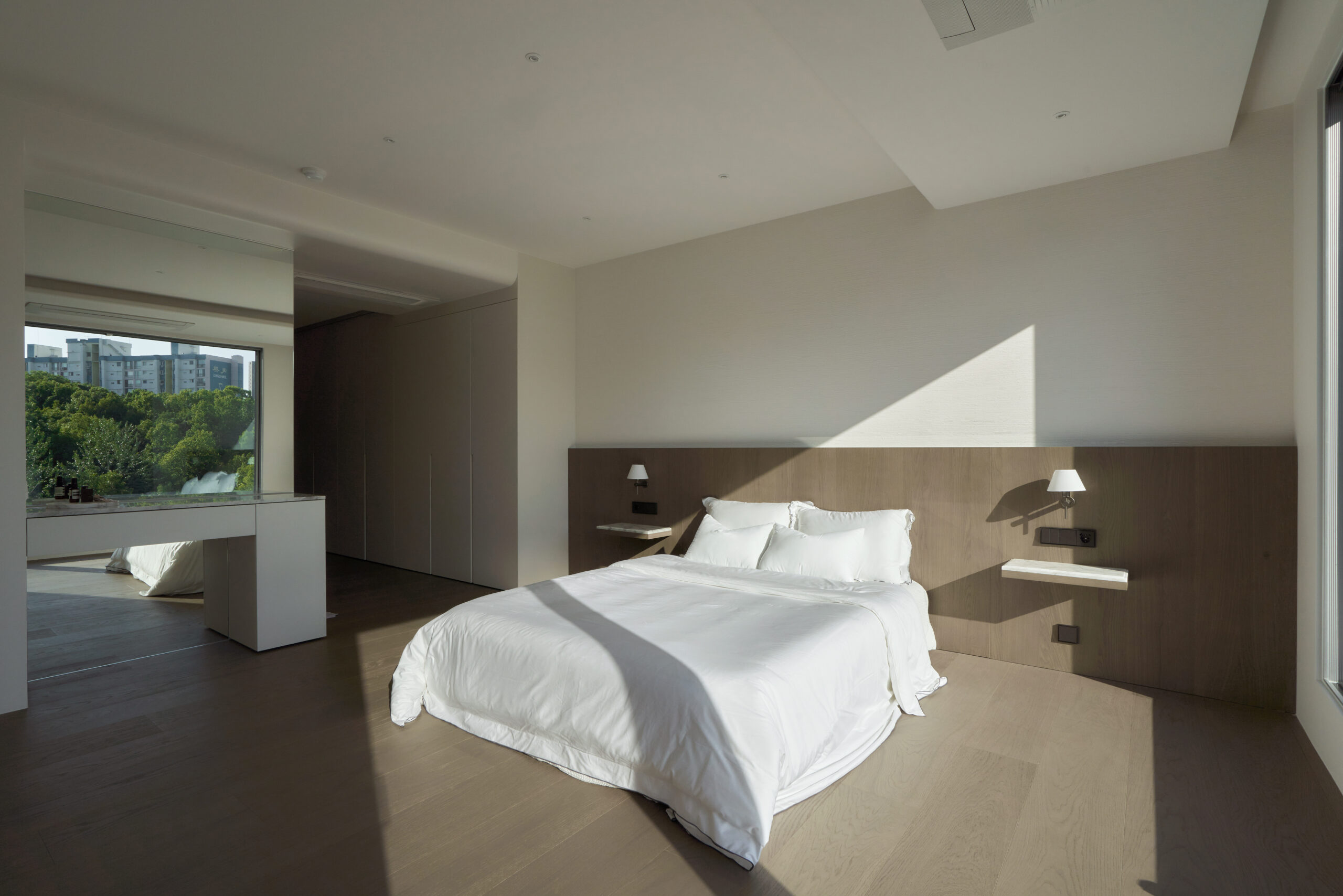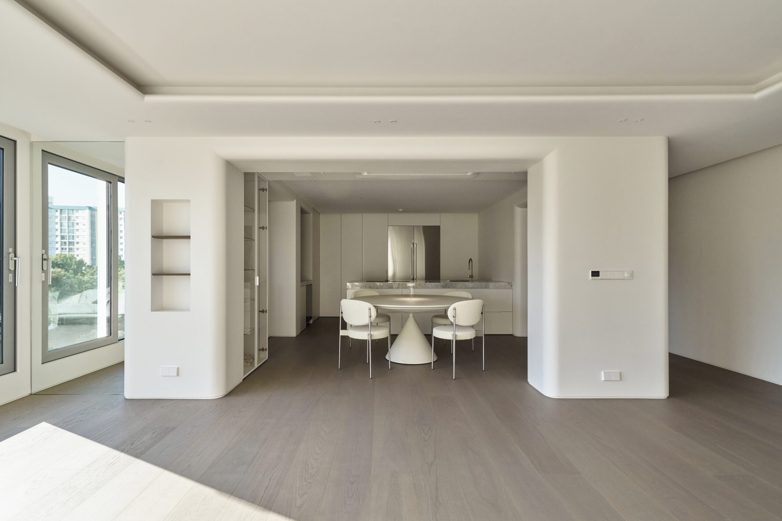 특히 거실과 안방에서 펼처지는 숲뷰와 조화를 이루기 위해 내부에도 무늬목과 원석 같은 천연 소재를 사용했습니다. 고유한 색감이 지닌 깊이를 그대로 살려 소재 자체의 아름다움이 공간 안에서 자연스럽게 존재감을 드러내도록 했습니다.