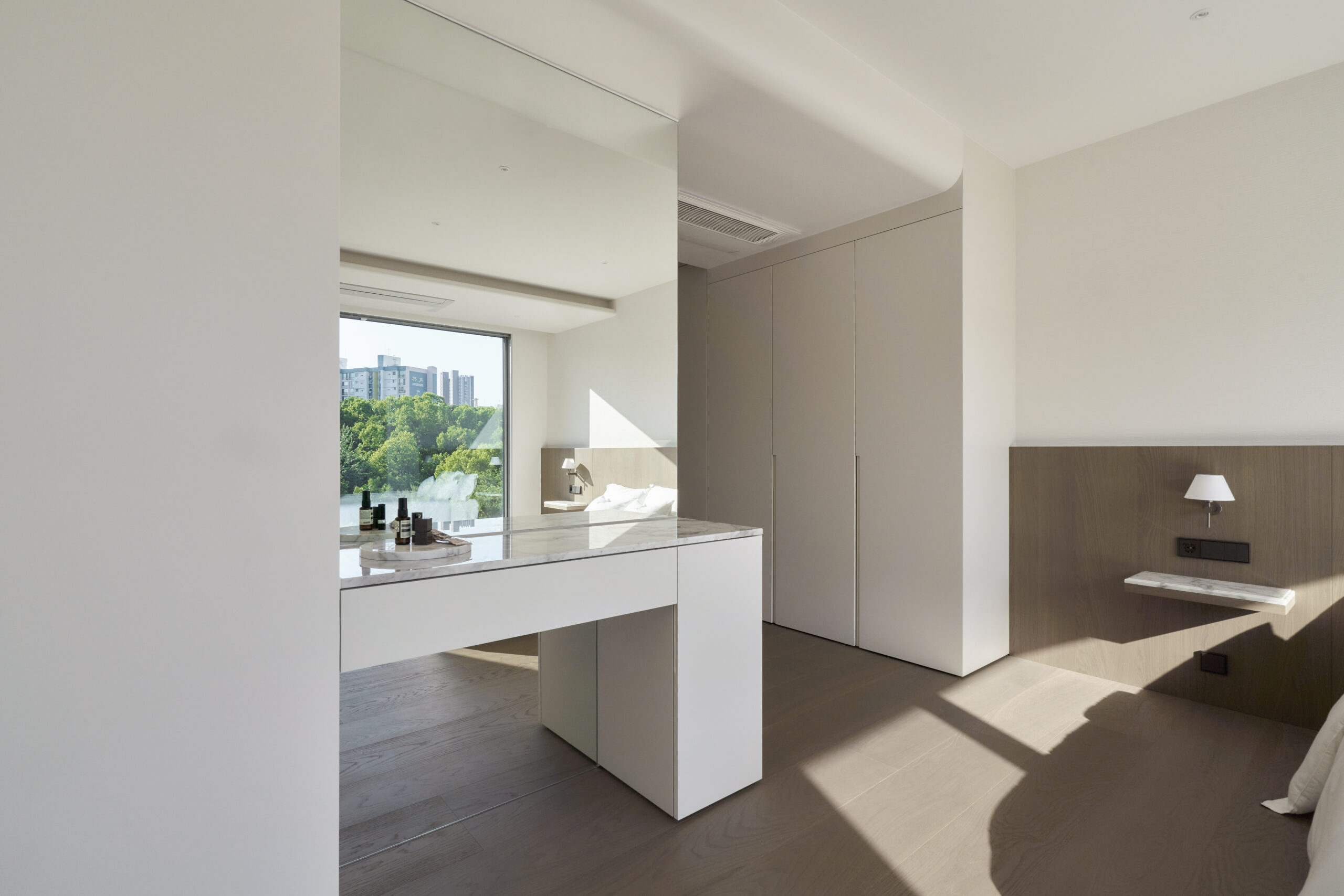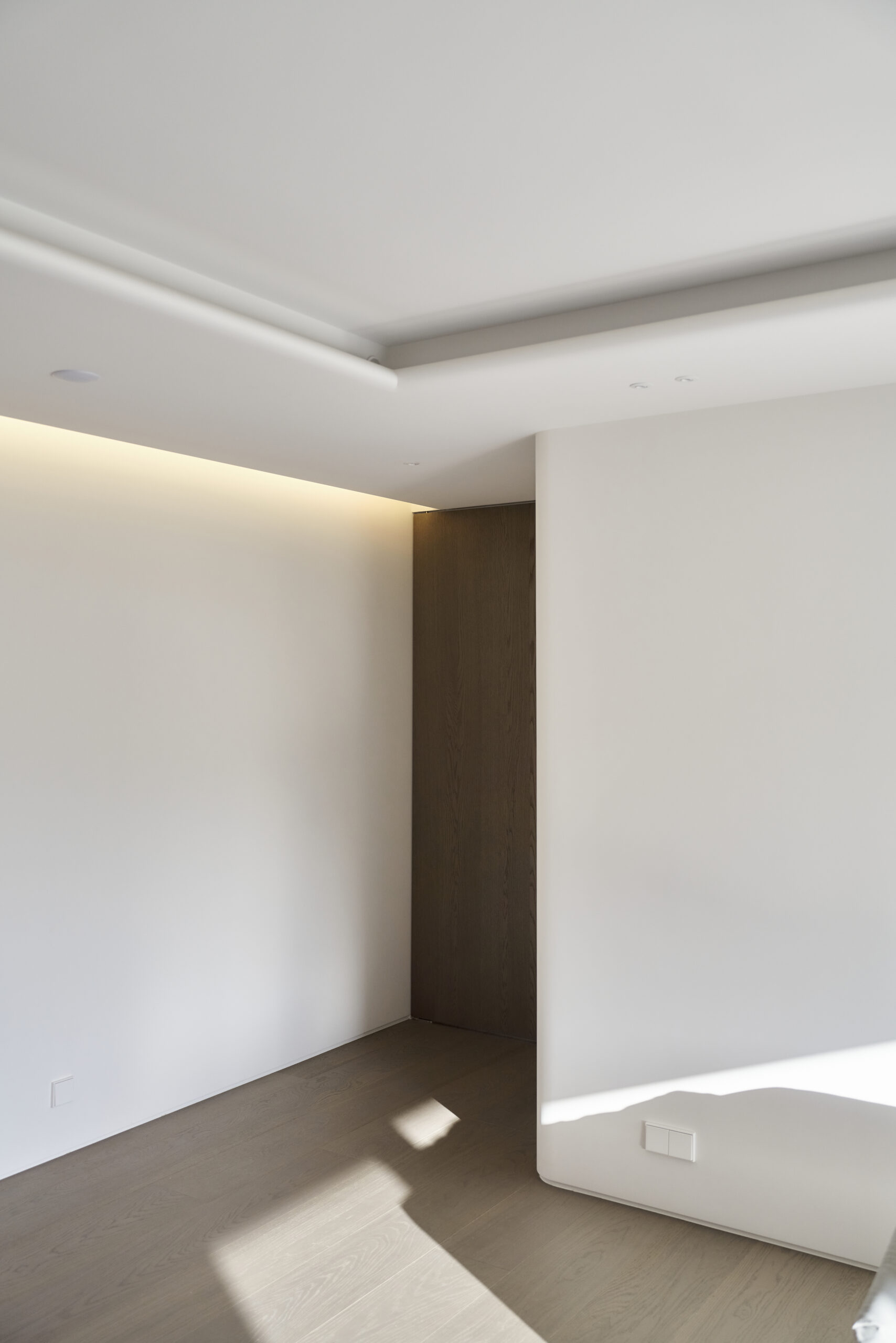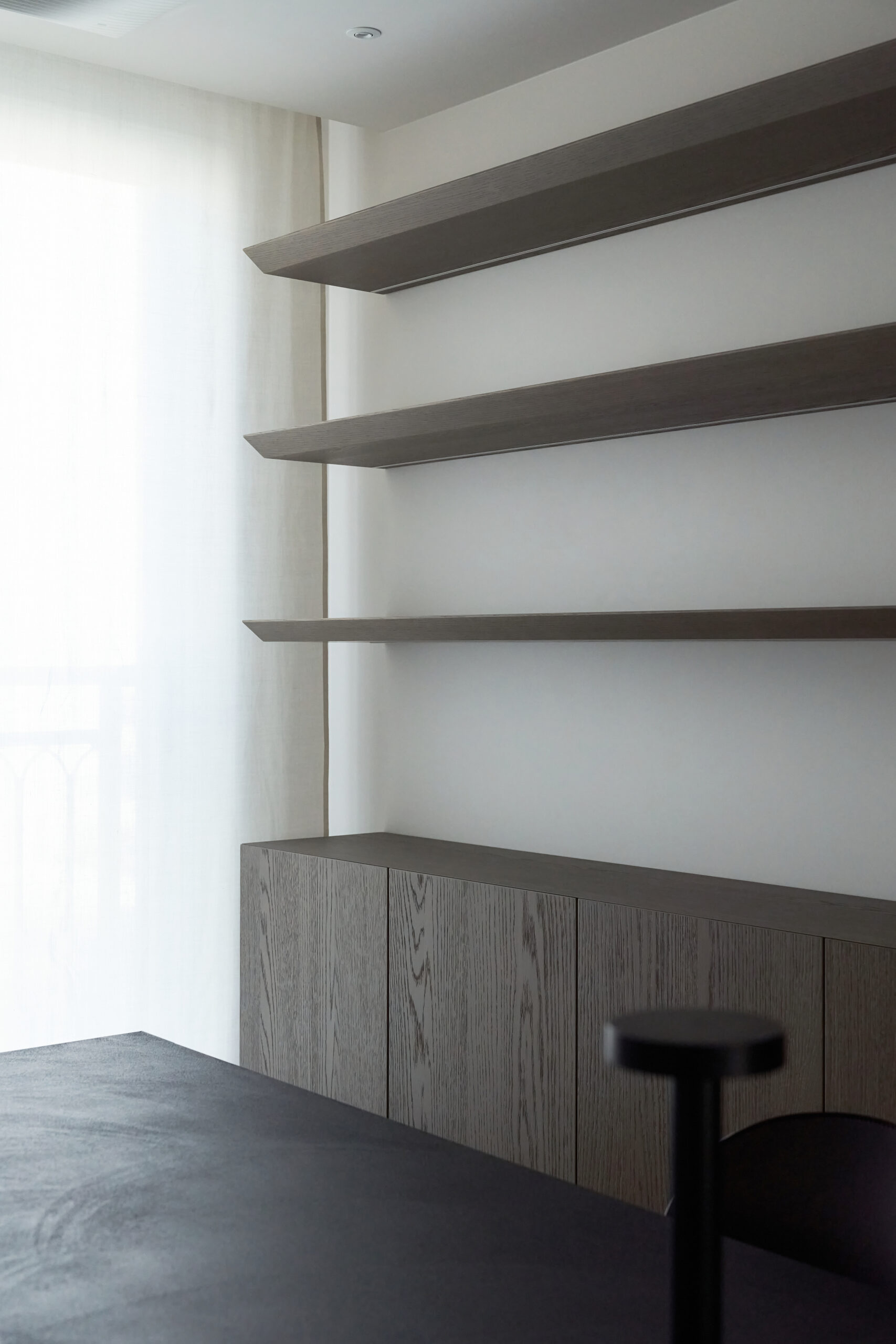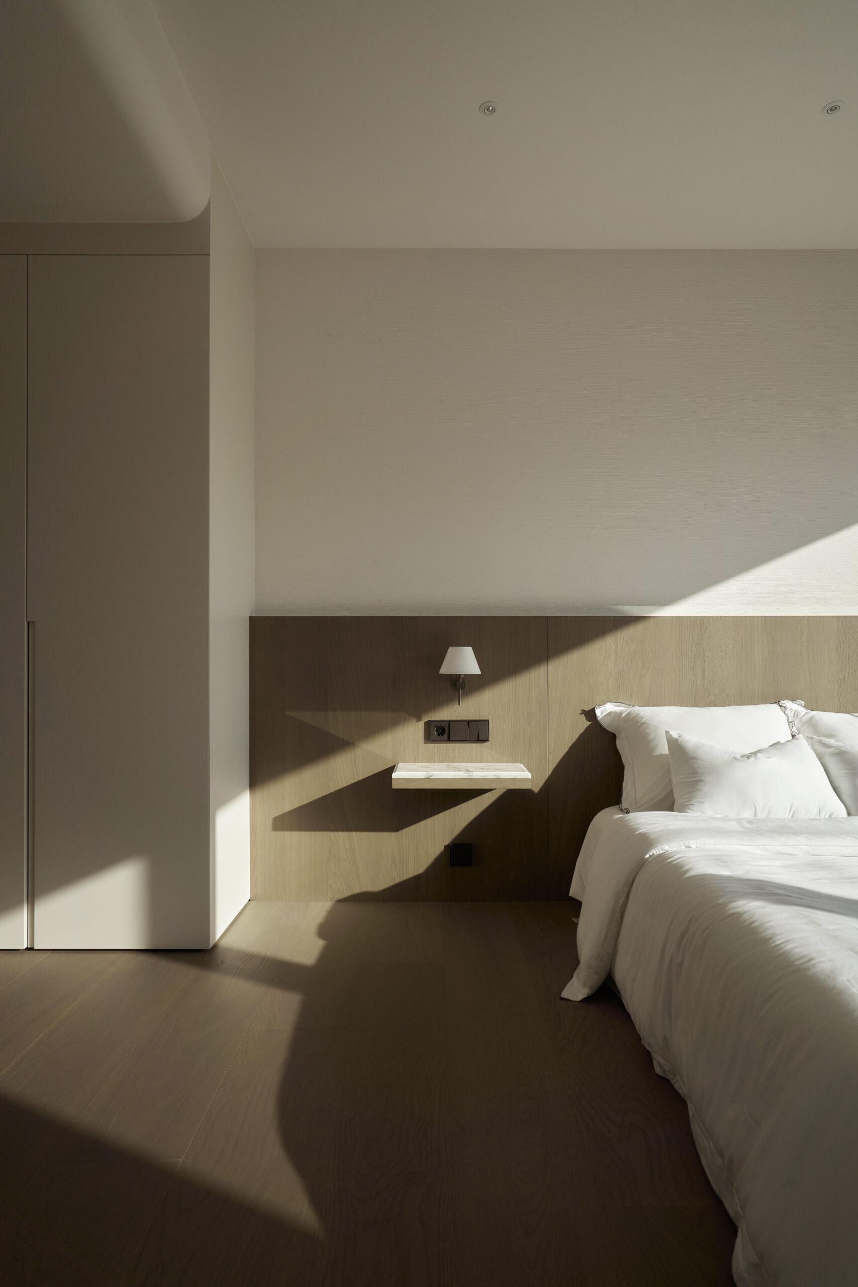 The space is defined by calm materials and a family-centered layout, using washed walnut flooring, soft finishes, and natural materials to harmonize with the forest view. Thoughtful zoning and integrated storage create a relaxed flow and a unified, serene living environment.