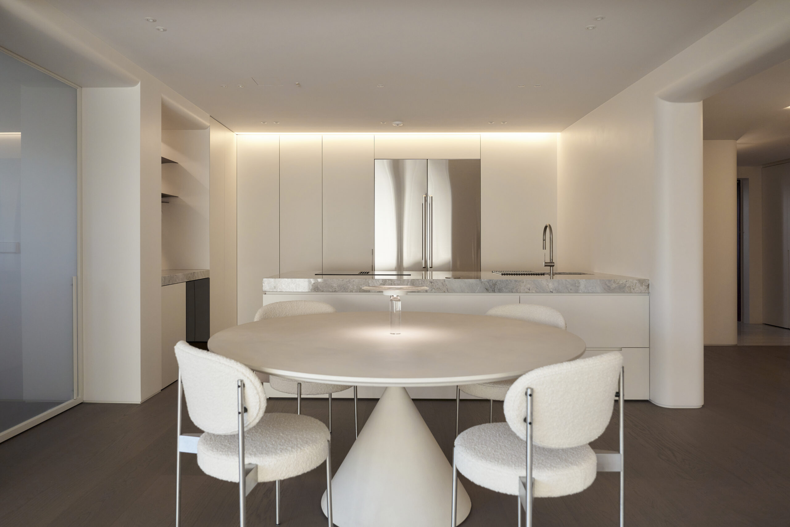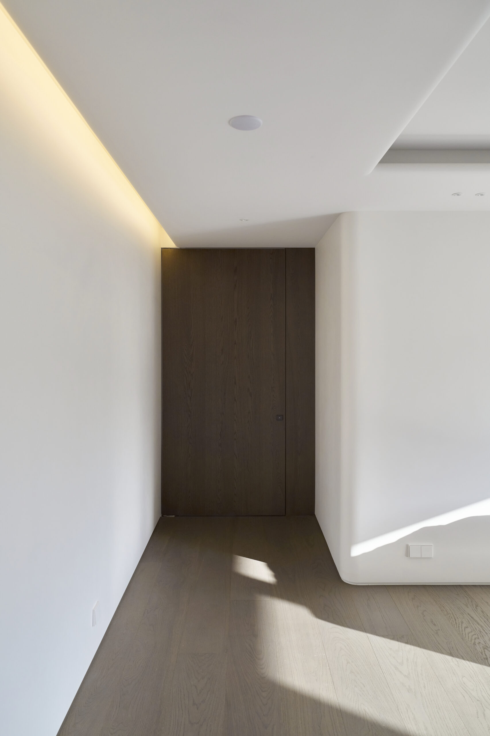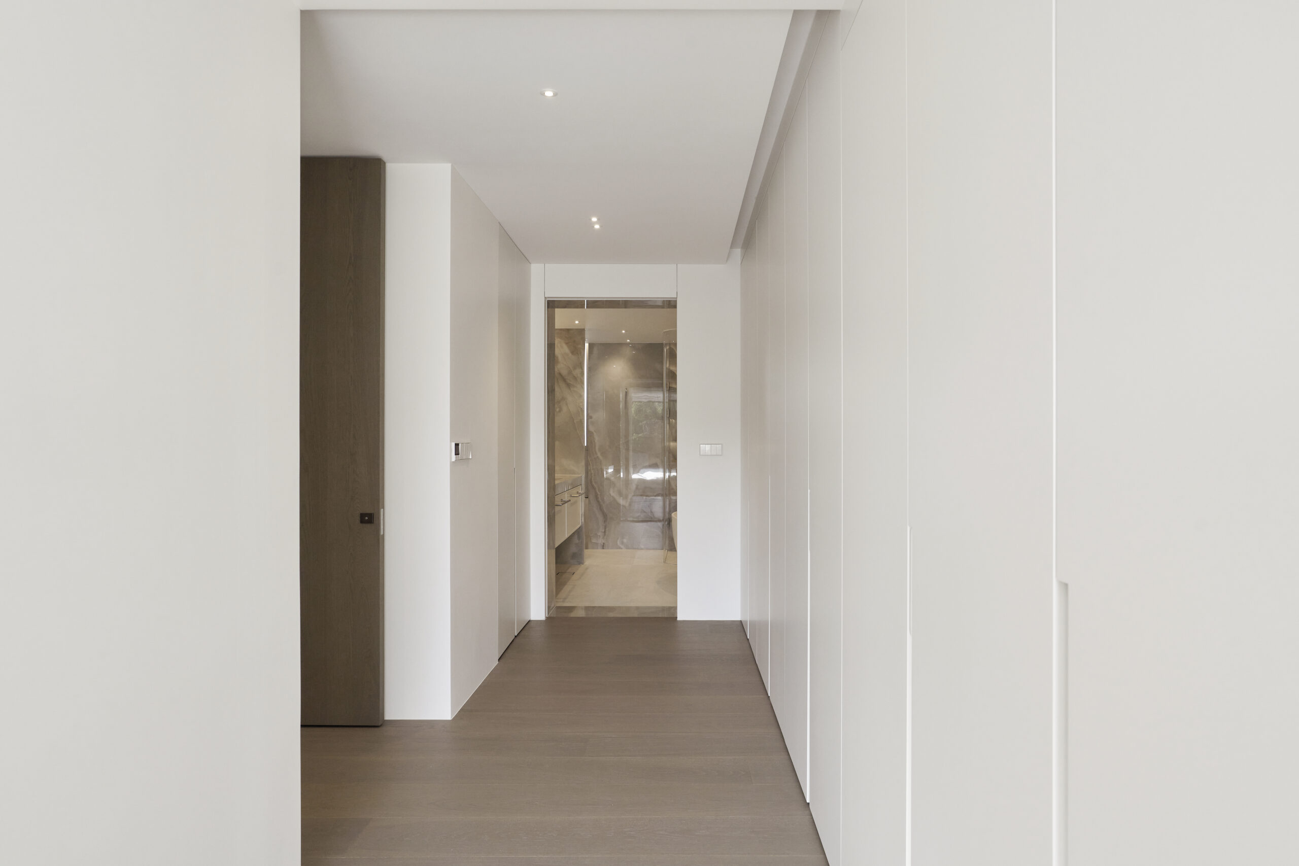 The space is defined by calm materials and a family-centered layout, using washed walnut flooring, soft finishes, and natural materials to harmonize with the forest view. Thoughtful zoning and integrated storage create a relaxed flow and a unified, serene living environment.