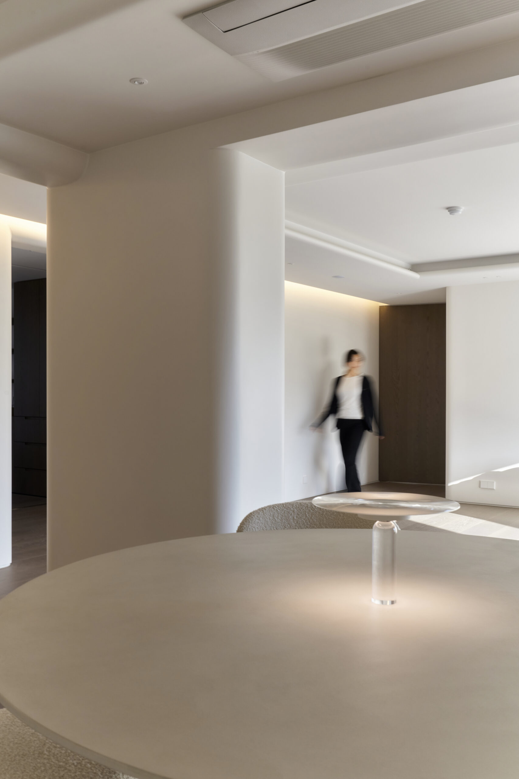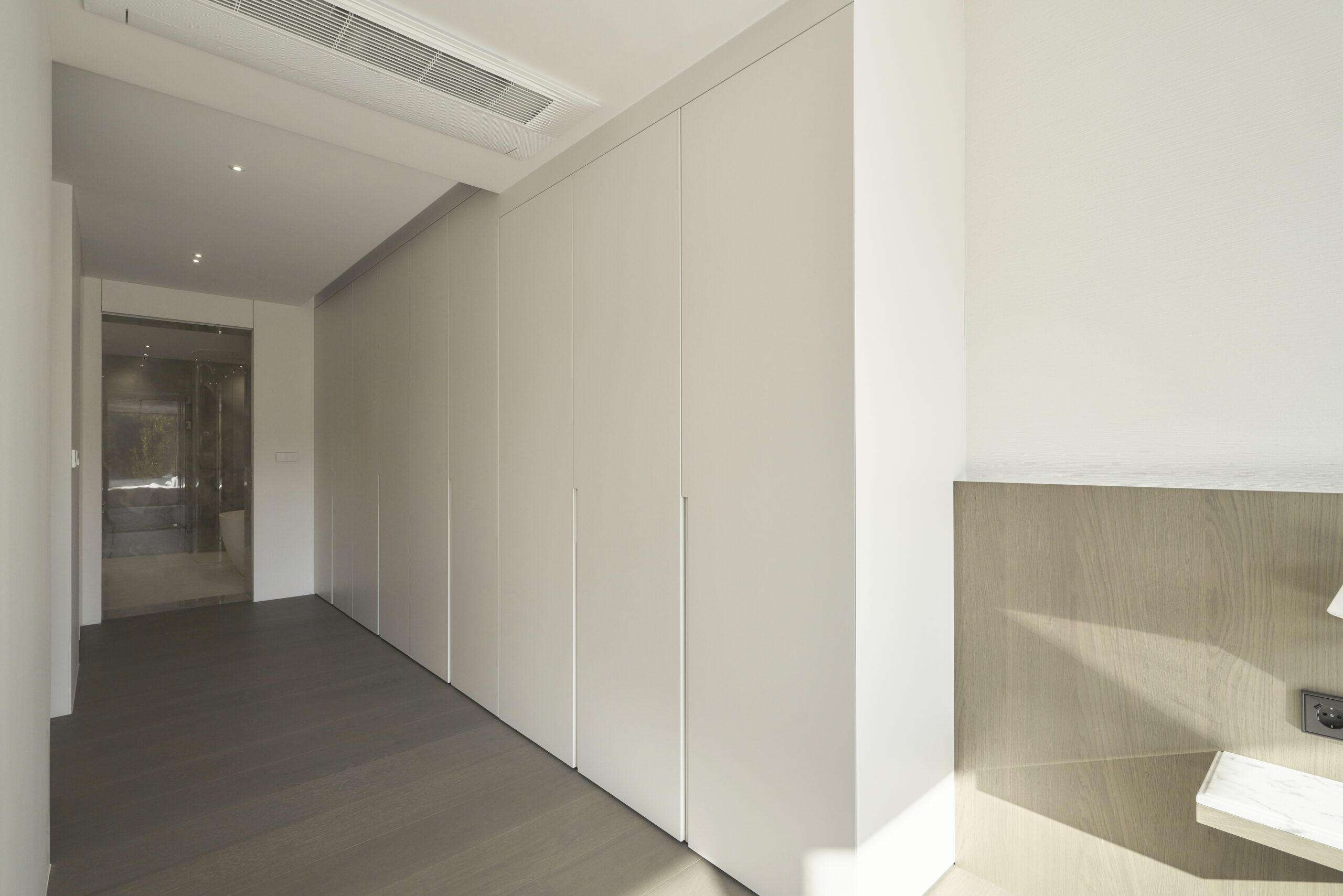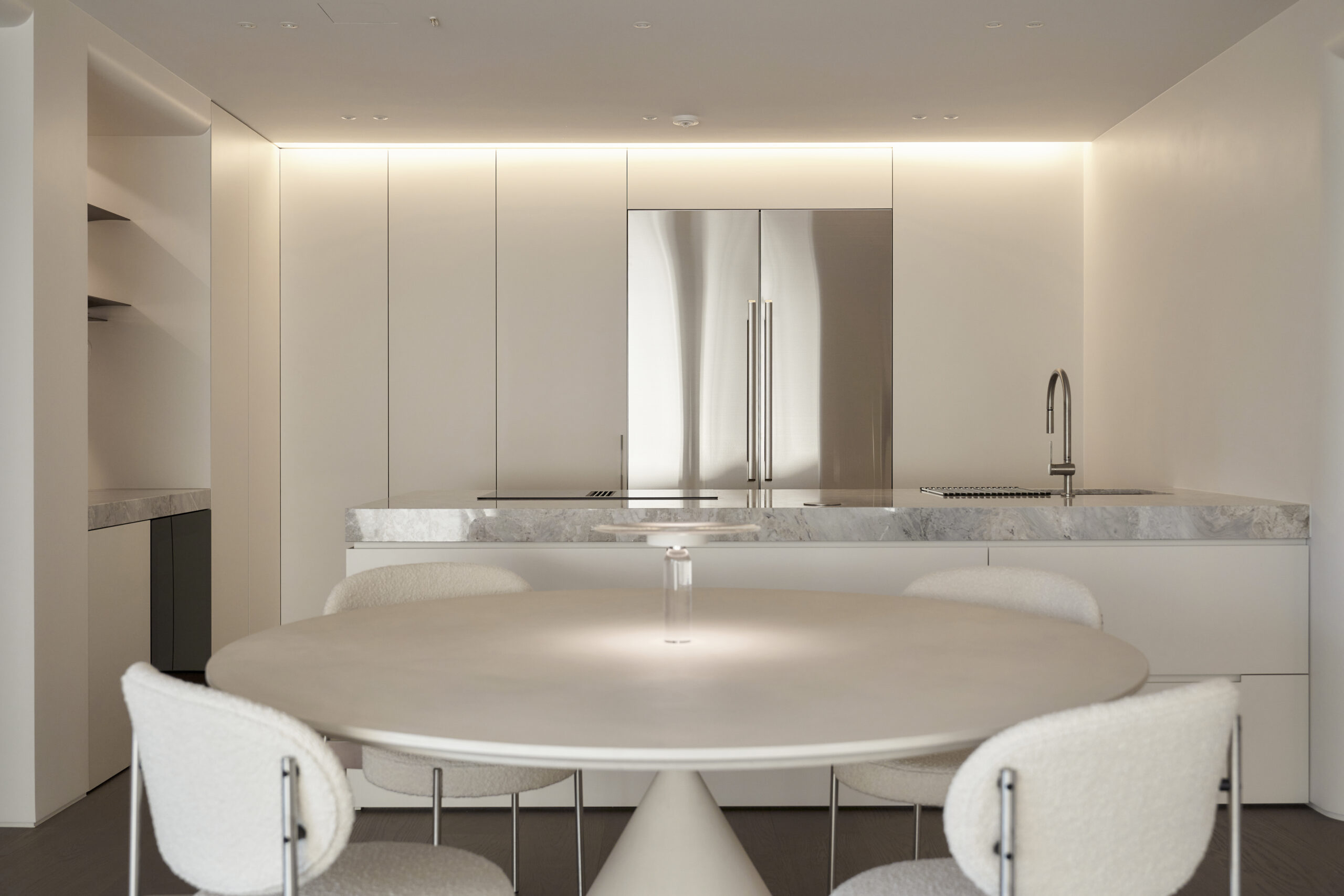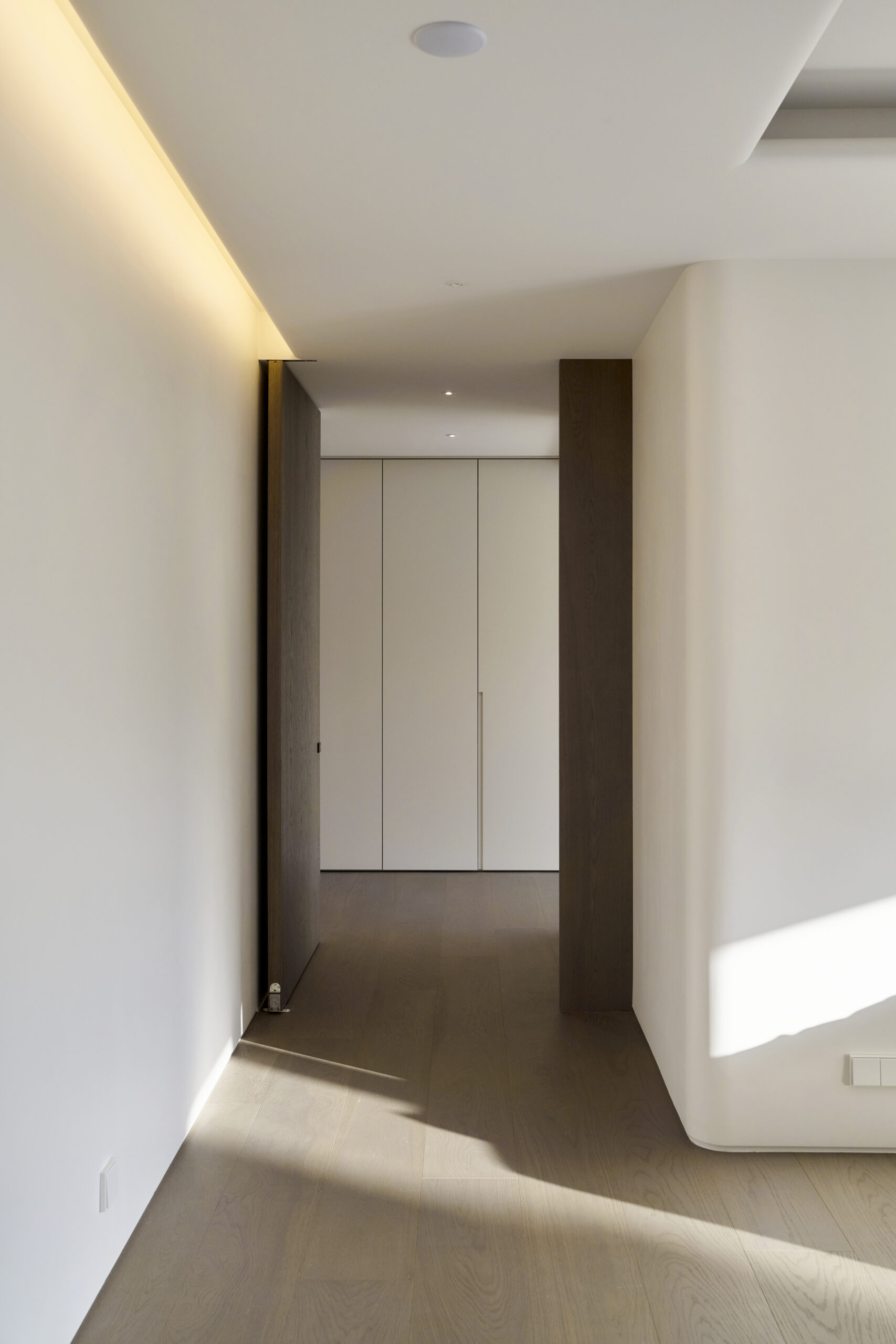 The space is defined by calm materials and a family-centered layout, using washed walnut flooring, soft finishes, and natural materials to harmonize with the forest view. Thoughtful zoning and integrated storage create a relaxed flow and a unified, serene living environment.