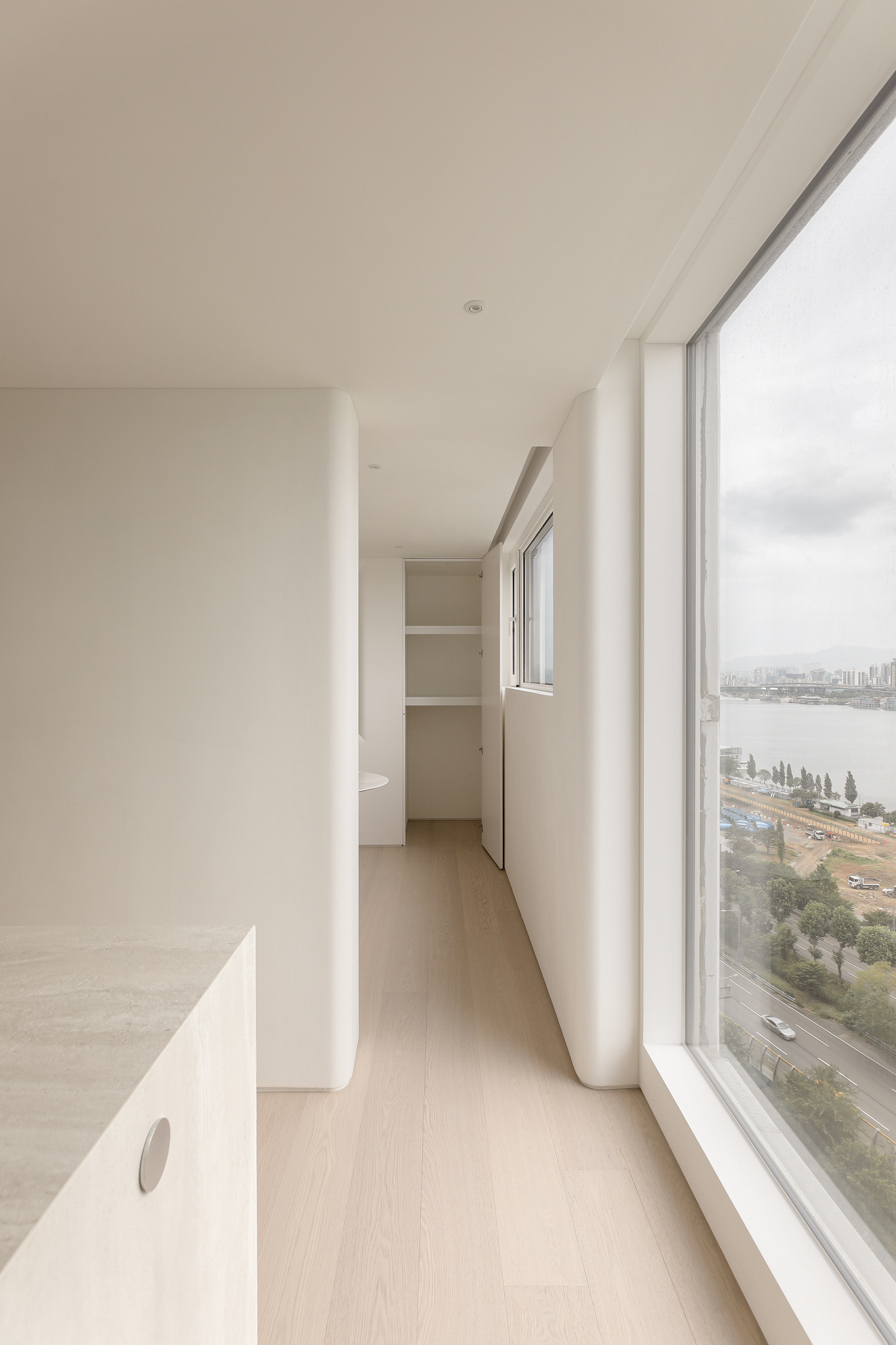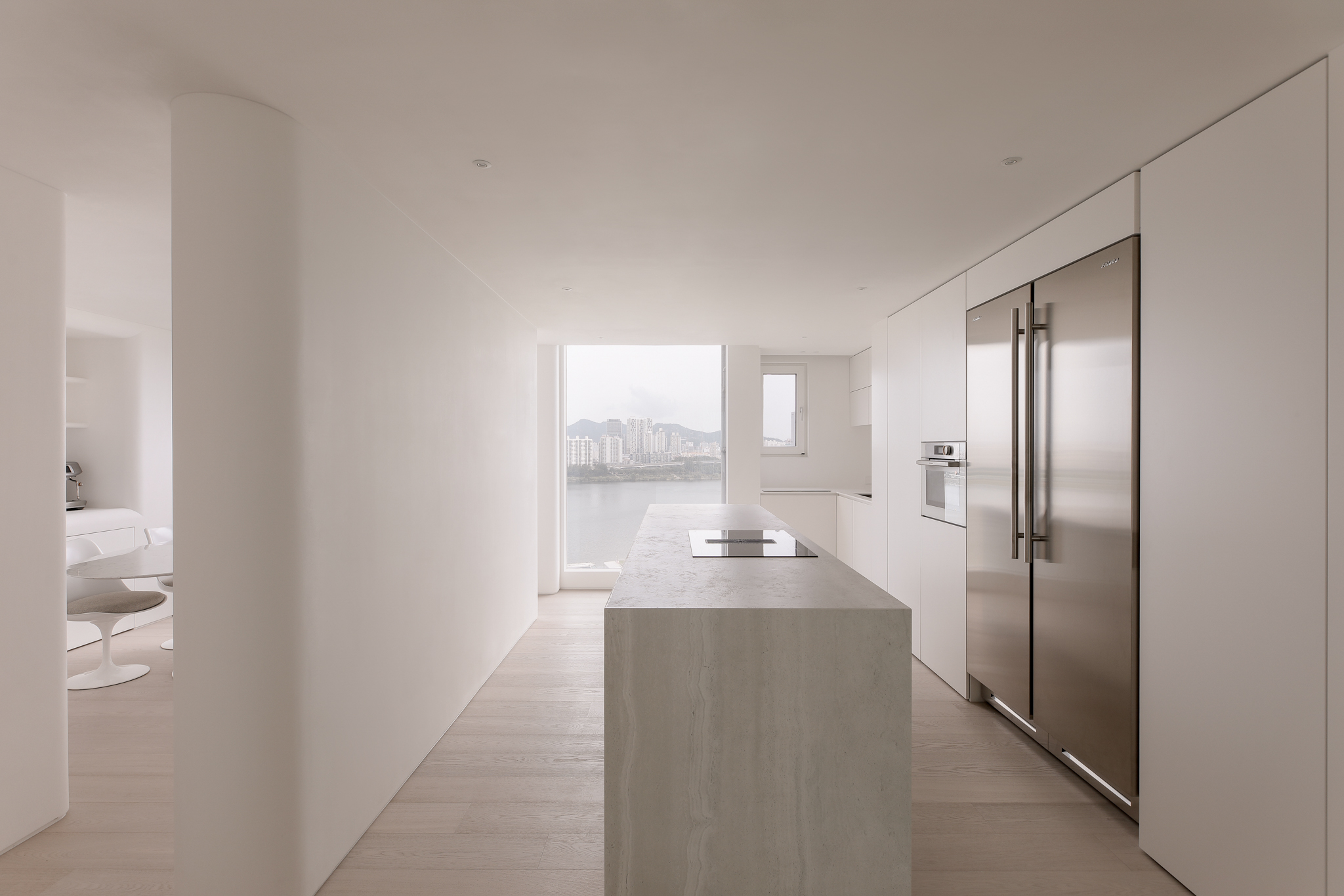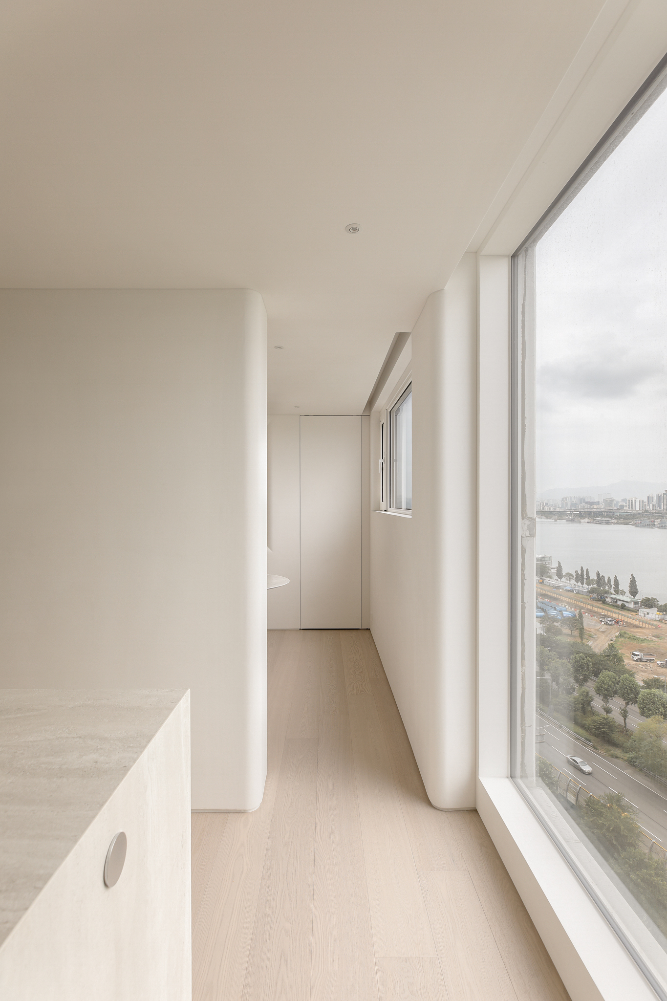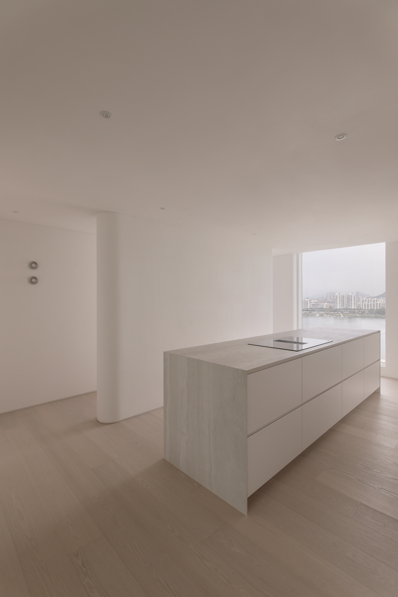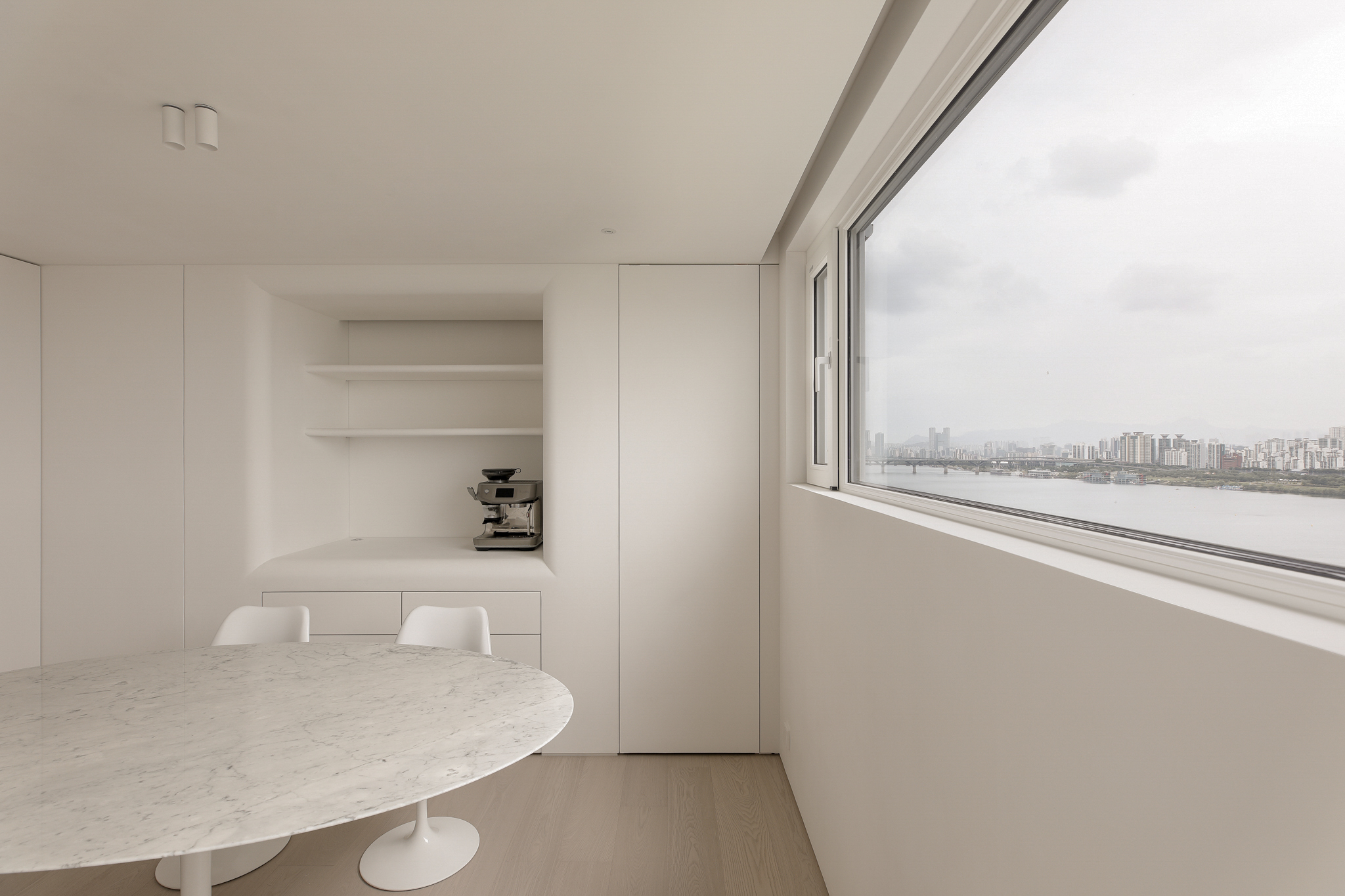 This project blends work and rest by reflecting the client’s lifestyle, opening key spaces to maximize the Han River view and create fluid transitions. Sculptural lime plaster surfaces, system windows, and carefully scaled curves shape a cohesive, light-responsive interior, while the living room’s recessed TV and fireplace form a calm, welcoming retreat.