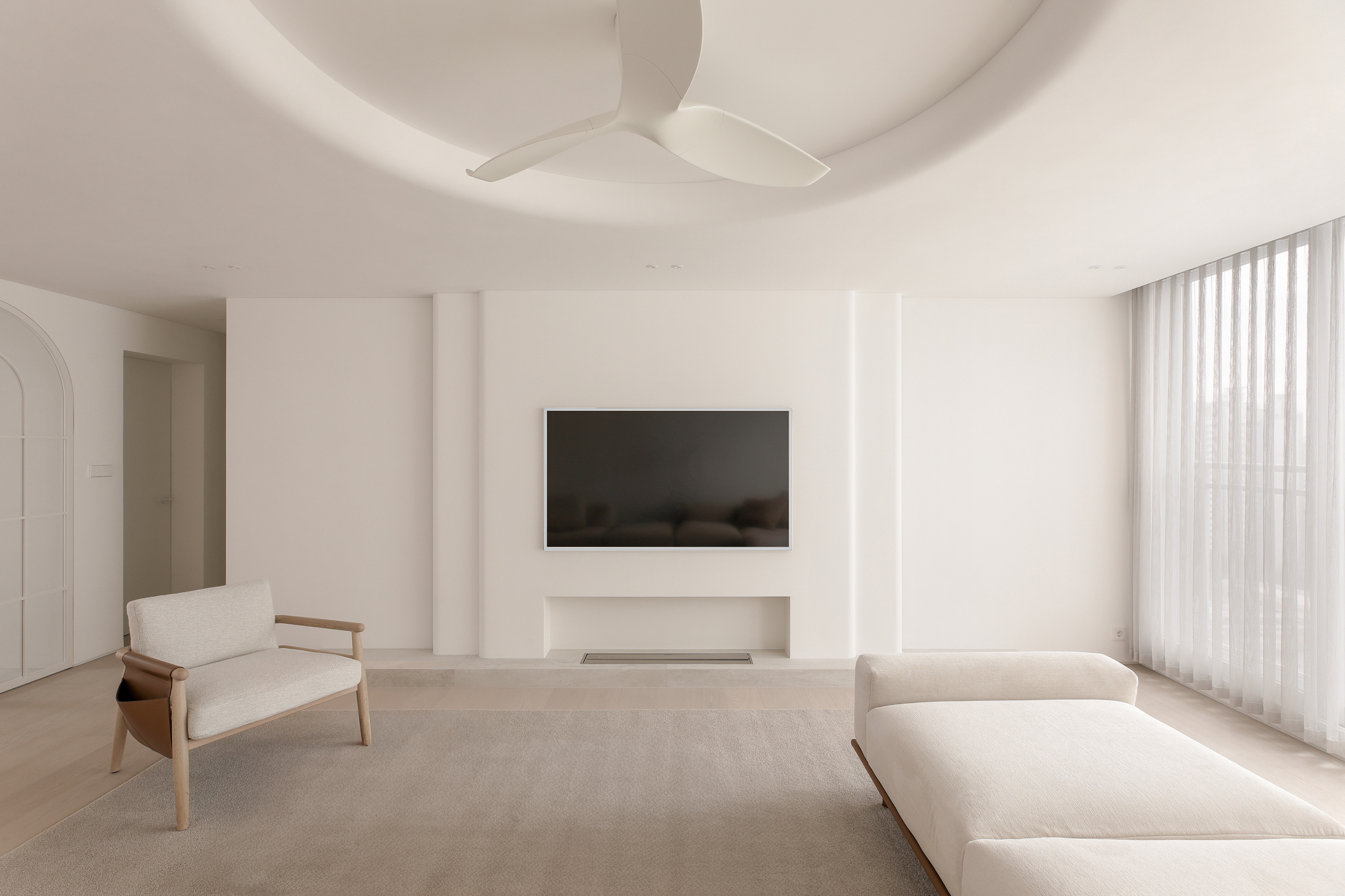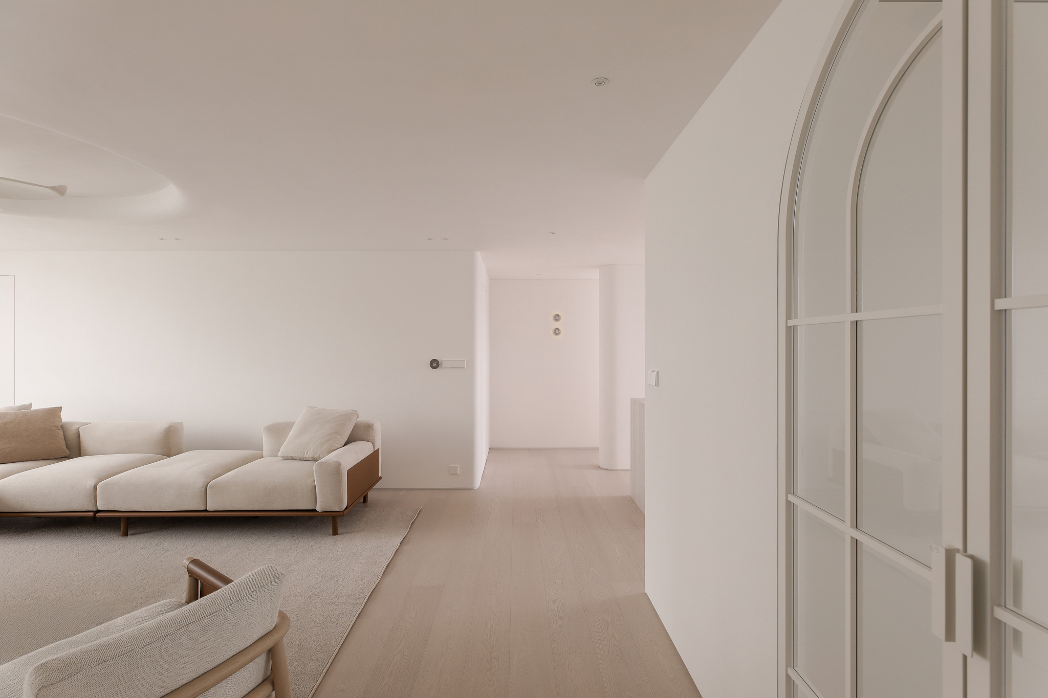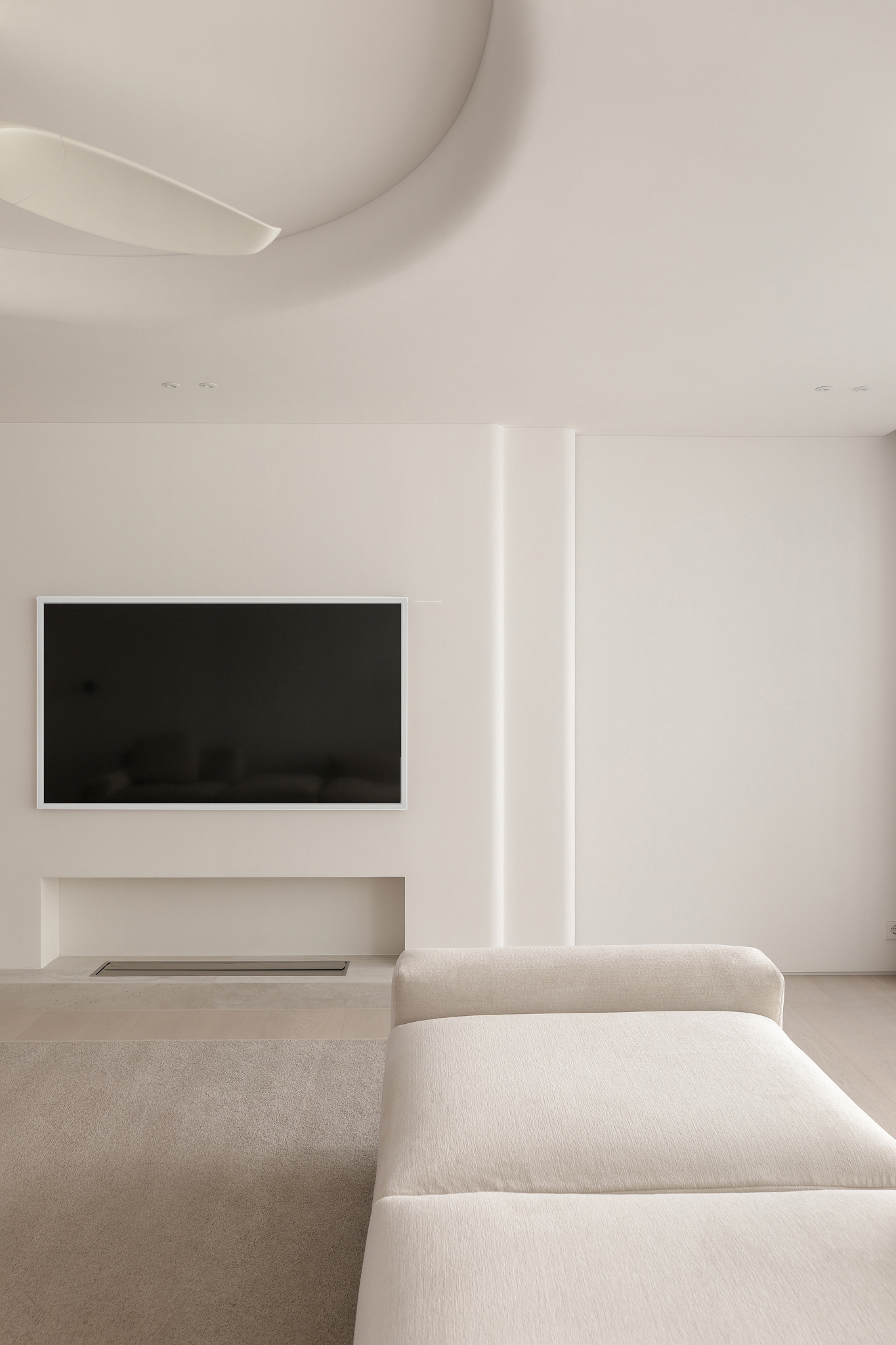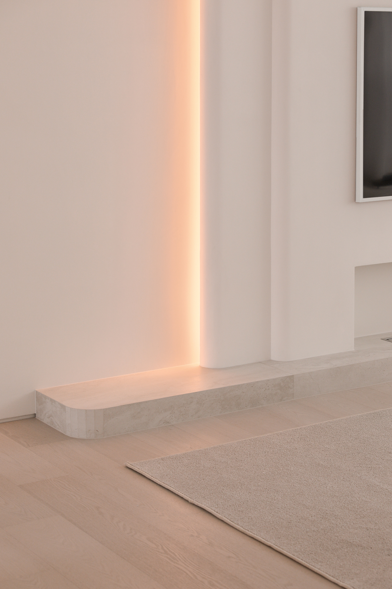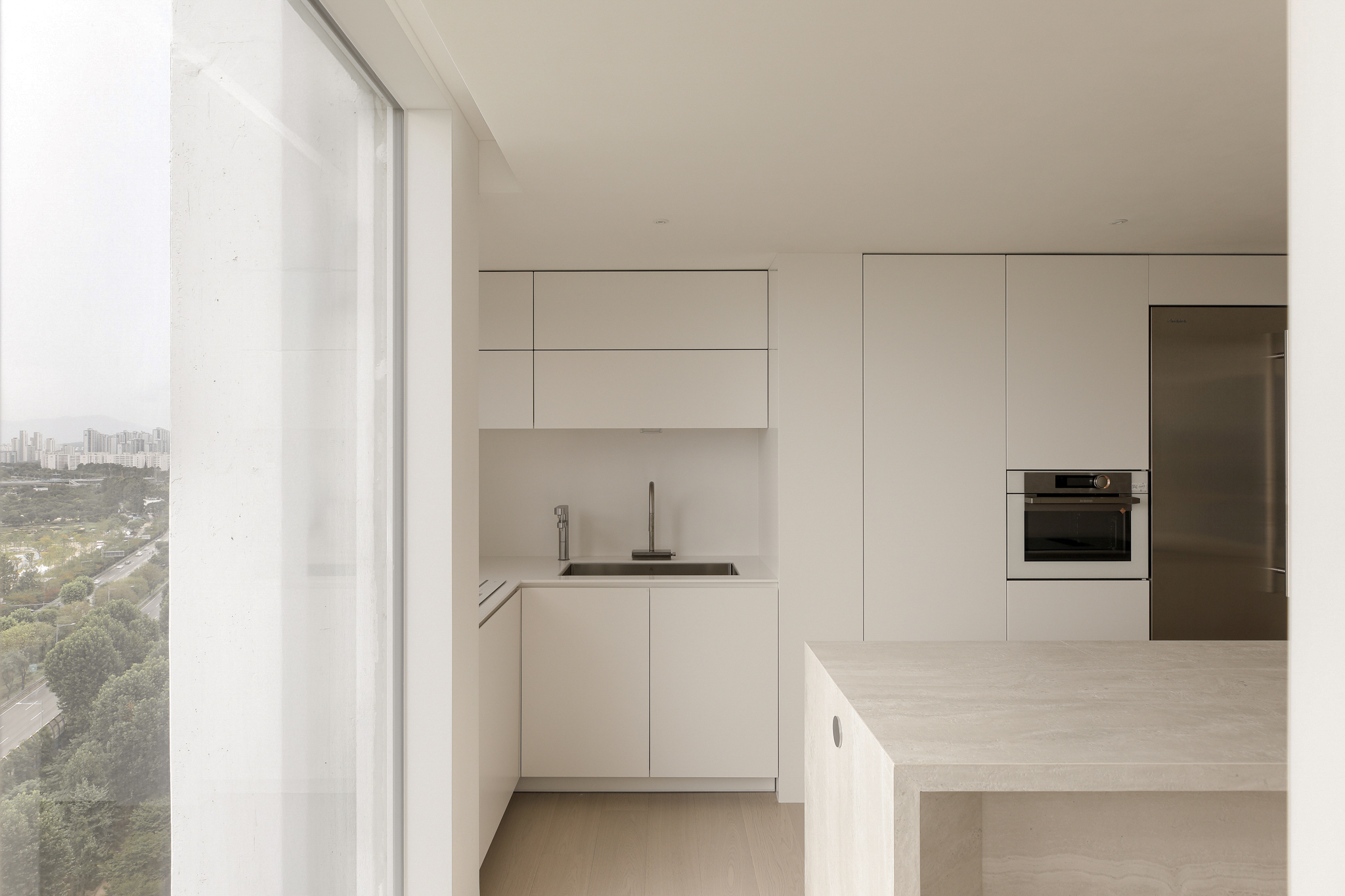 This project blends work and rest by reflecting the client’s lifestyle, opening key spaces to maximize the Han River view and create fluid transitions. Sculptural lime plaster surfaces, system windows, and carefully scaled curves shape a cohesive, light-responsive interior, while the living room’s recessed TV and fireplace form a calm, welcoming retreat.