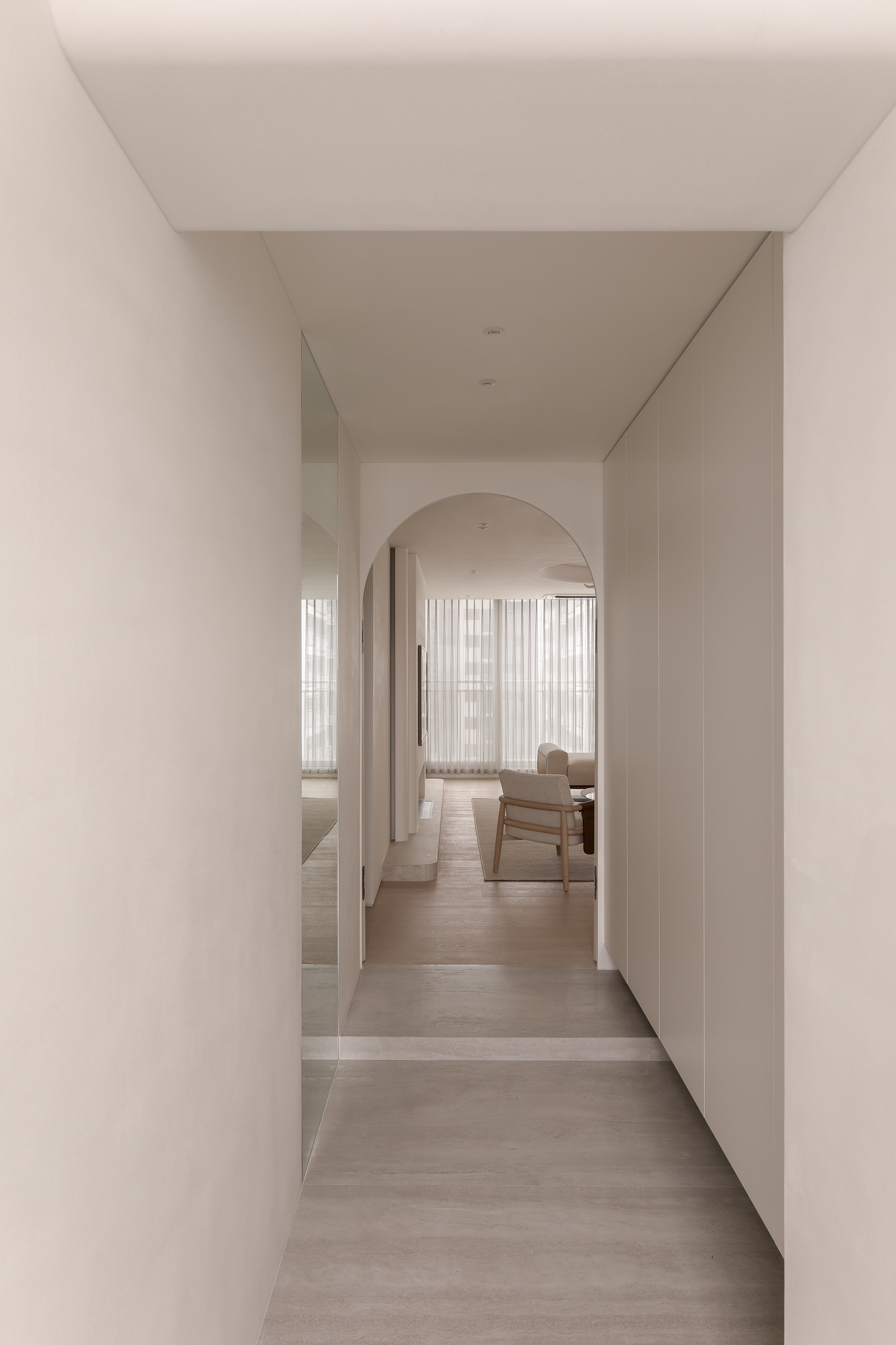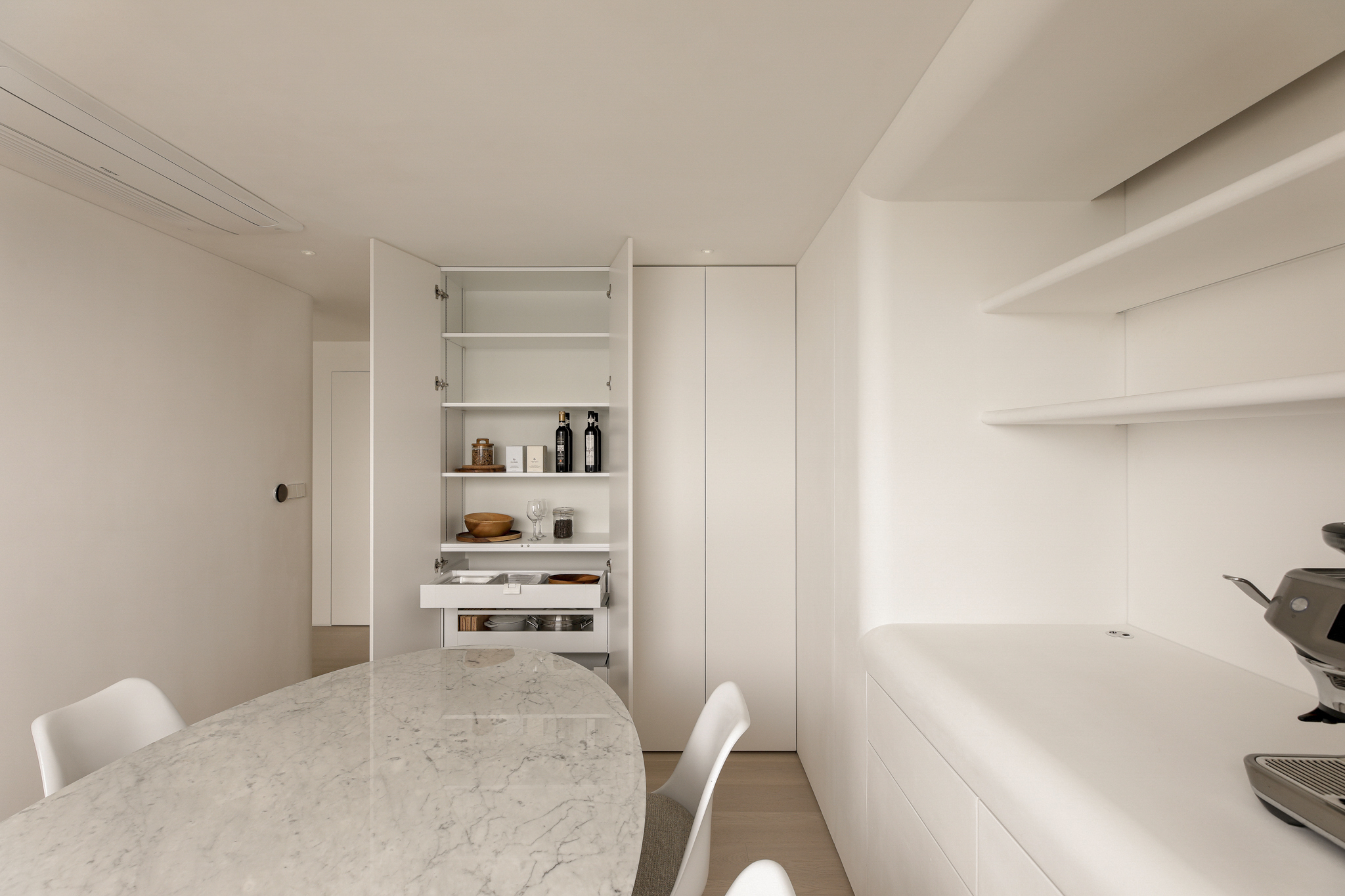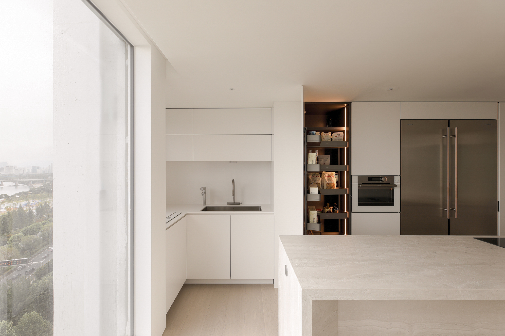 자연스럽게 흐르는 벽 속에 깊고 얕은 팬트리를 구성하고 벽과 수납 그리고 아파트에 기존에 있던