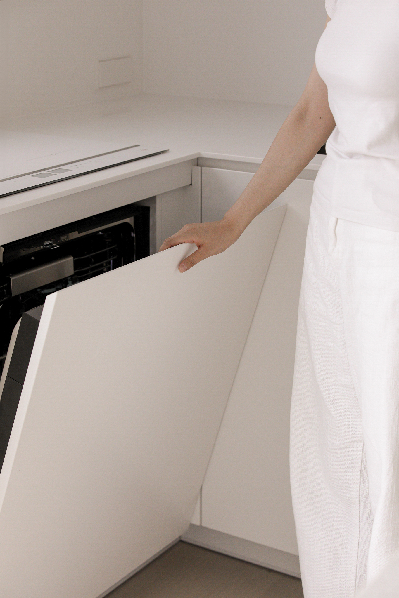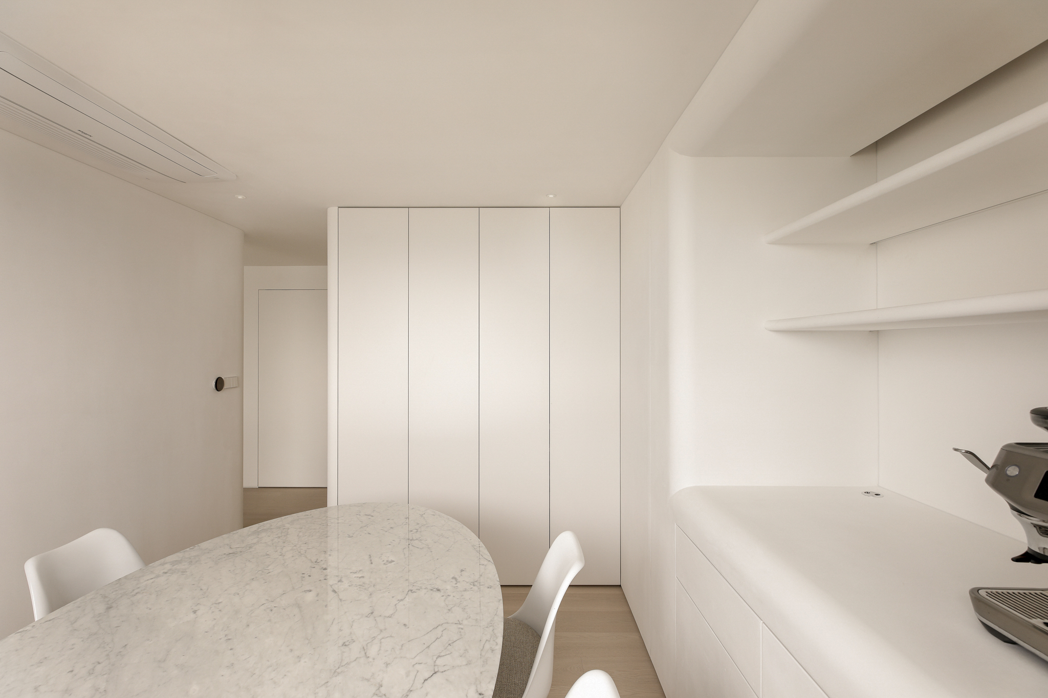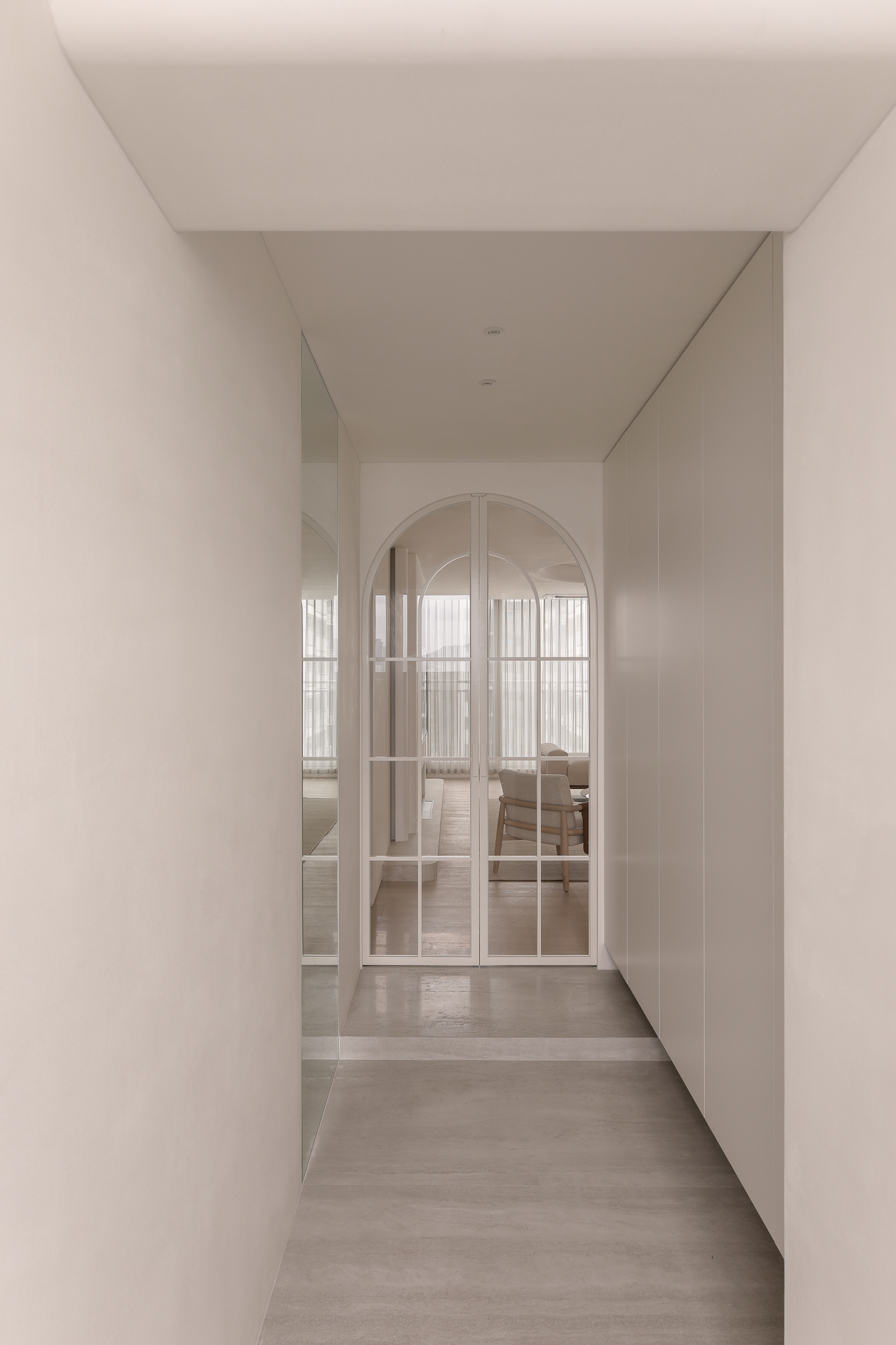 자연스럽게 흐르는 벽 속에 깊고 얕은 팬트리를 구성하고 벽과 수납 그리고 아파트에 기존에 있던