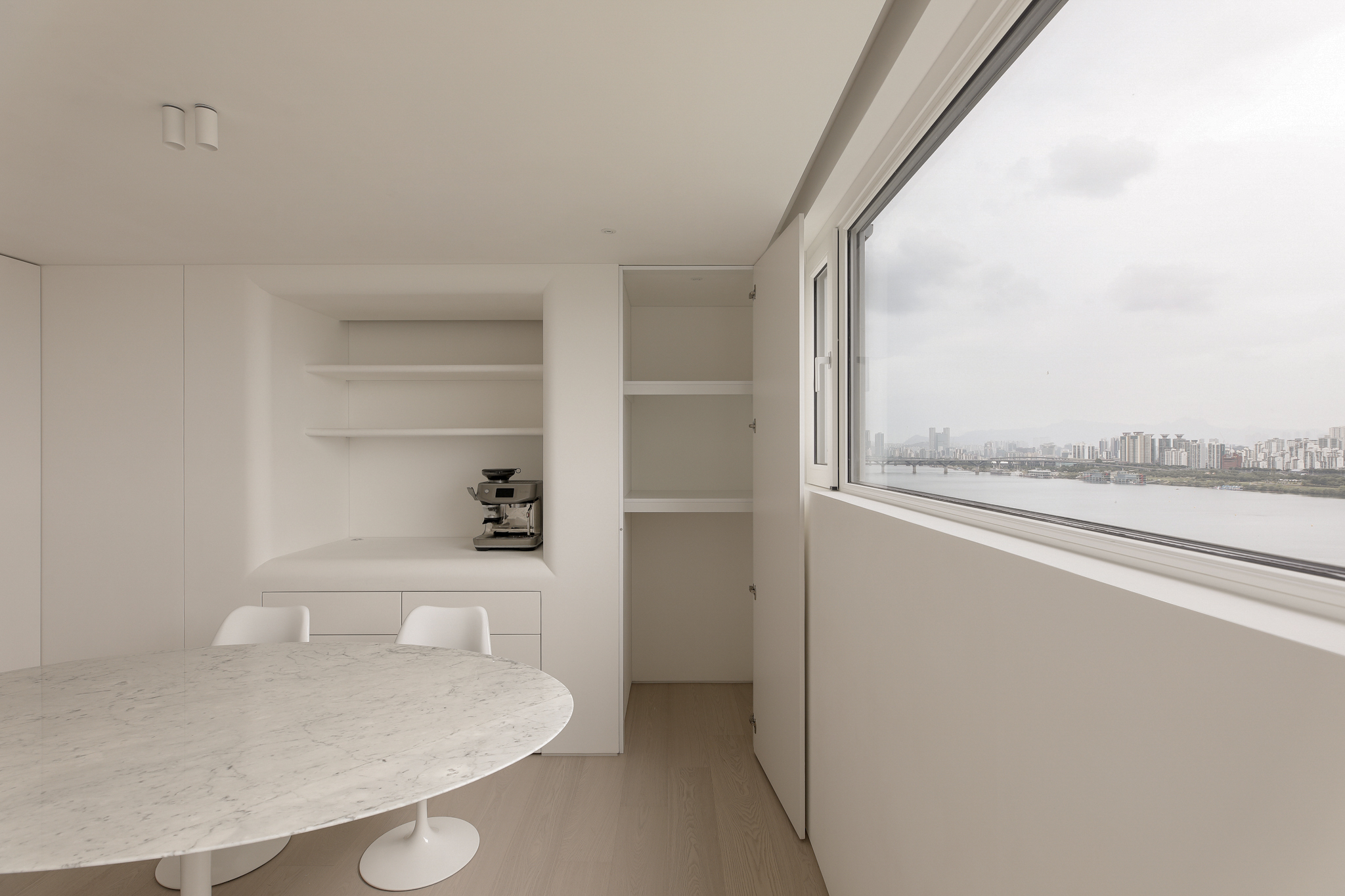 주방 쪽의 방은 한강이 보이는 좋은 풍경을 가지고 있고 주방과 이어지는 동선이 가능하여 주방 쪽 방의 문을 제거해 다이닝 룸으로 구성했습니다. 시선이 자연스럽게 차단되면서도 동선은 순환되는 구조로 재탄생했으며