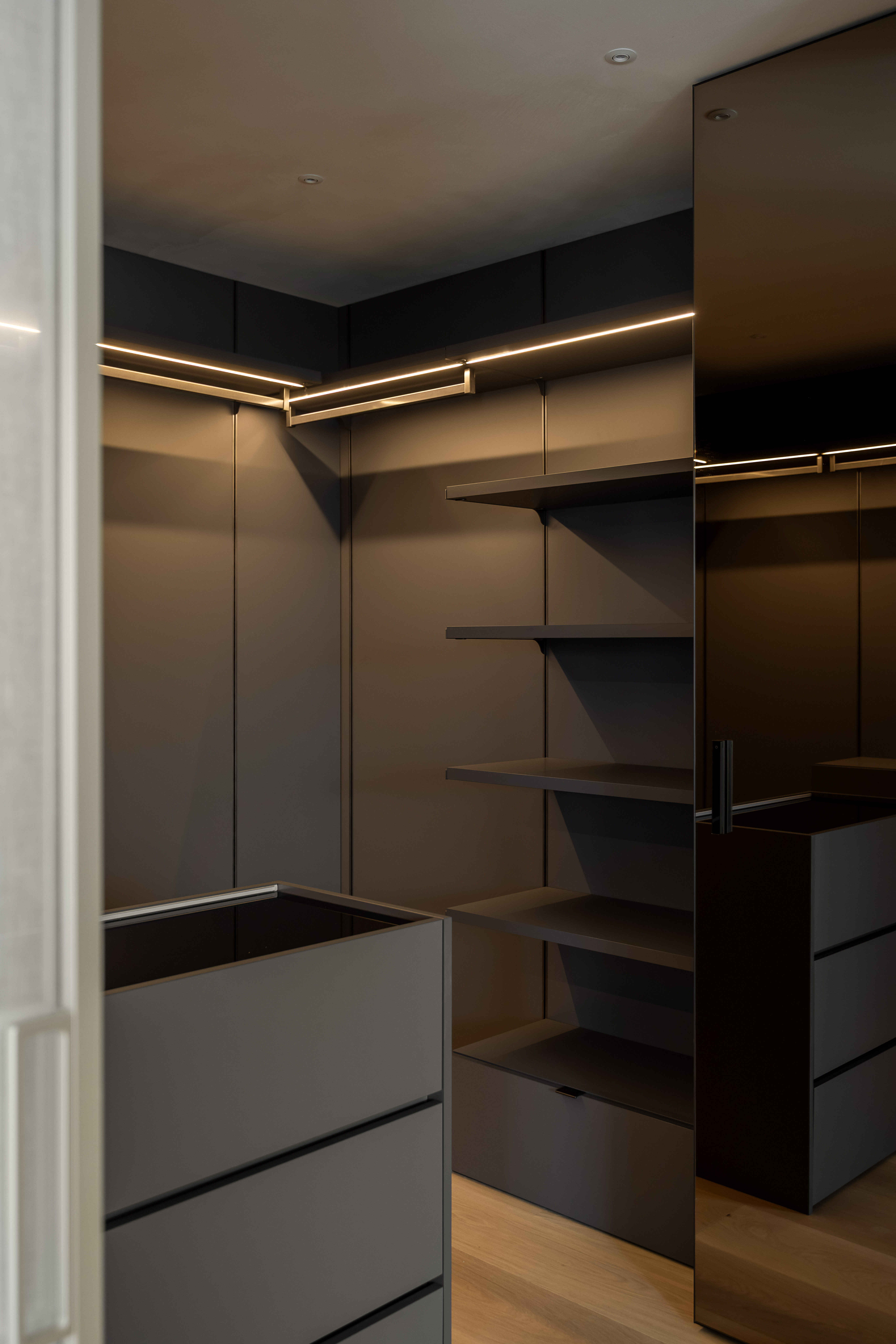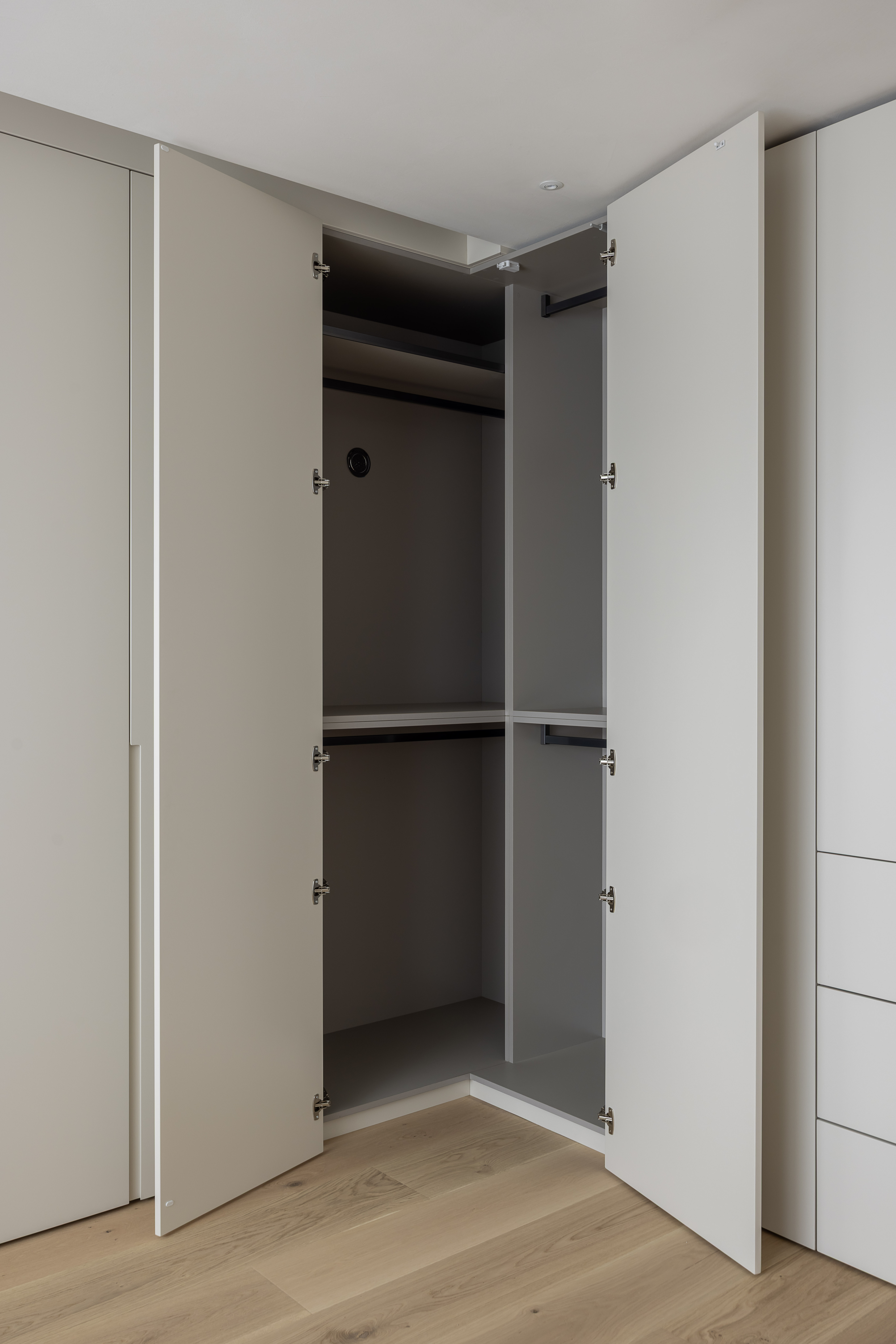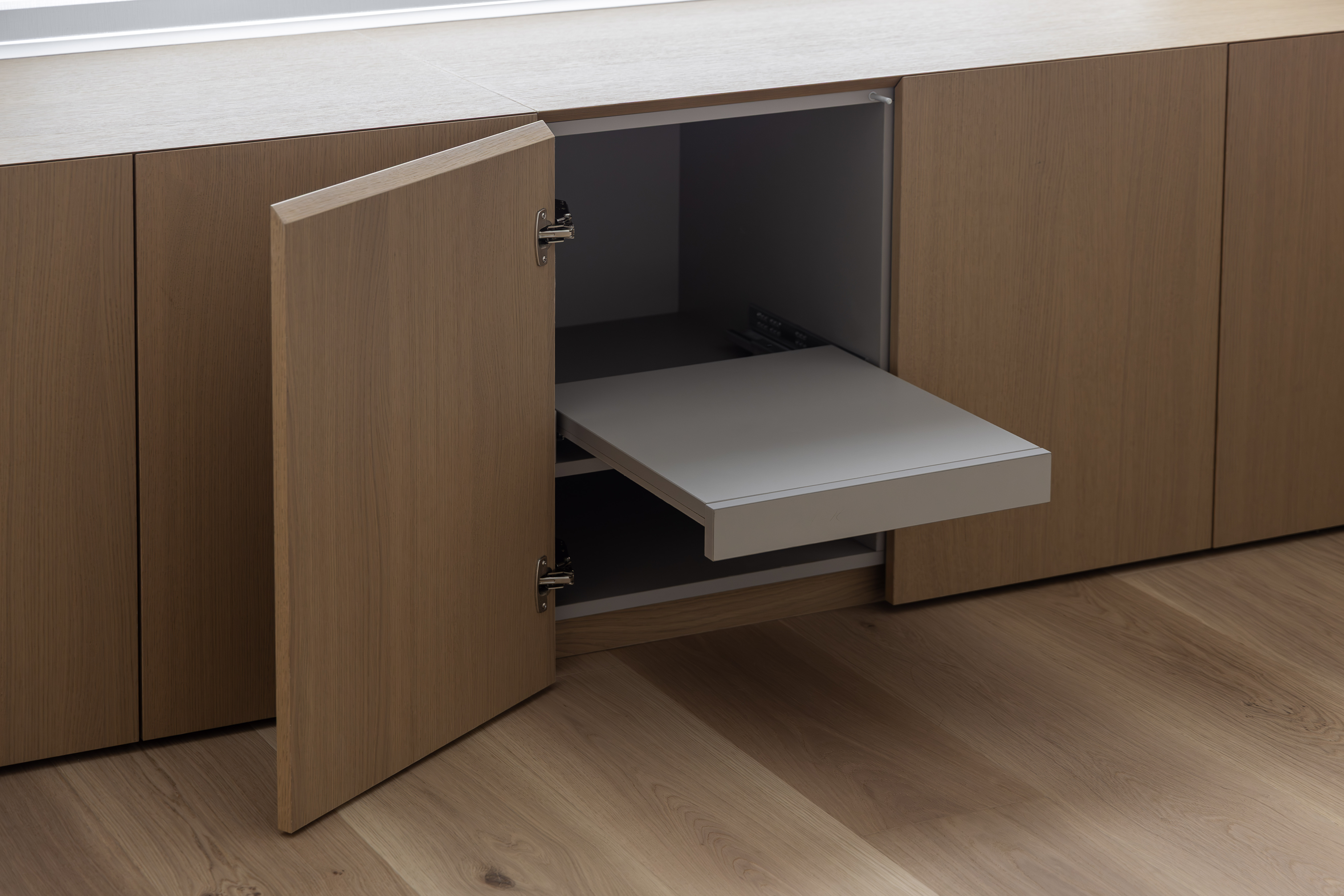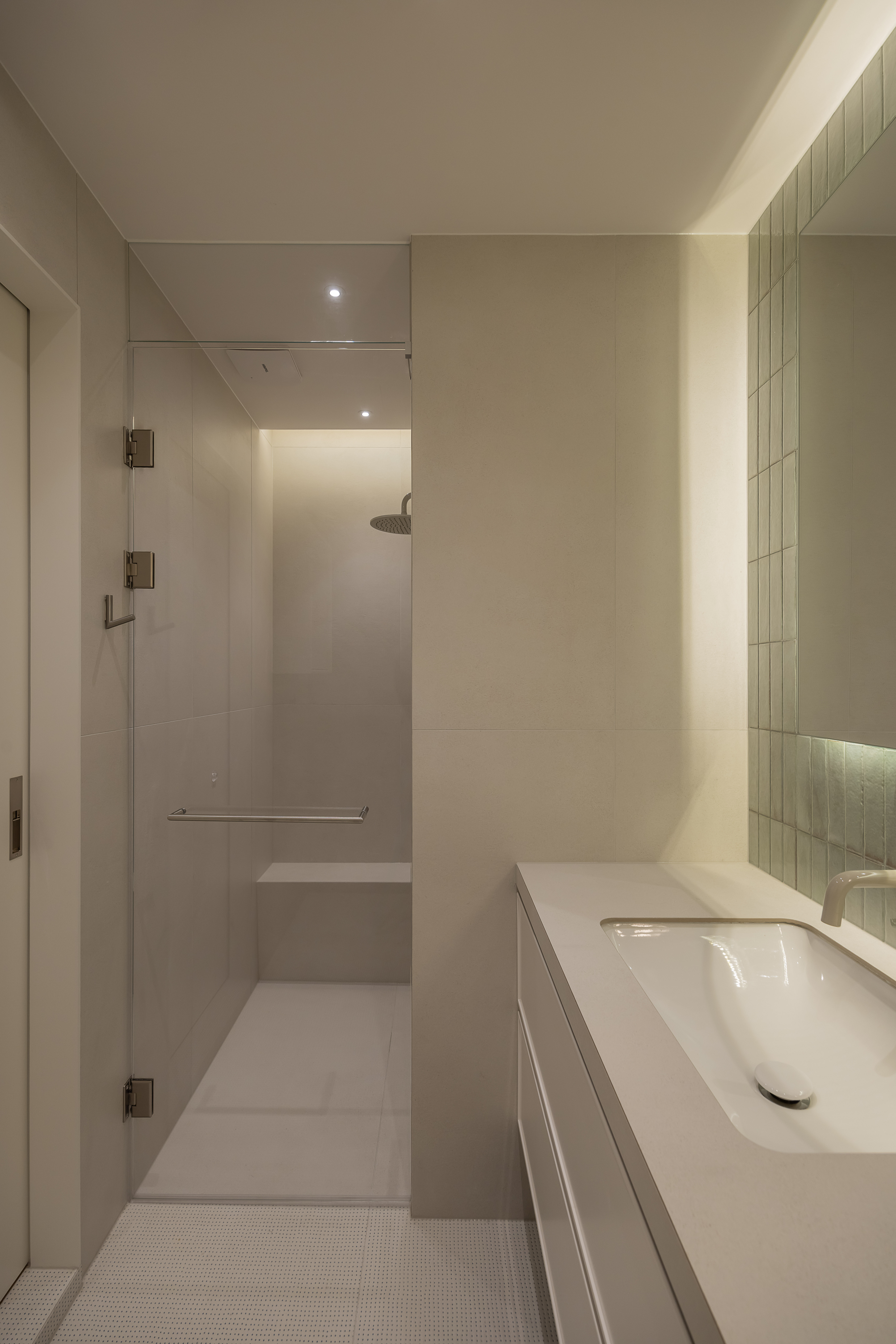 그 외 기능적인 붙박이장이나 주방 캐비닛 많은 기능을 담고 있지만 도어의 비율과 소재를 크림톤으로 단정한 구성을 나타내며, 기존 플라스터 회벽과 은은하게 한 톤으로 어우러지도록 의도했습니다.
