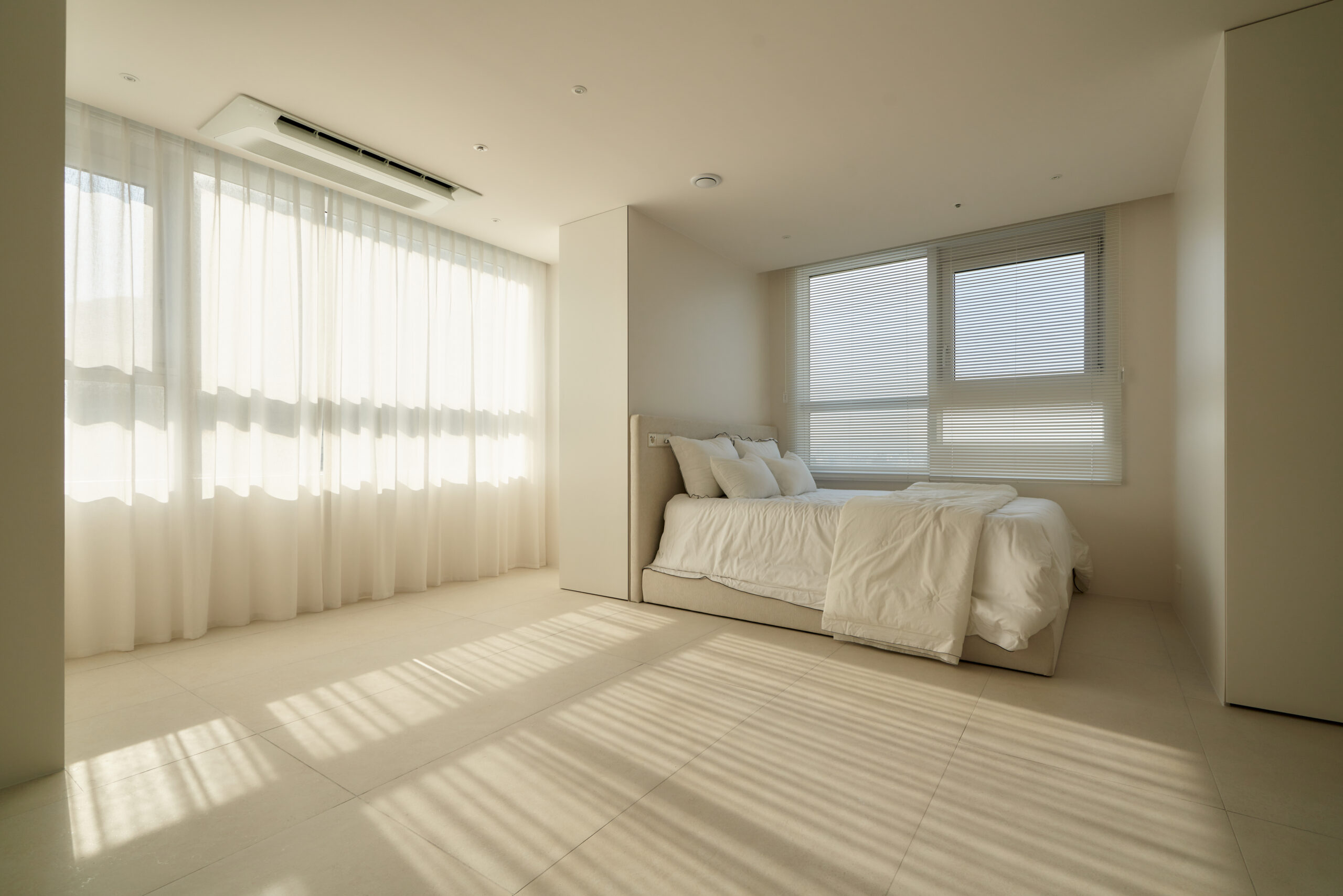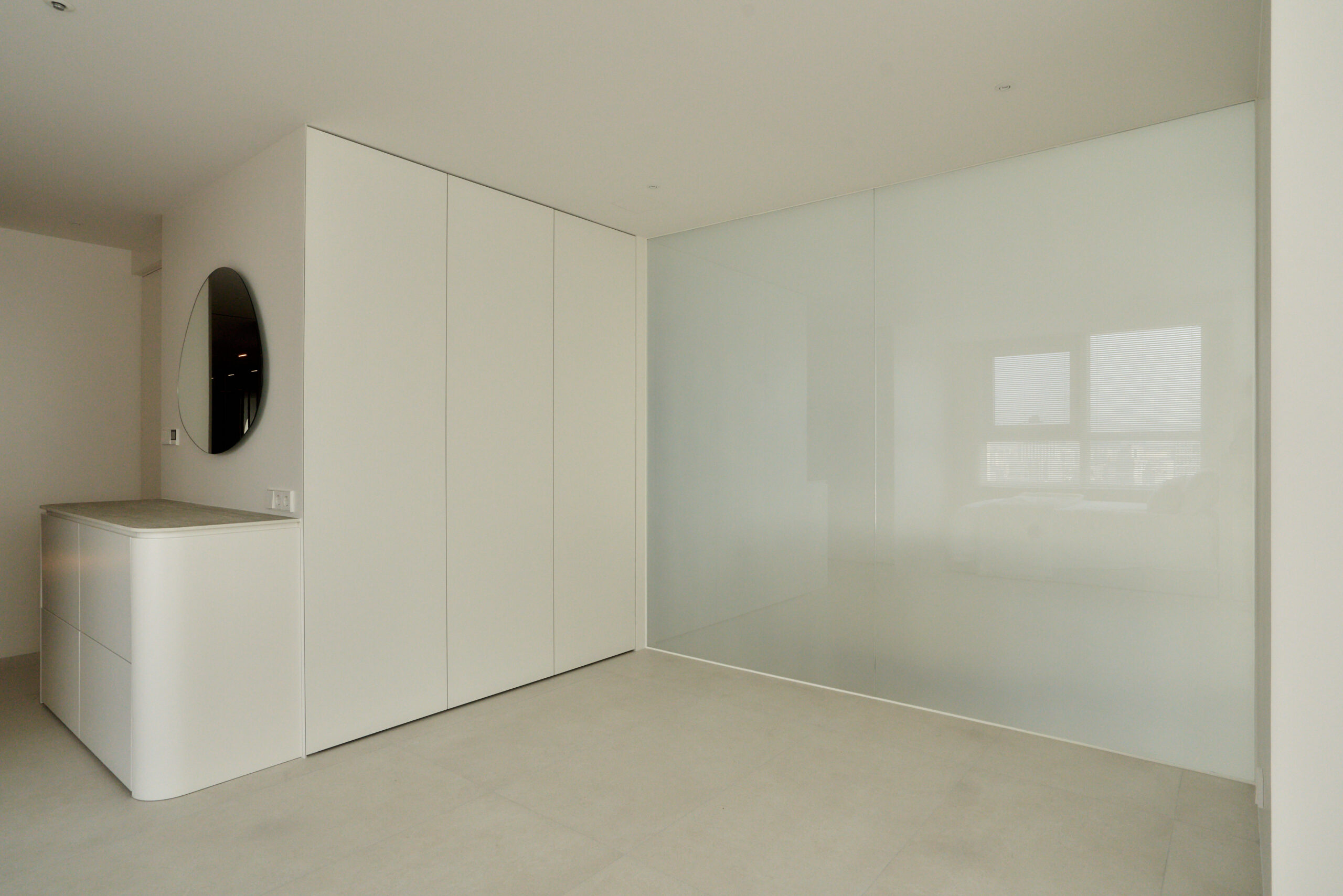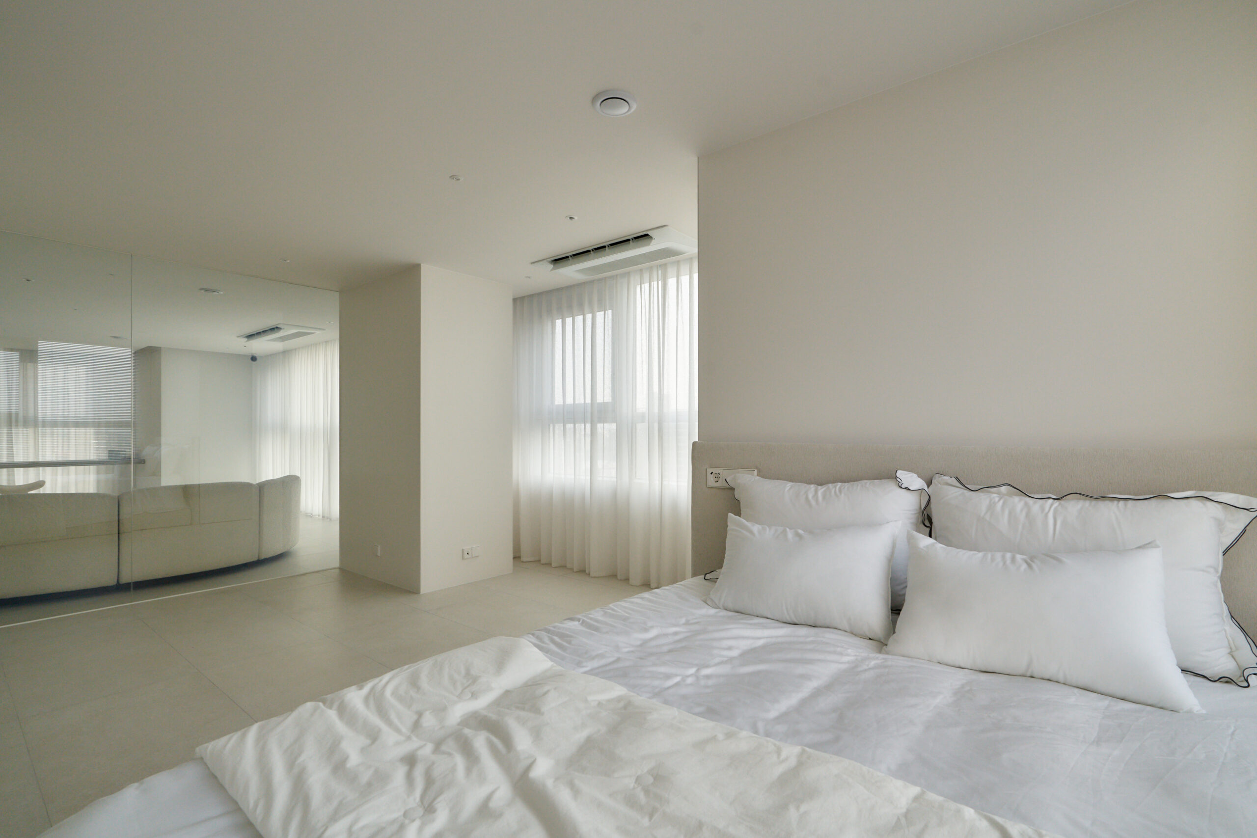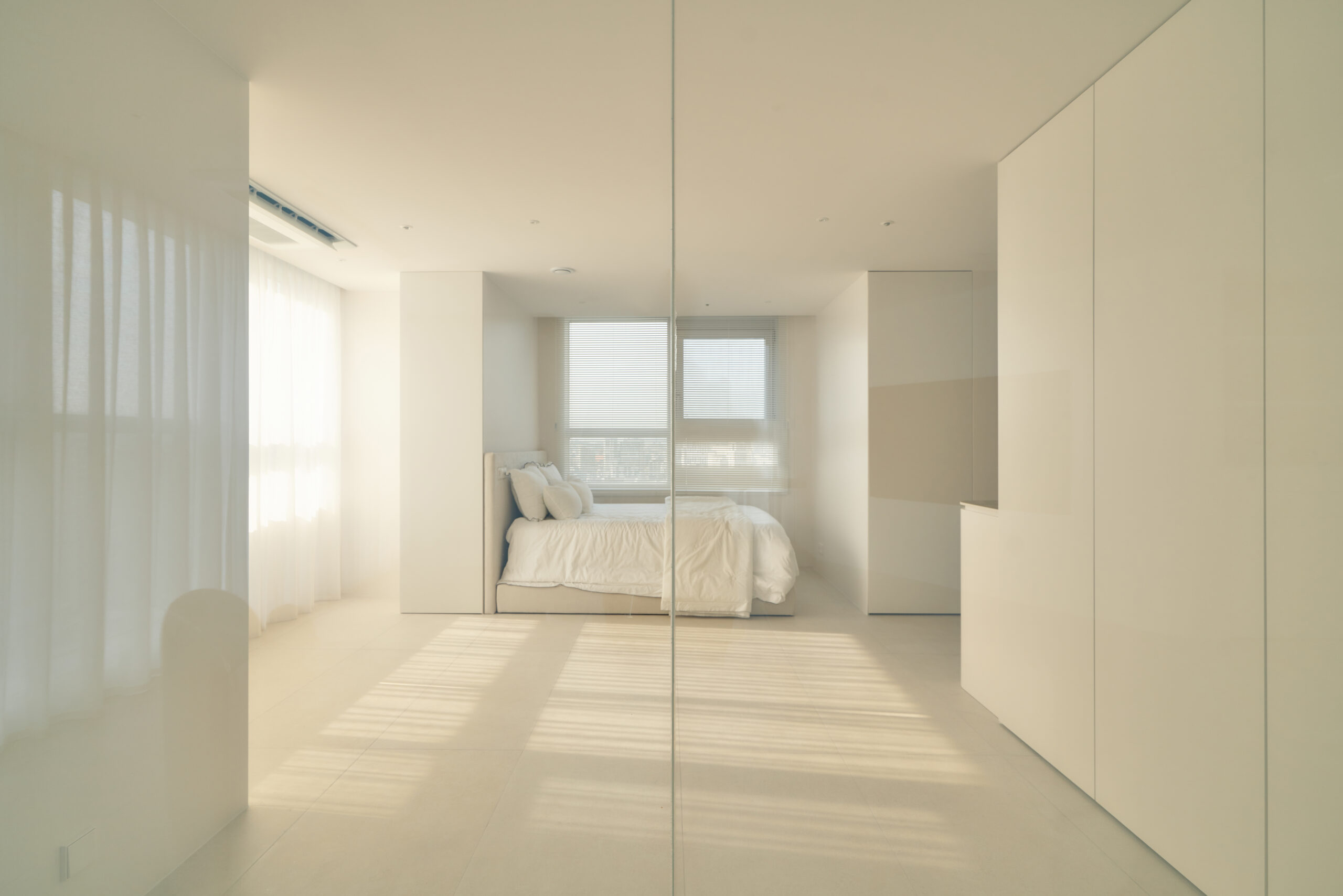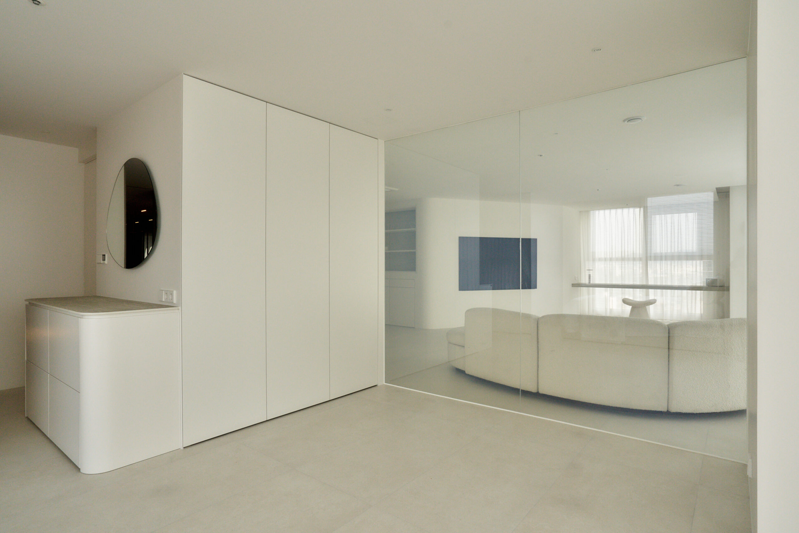 불필요한 요소는 과감히 덜어내고 수납과 기능에 충실한 디자인을 바탕으로, 타일 바닥을 적용해 시원하고 정제된 분위기를 연출했습니다. 주상복합 구조 특유의 제한적인 전용면적을 극복하기 위해 안방과 거실 사이에는 투명과 불투명 전환이 가능한 특수 글라스를 적용해 공간을 분리하거나 하나로 확장할 수 있는 가변성을 부여했으며, 절제된 구성 속에서 사용성과 공간 효율을 극대화하는 ‘미니멈 속의 맥시멈’을 구현했습니다.