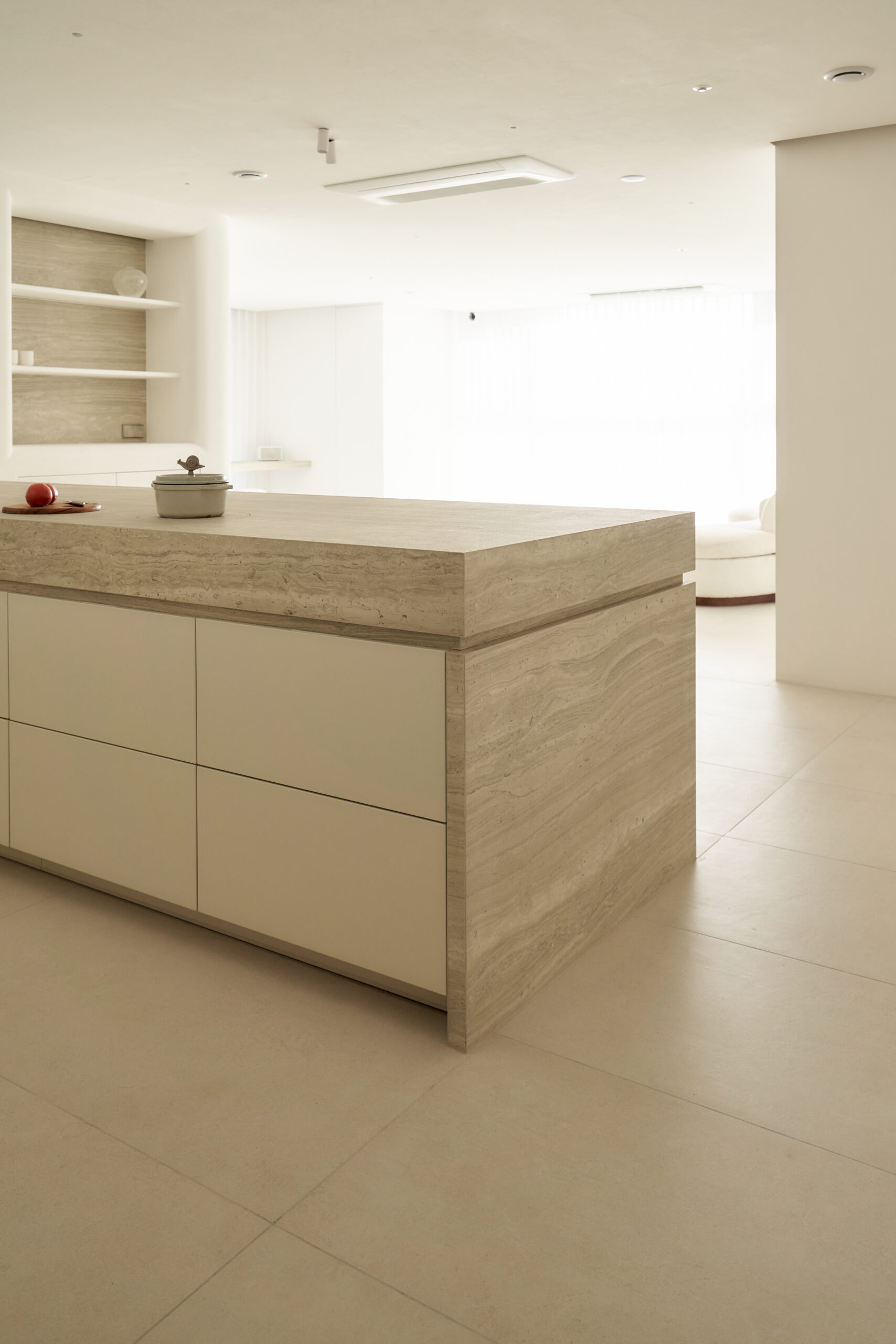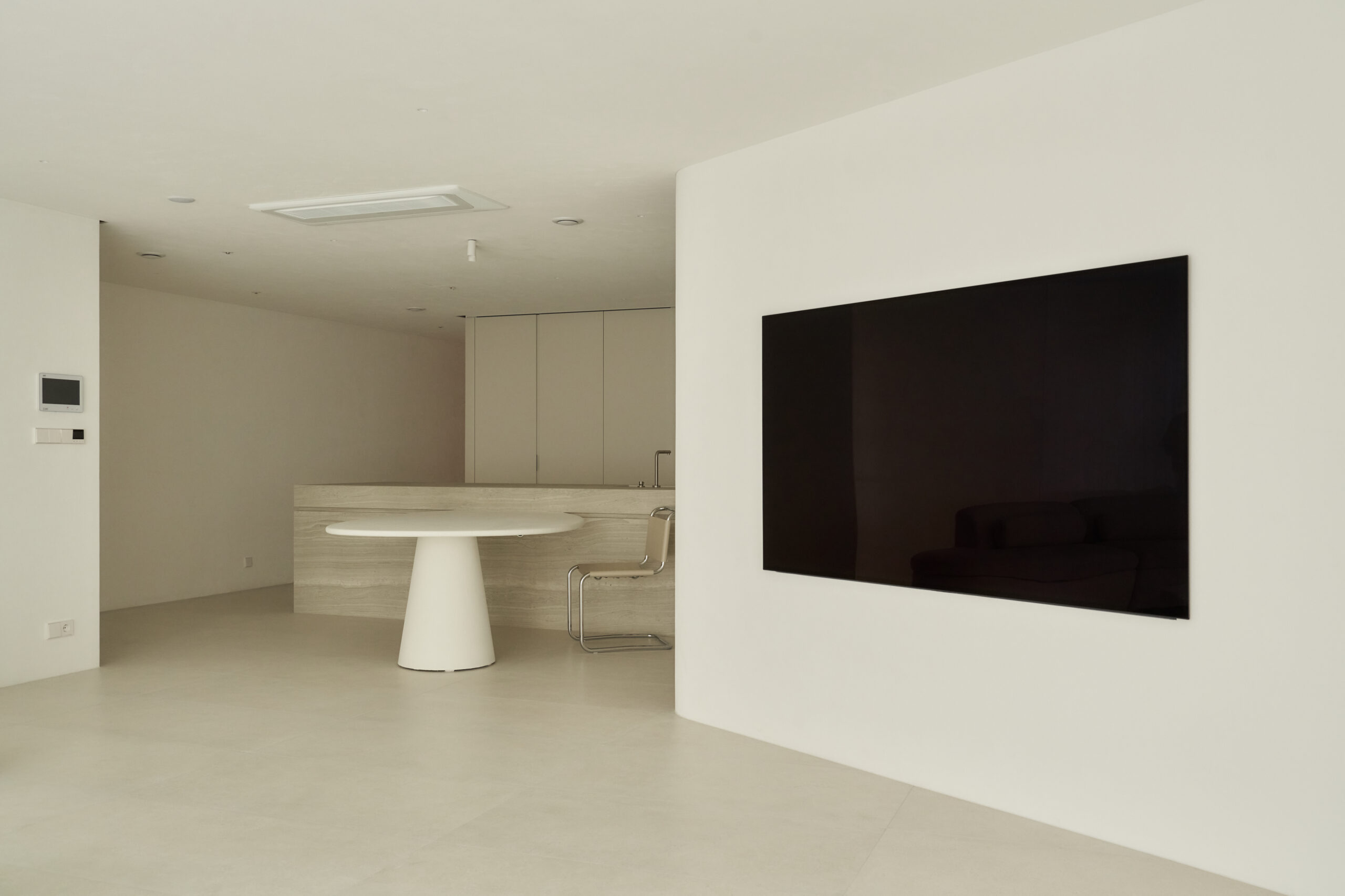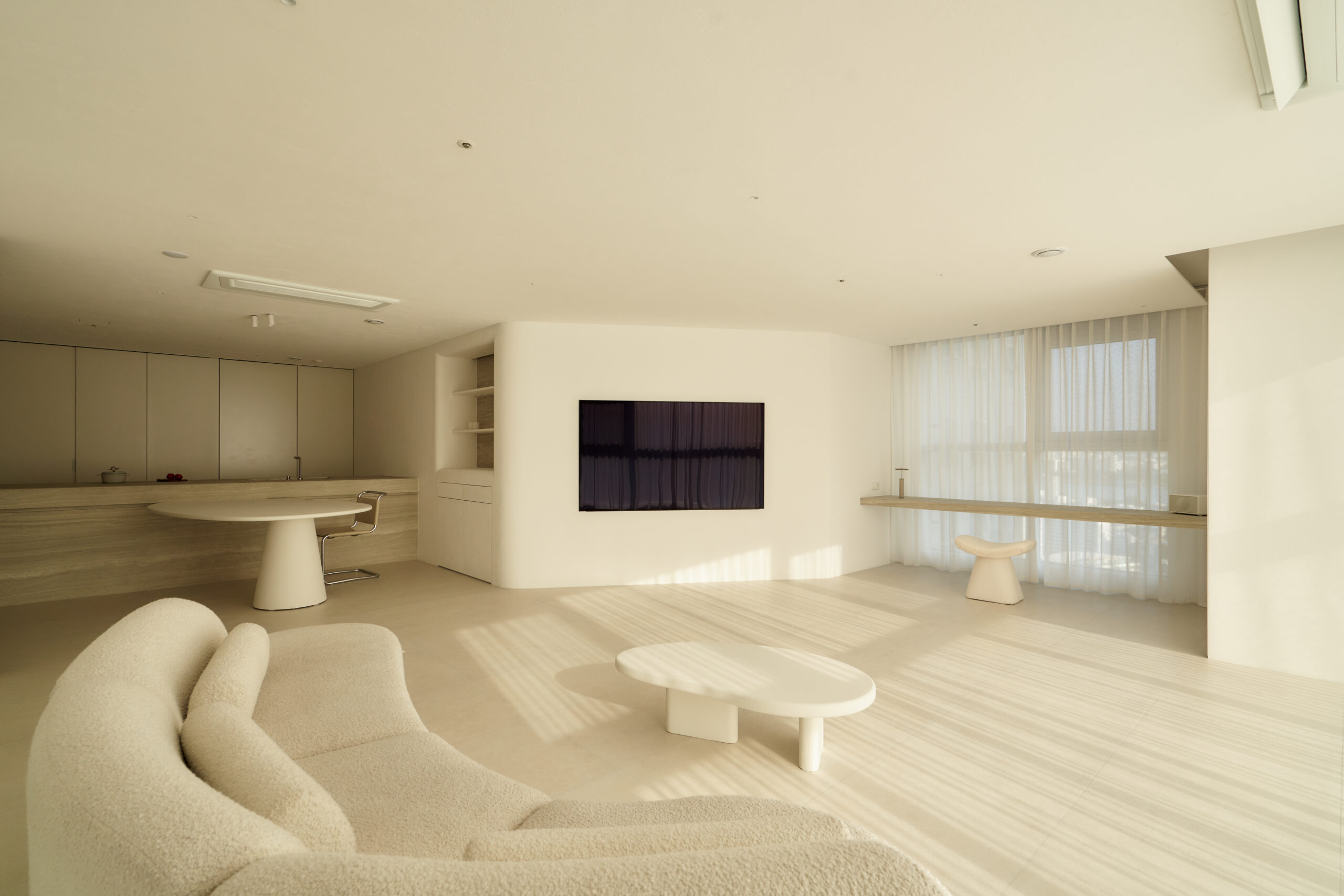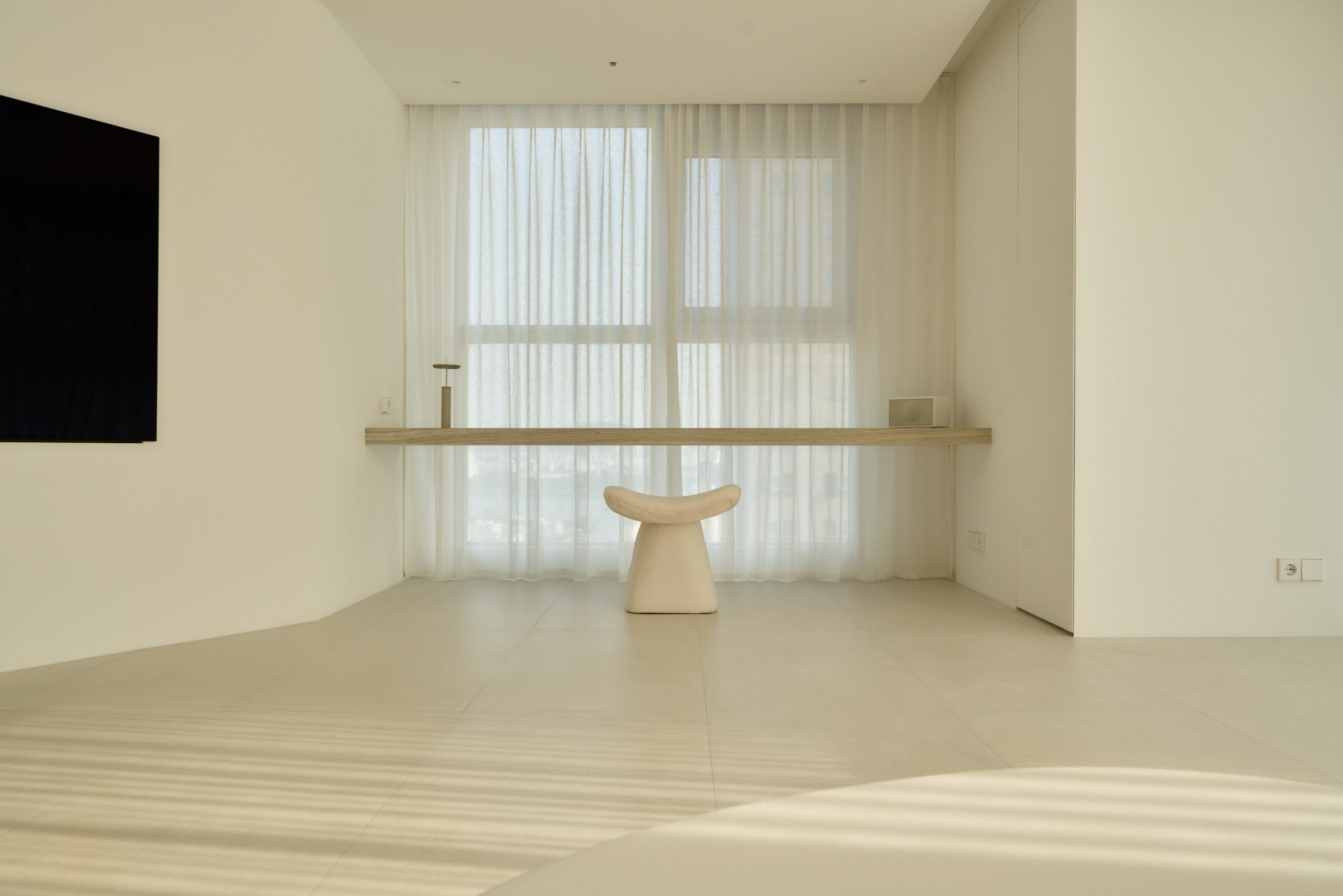불필요한 요소는 과감히 덜어내고 수납과 기능에 충실한 디자인을 바탕으로, 타일 바닥을 적용해 시원하고 정제된 분위기를 연출했습니다. 주상복합 구조 특유의 제한적인 전용면적을 극복하기 위해 안방과 거실 사이에는 투명과 불투명 전환이 가능한 특수 글라스를 적용해 공간을 분리하거나 하나로 확장할 수 있는 가변성을 부여했으며, 절제된 구성 속에서 사용성과 공간 효율을 극대화하는 ‘미니멈 속의 맥시멈’을 구현했습니다.