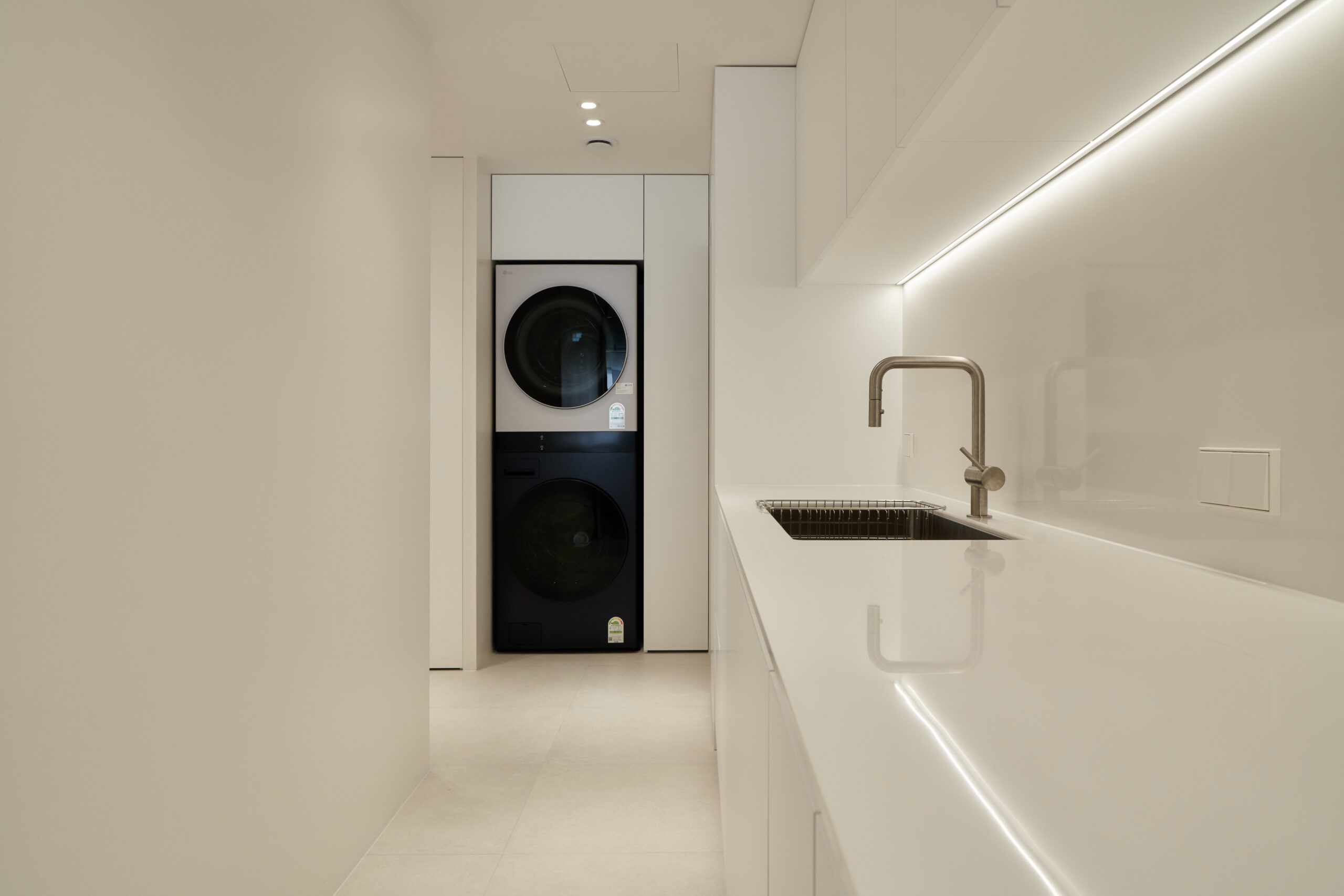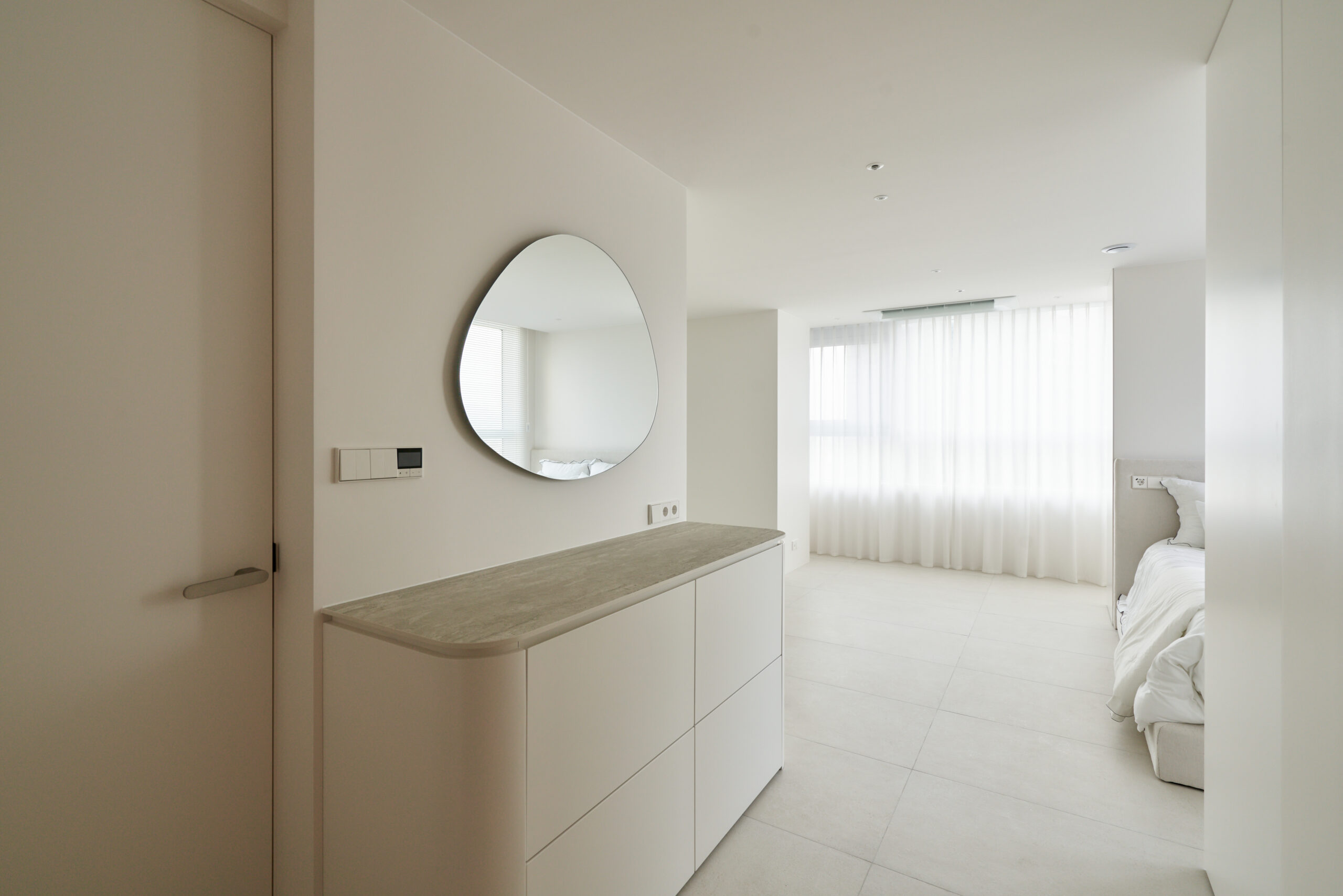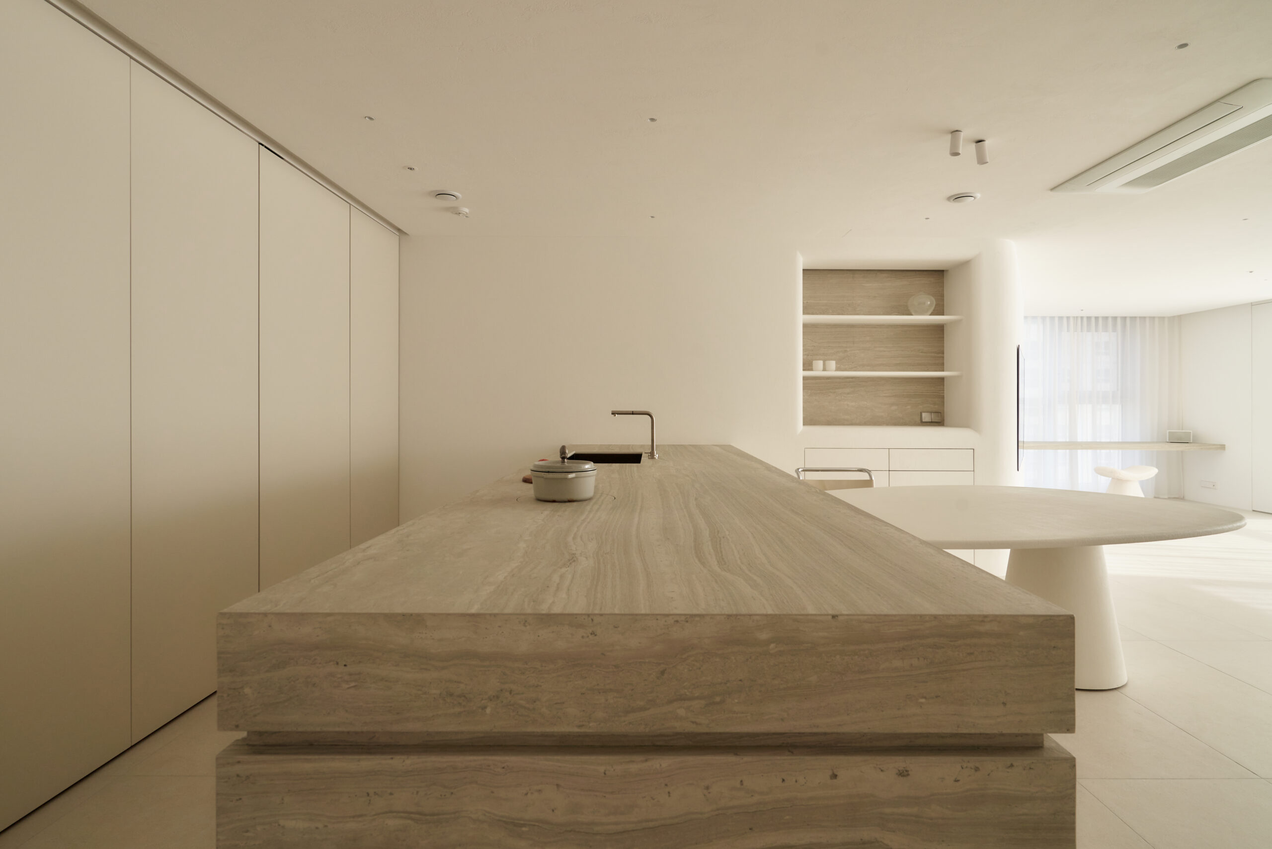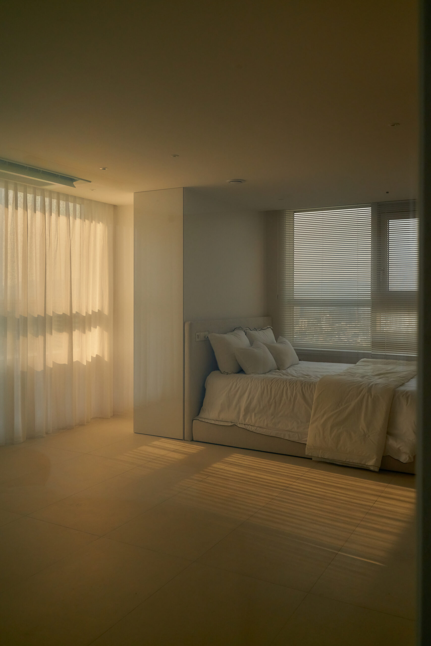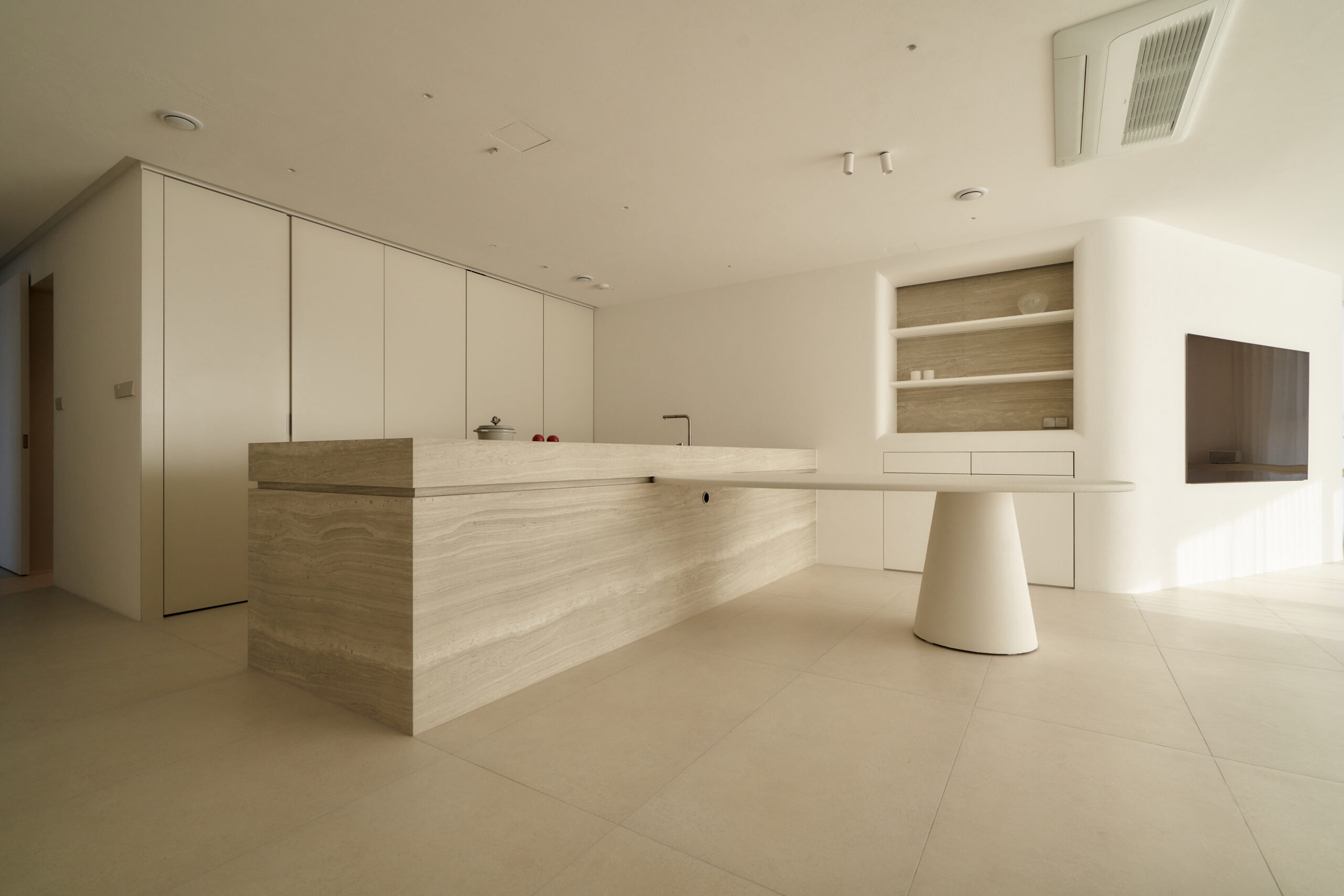 불필요한 요소는 과감히 덜어내고 수납과 기능에 충실한 디자인을 바탕으로, 타일 바닥을 적용해 시원하고 정제된 분위기를 연출했습니다. 주상복합 구조 특유의 제한적인 전용면적을 극복하기 위해 안방과 거실 사이에는 투명과 불투명 전환이 가능한 특수 글라스를 적용해 공간을 분리하거나 하나로 확장할 수 있는 가변성을 부여했으며, 절제된 구성 속에서 사용성과 공간 효율을 극대화하는 ‘미니멈 속의 맥시멈’을 구현했습니다.