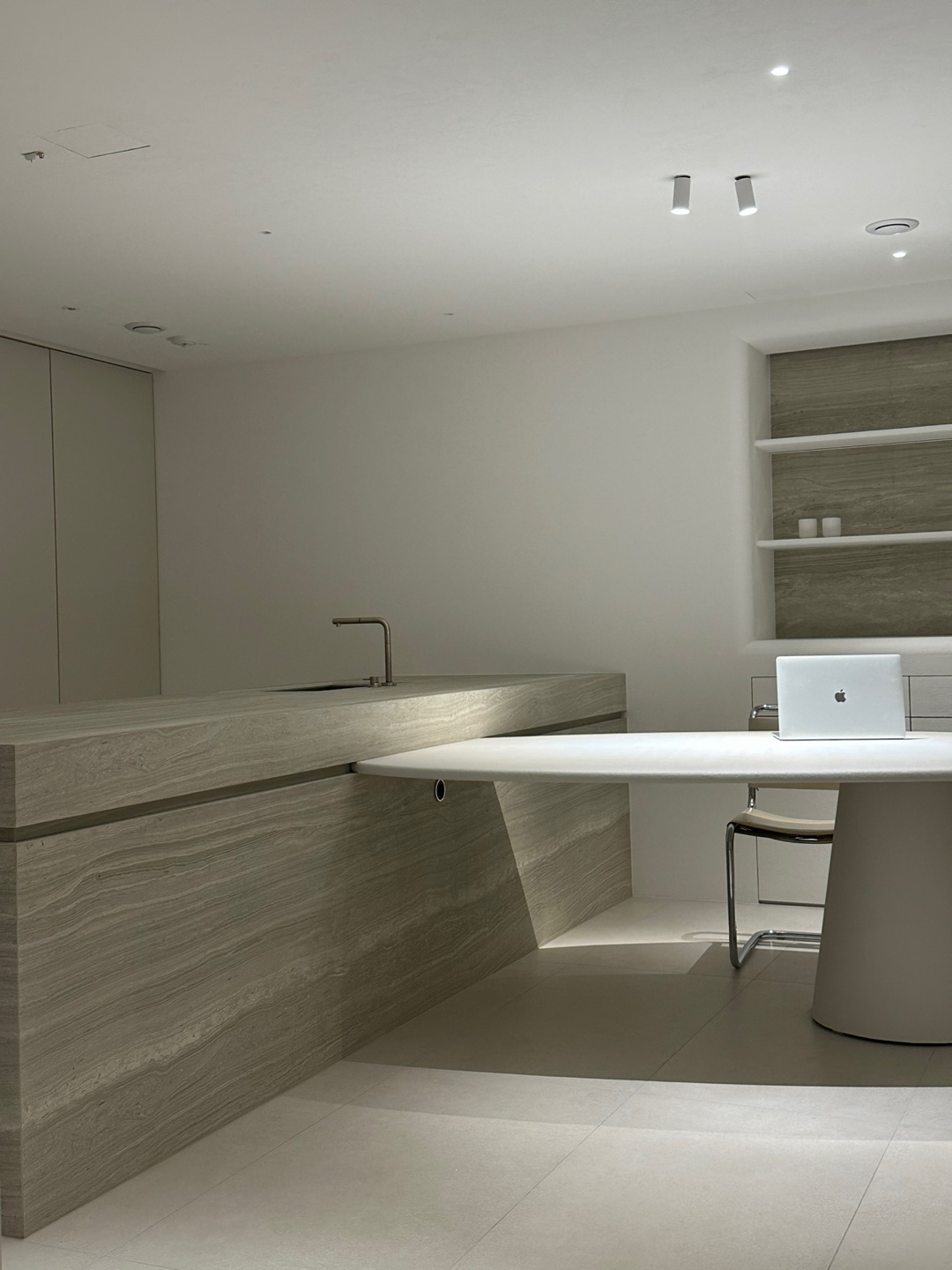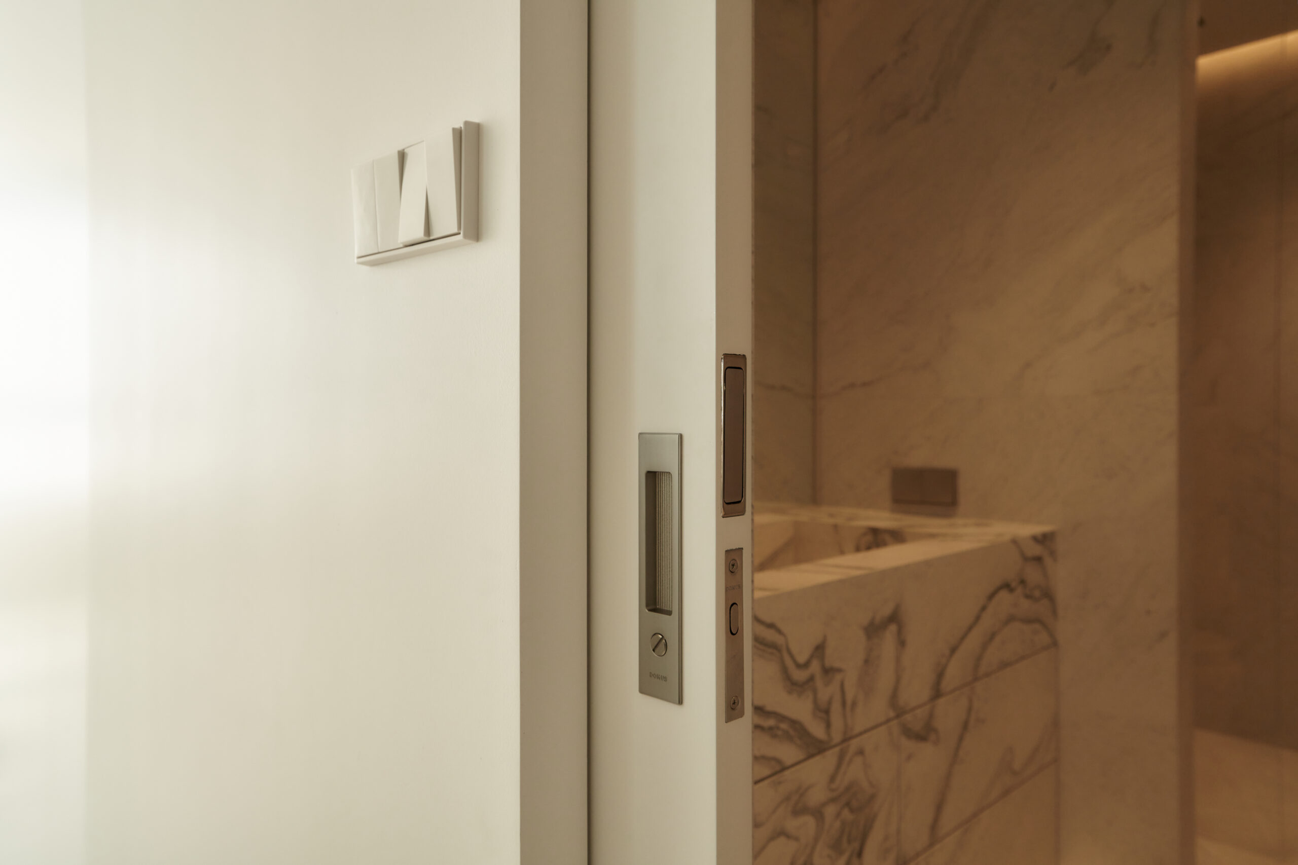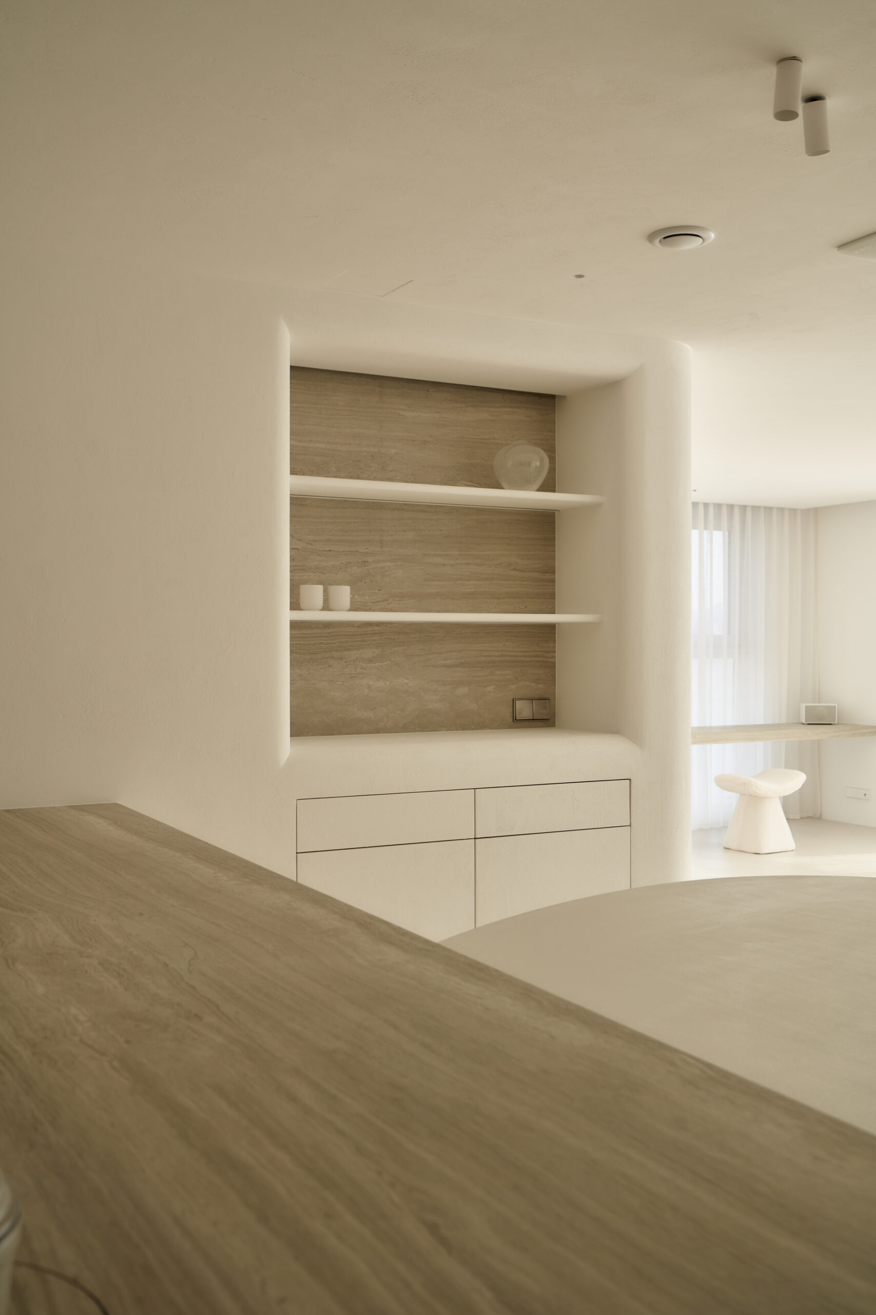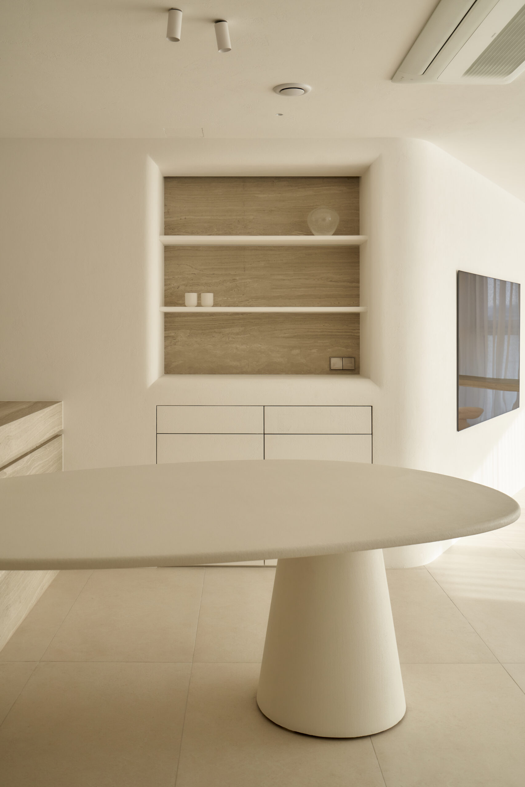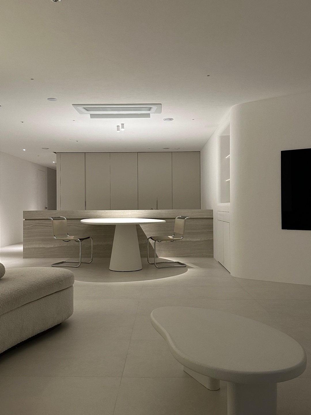불필요한 요소는 과감히 덜어내고 수납과 기능에 충실한 디자인을 바탕으로, 타일 바닥을 적용해 시원하고 정제된 분위기를 연출했습니다. 주상복합 구조 특유의 제한적인 전용면적을 극복하기 위해 안방과 거실 사이에는 투명과 불투명 전환이 가능한 특수 글라스를 적용해 공간을 분리하거나 하나로 확장할 수 있는 가변성을 부여했으며, 절제된 구성 속에서 사용성과 공간 효율을 극대화하는 ‘미니멈 속의 맥시멈’을 구현했습니다.