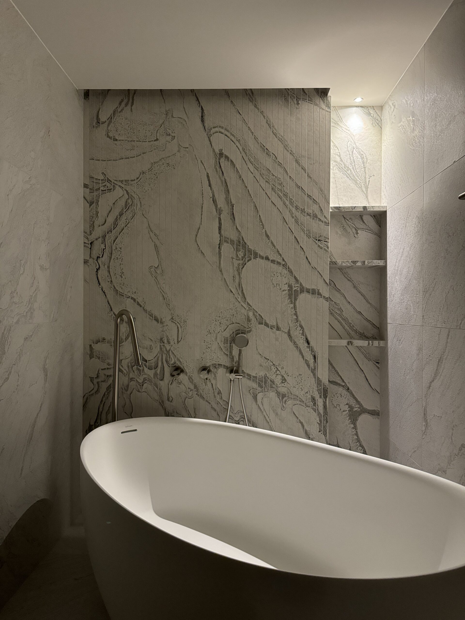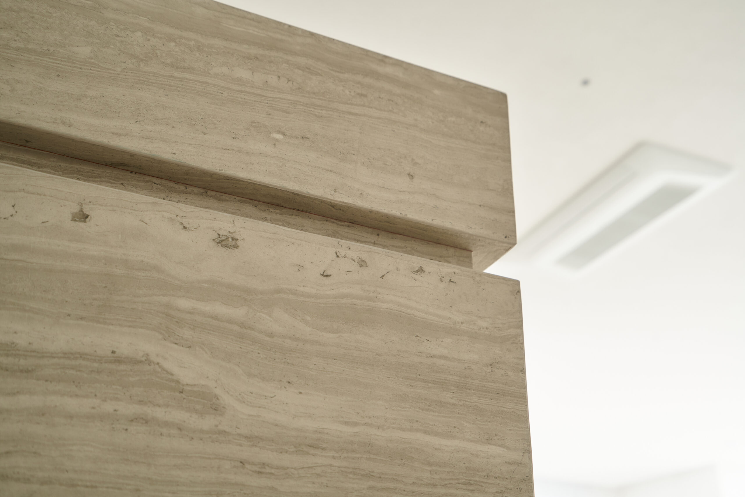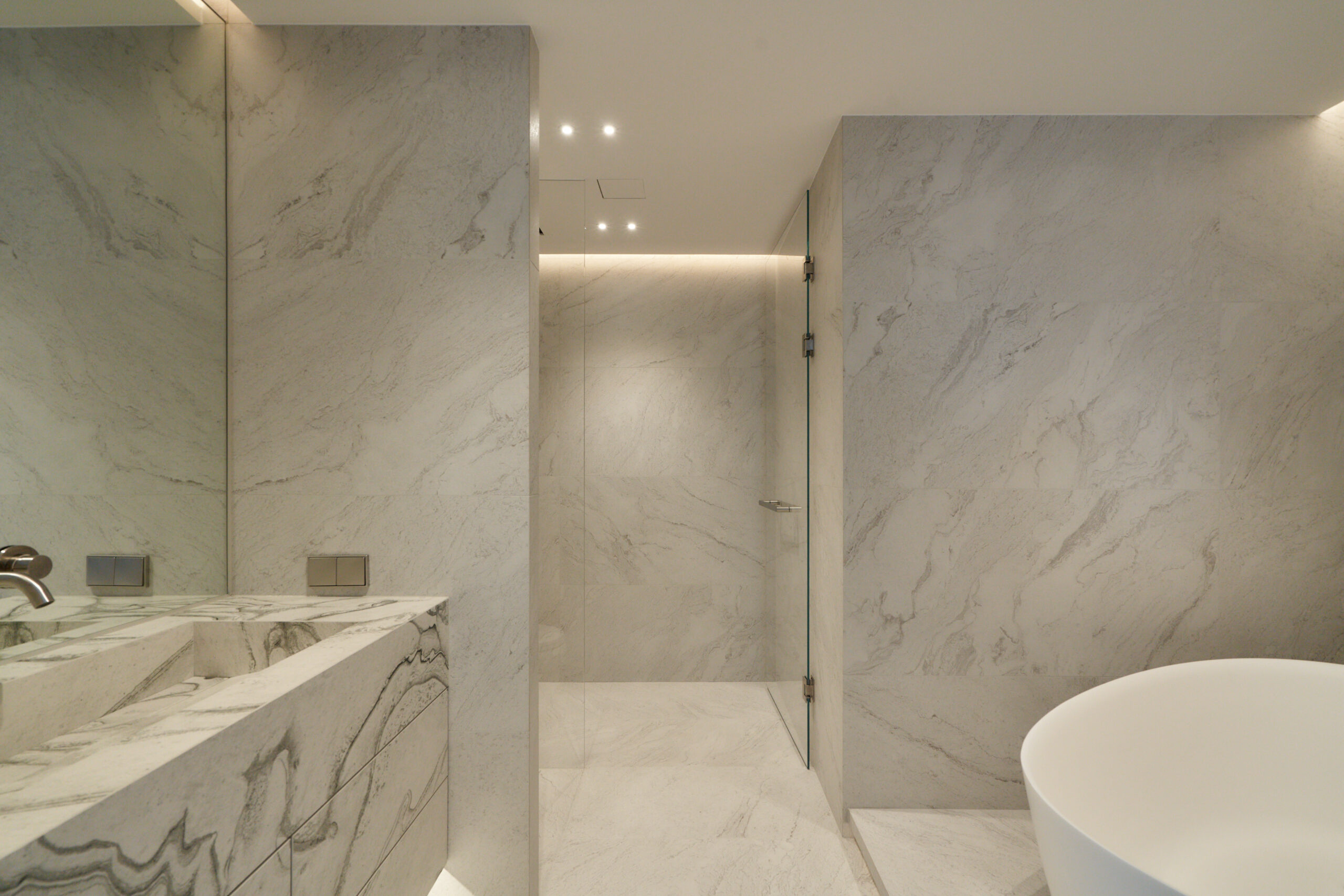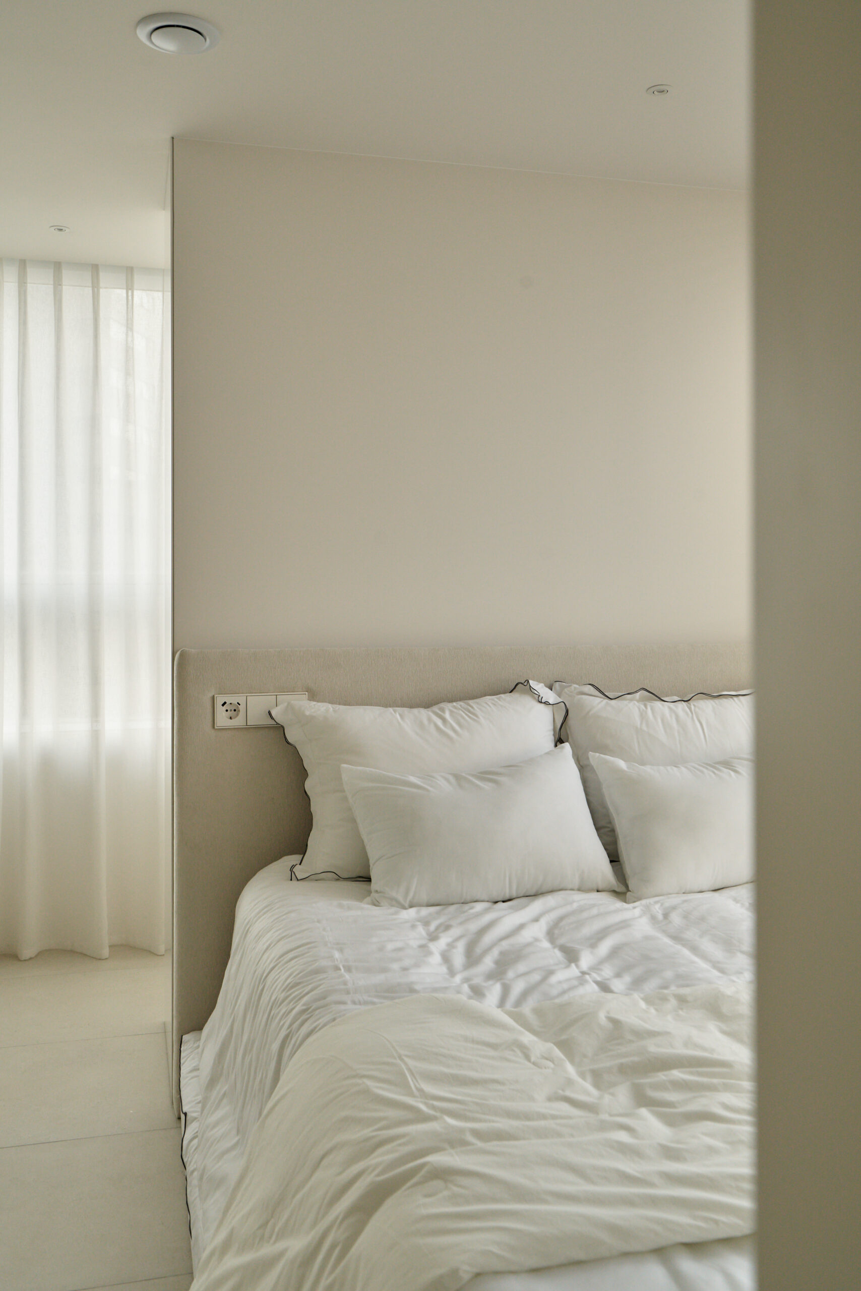불필요한 요소는 과감히 덜어내고 수납과 기능에 충실한 디자인을 바탕으로, 타일 바닥을 적용해 시원하고 정제된 분위기를 연출했습니다. 주상복합 구조 특유의 제한적인 전용면적을 극복하기 위해 안방과 거실 사이에는 투명과 불투명 전환이 가능한 특수 글라스를 적용해 공간을 분리하거나 하나로 확장할 수 있는 가변성을 부여했으며, 절제된 구성 속에서 사용성과 공간 효율을 극대화하는 ‘미니멈 속의 맥시멈’을 구현했습니다.