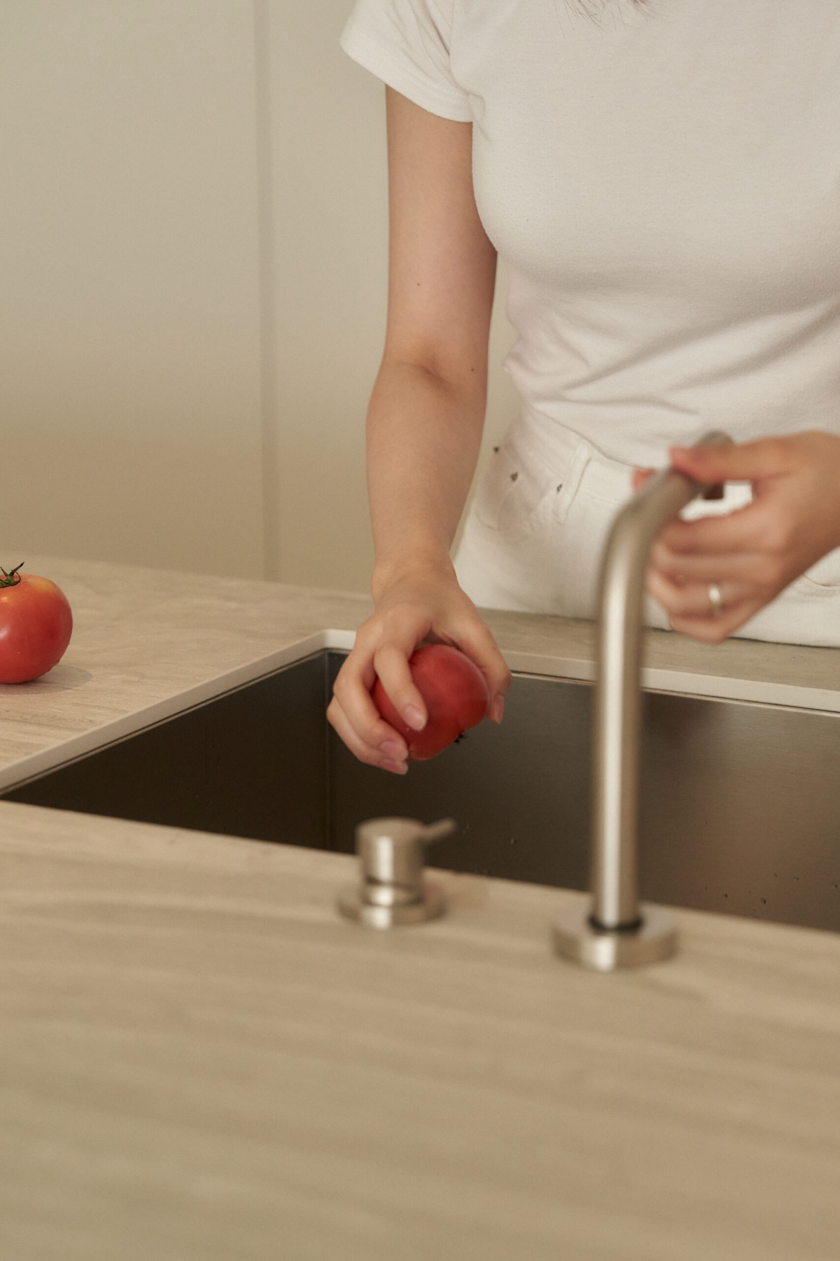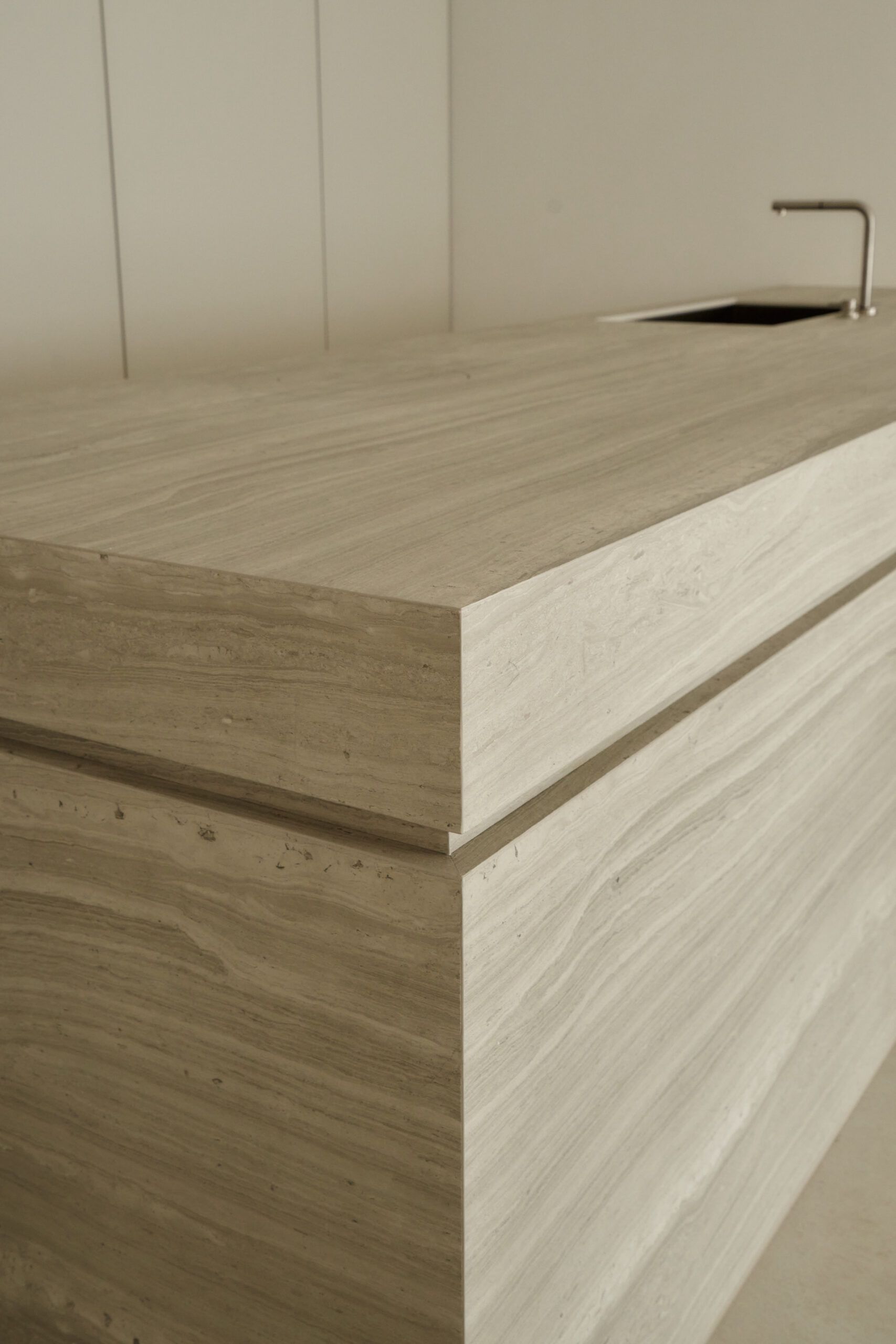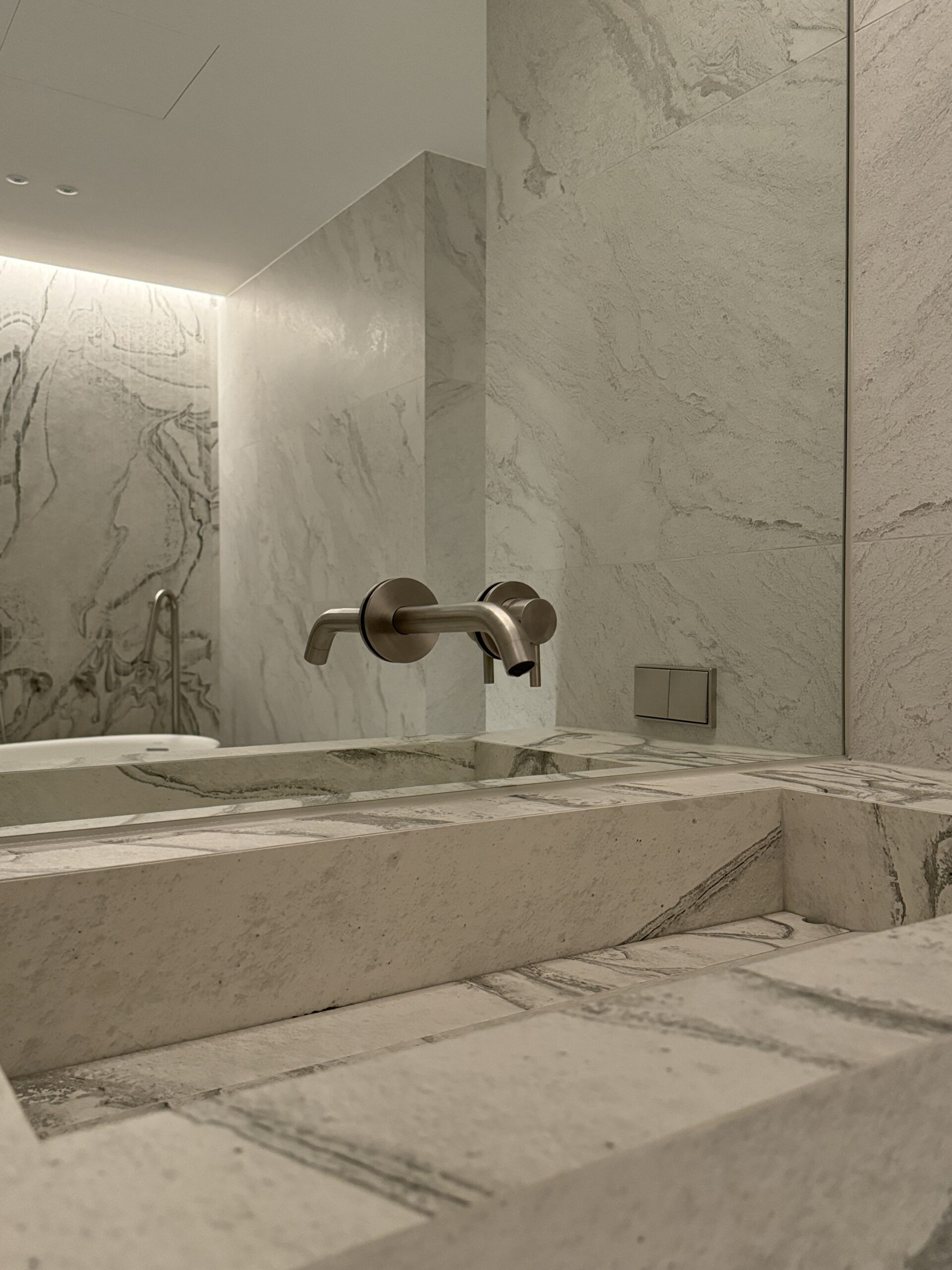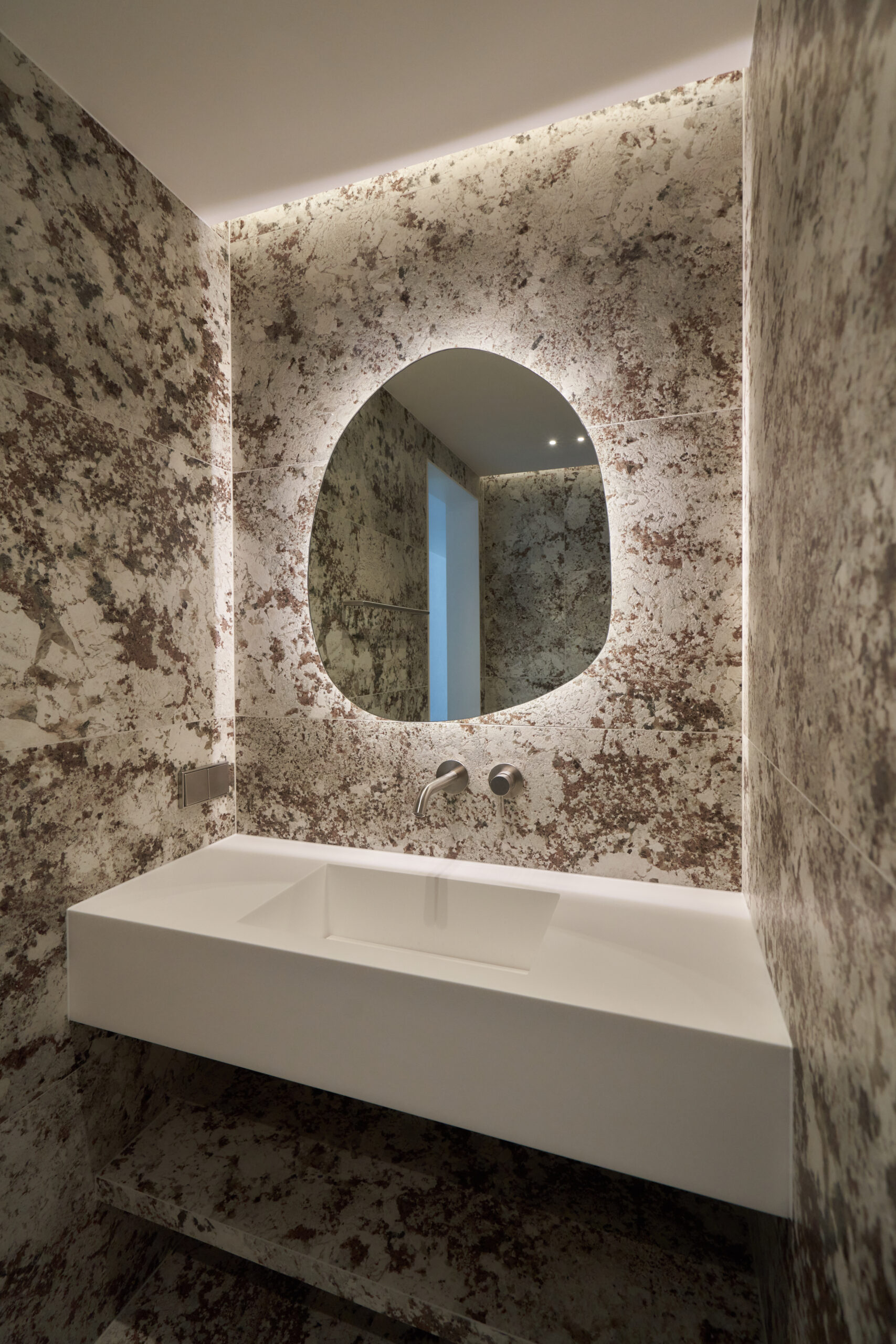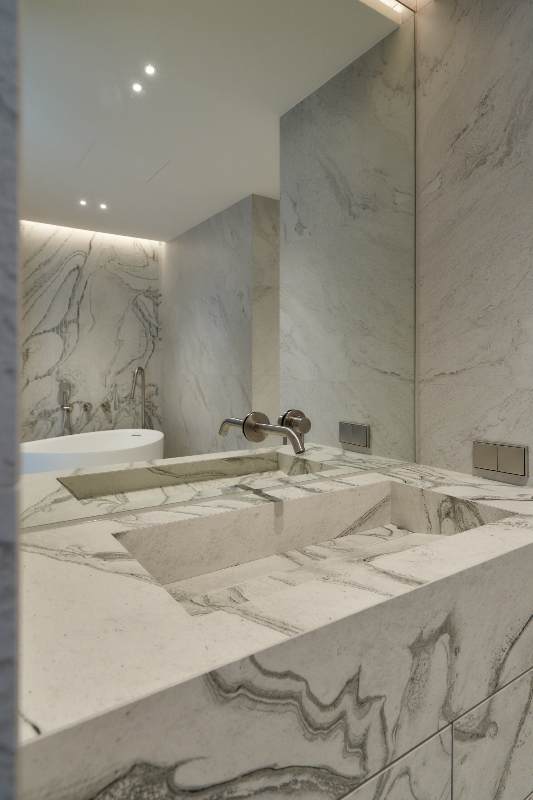 불필요한 요소는 과감히 덜어내고 수납과 기능에 충실한 디자인을 바탕으로, 타일 바닥을 적용해 시원하고 정제된 분위기를 연출했습니다. 주상복합 구조 특유의 제한적인 전용면적을 극복하기 위해 안방과 거실 사이에는 투명과 불투명 전환이 가능한 특수 글라스를 적용해 공간을 분리하거나 하나로 확장할 수 있는 가변성을 부여했으며, 절제된 구성 속에서 사용성과 공간 효율을 극대화하는 ‘미니멈 속의 맥시멈’을 구현했습니다.