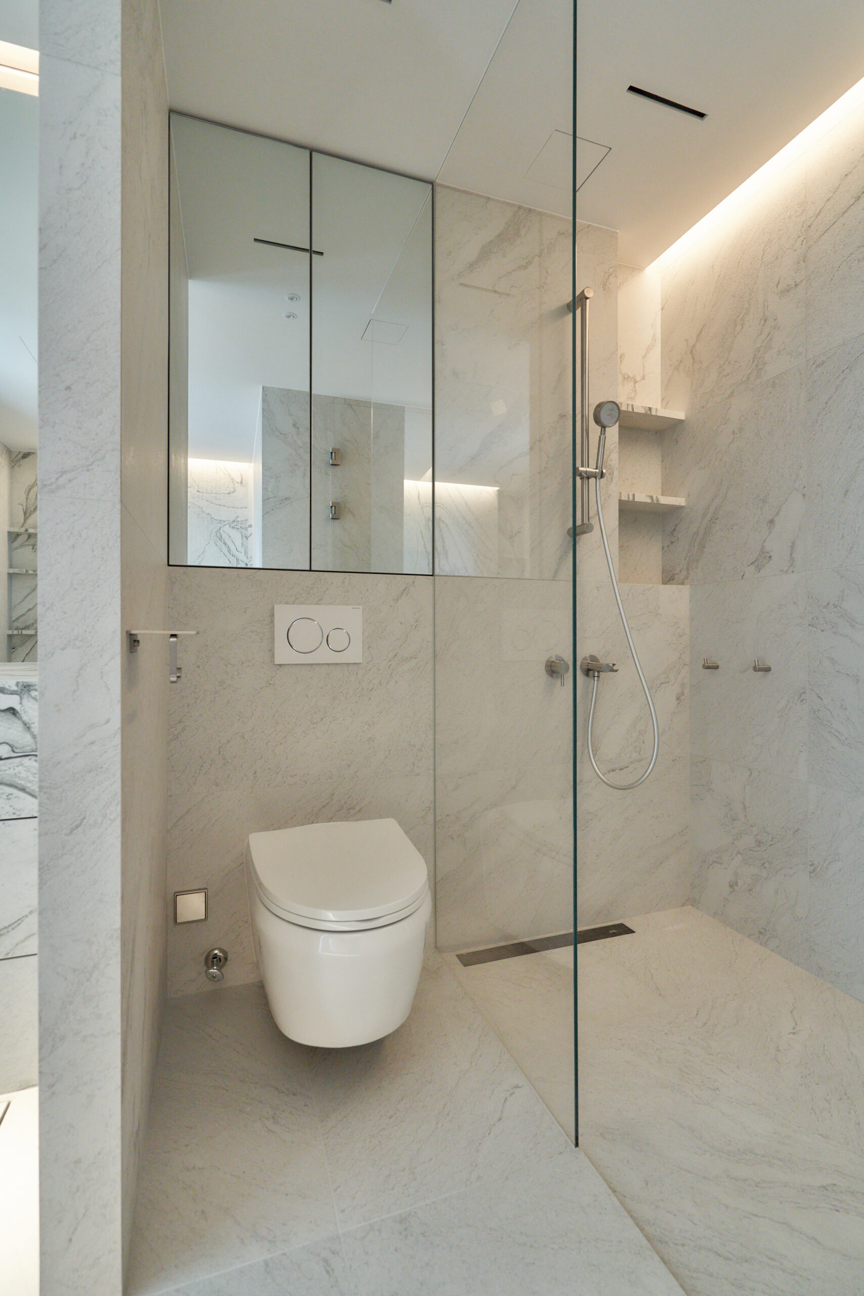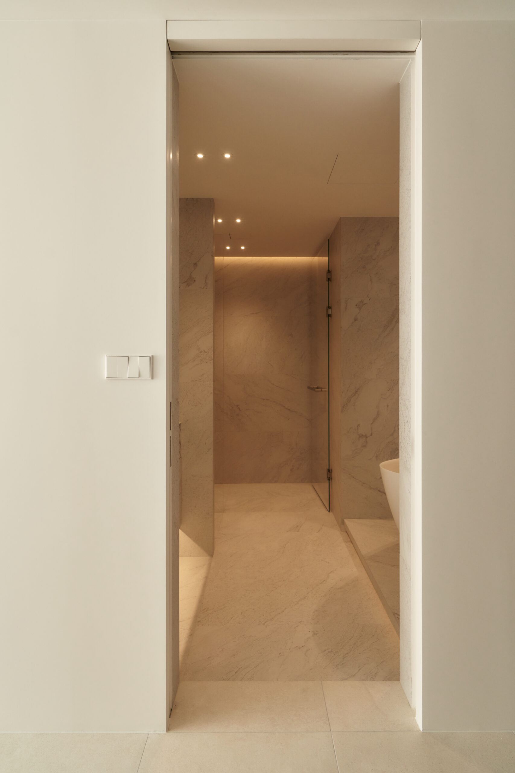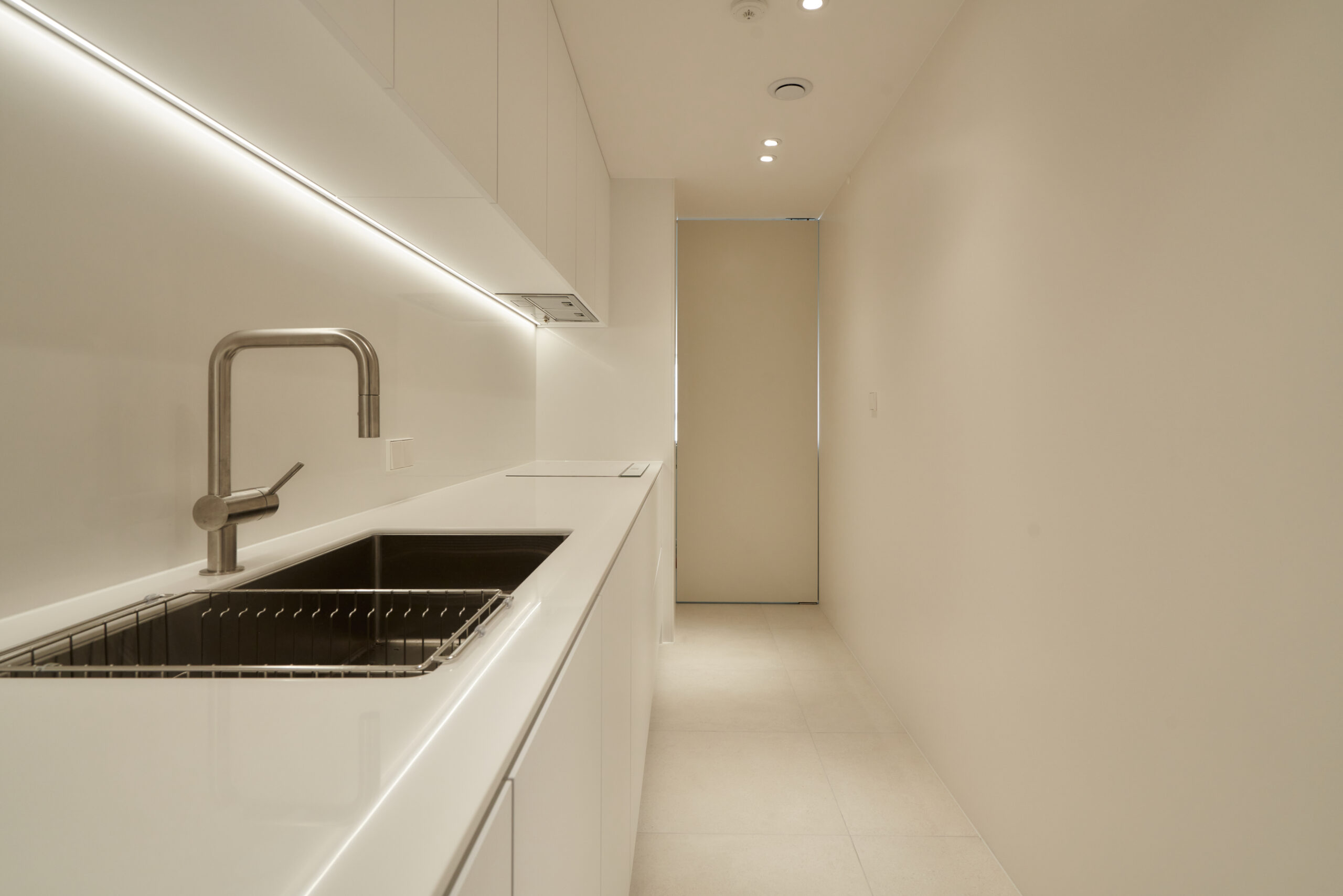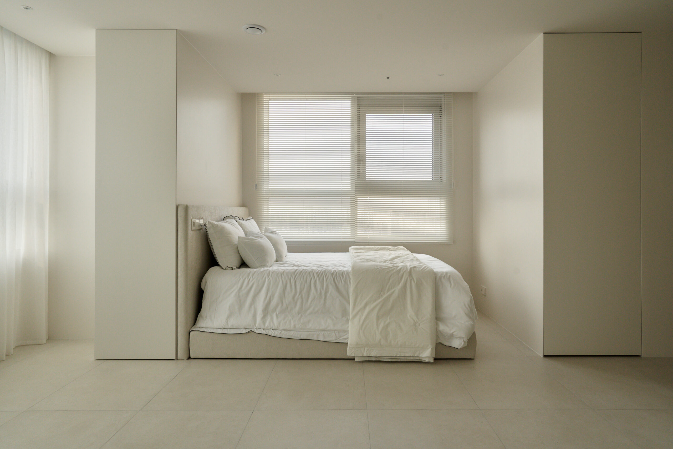 By removing unnecessary elements and focusing on storage and function, the design uses tile flooring for a cool, refined mood and adjustable glass between the bedroom and living area to create flexible spatial use realizing a “maximum within minimum” approach.