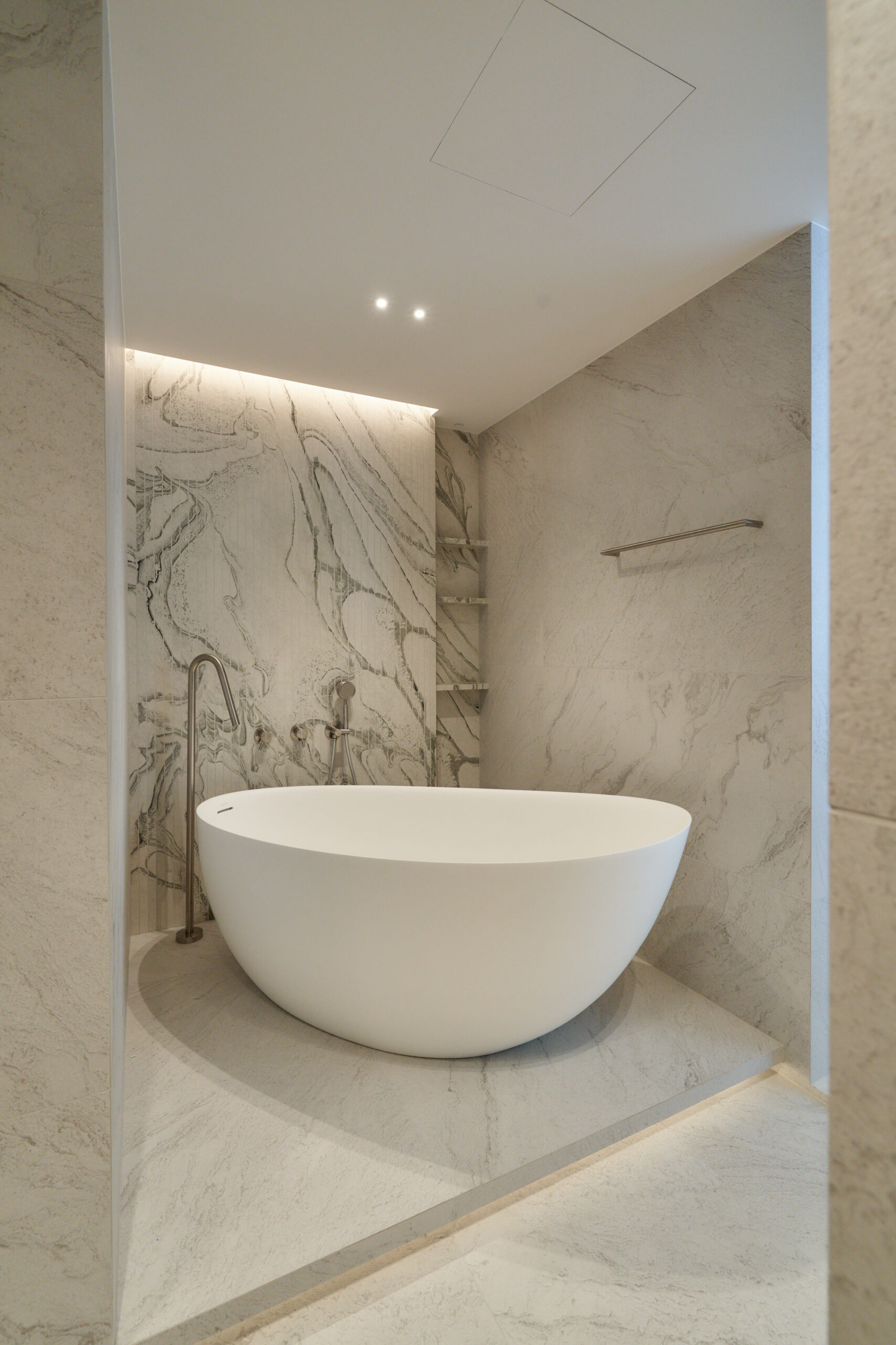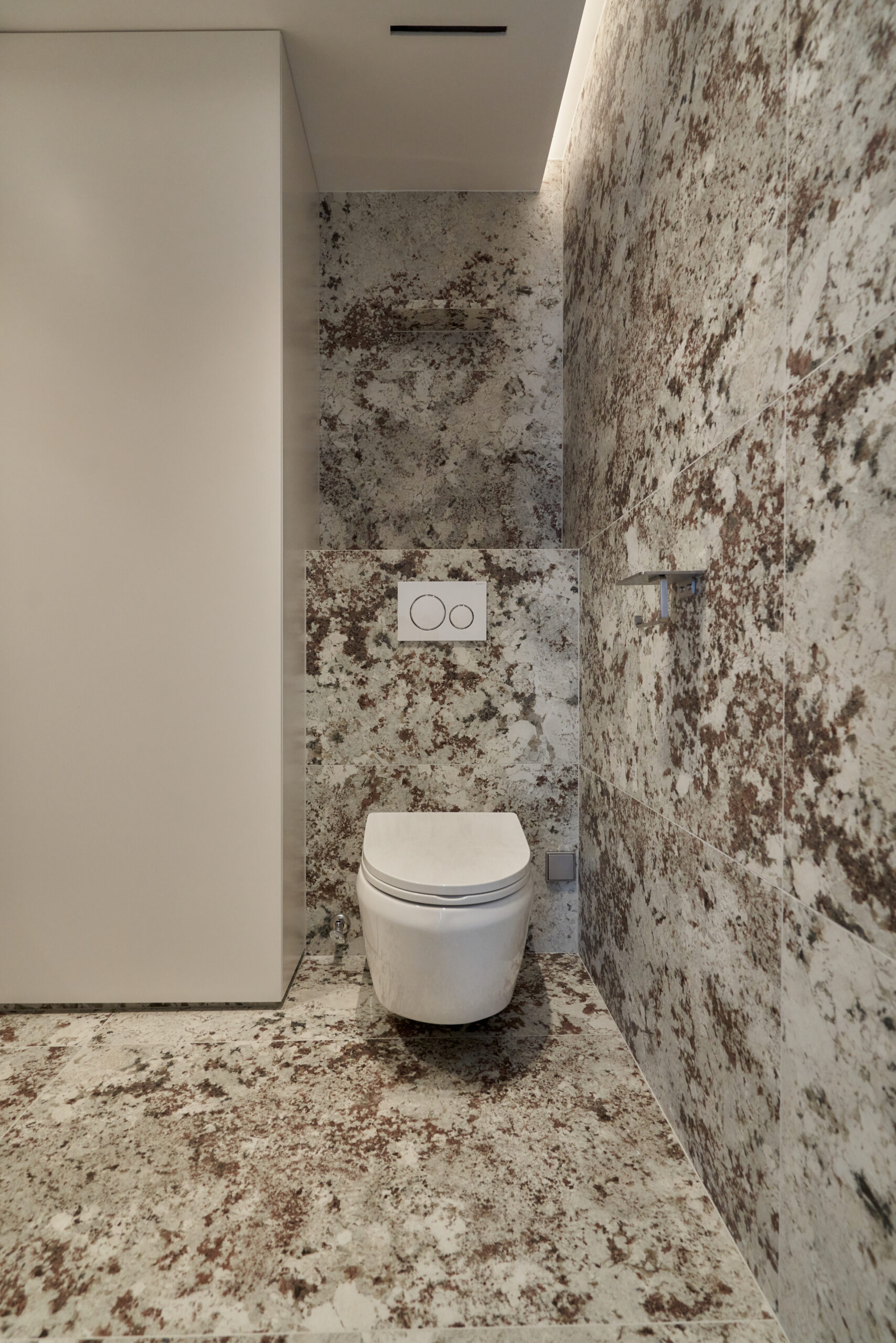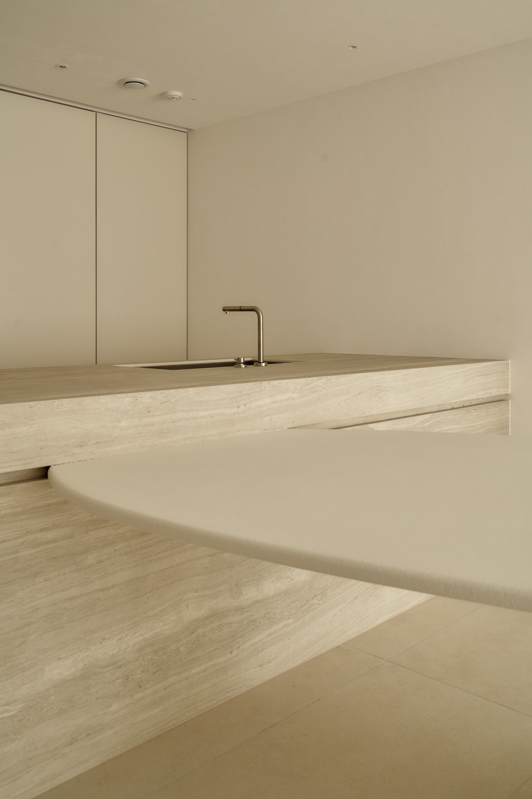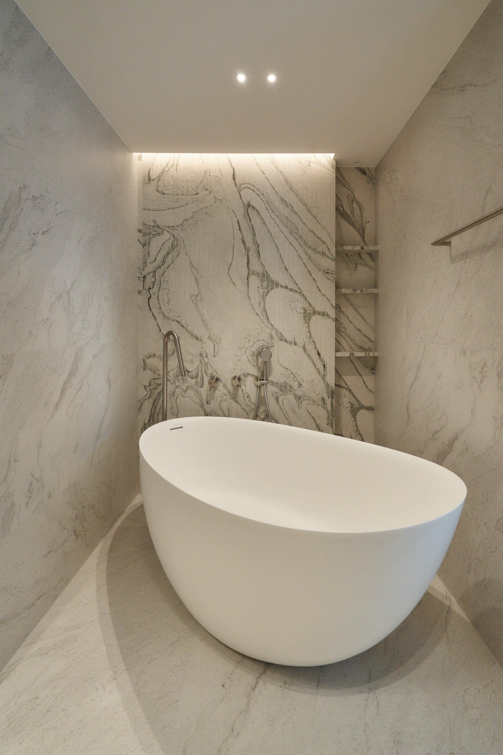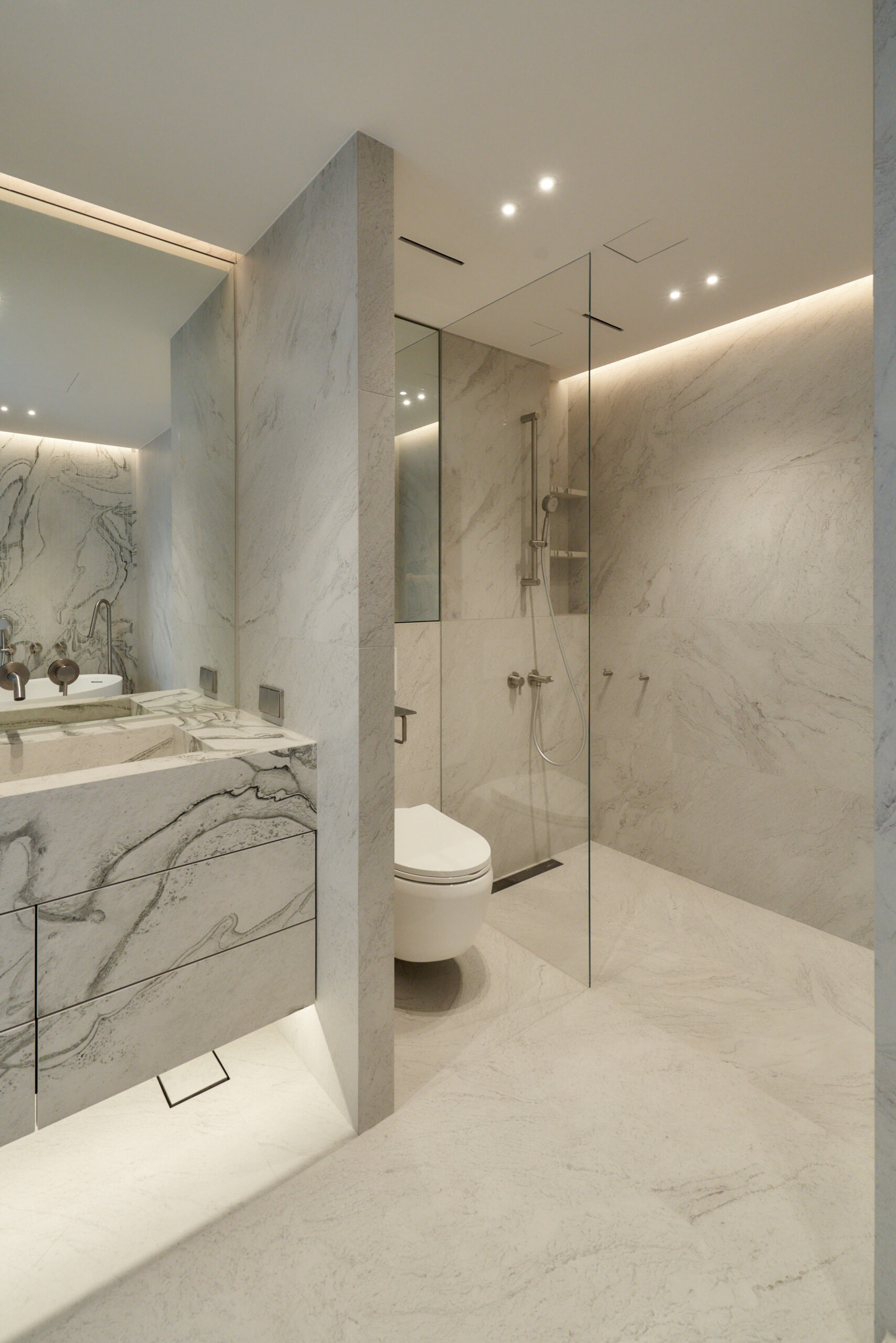 By removing unnecessary elements and focusing on storage and function, the design uses tile flooring for a cool, refined mood and adjustable glass between the bedroom and living area to create flexible spatial use realizing a “maximum within minimum” approach.